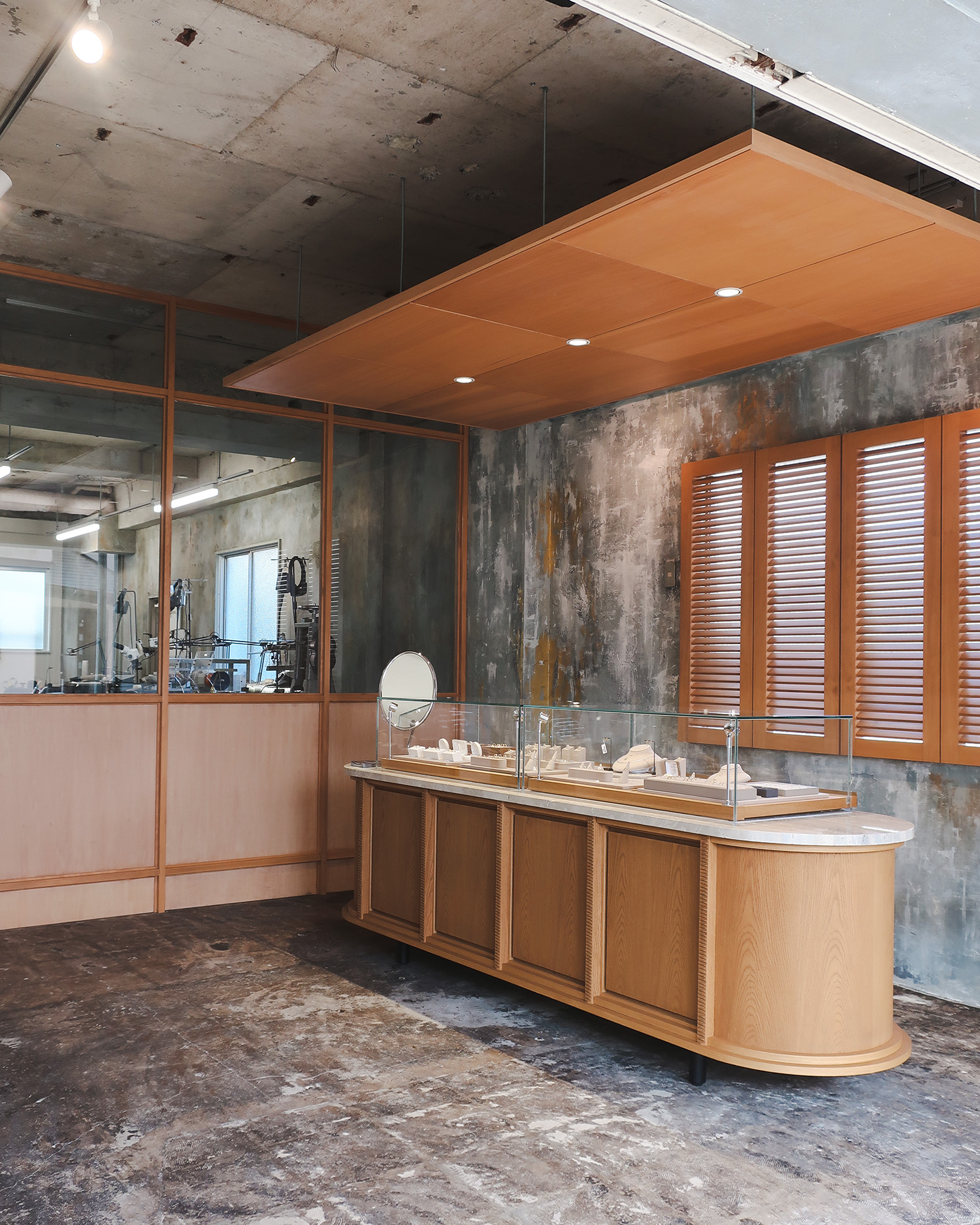 ブランドの世界観を体現するショップ。奥のガラス面を一枚隔てたすぐ奥に、アトリエを併設。
