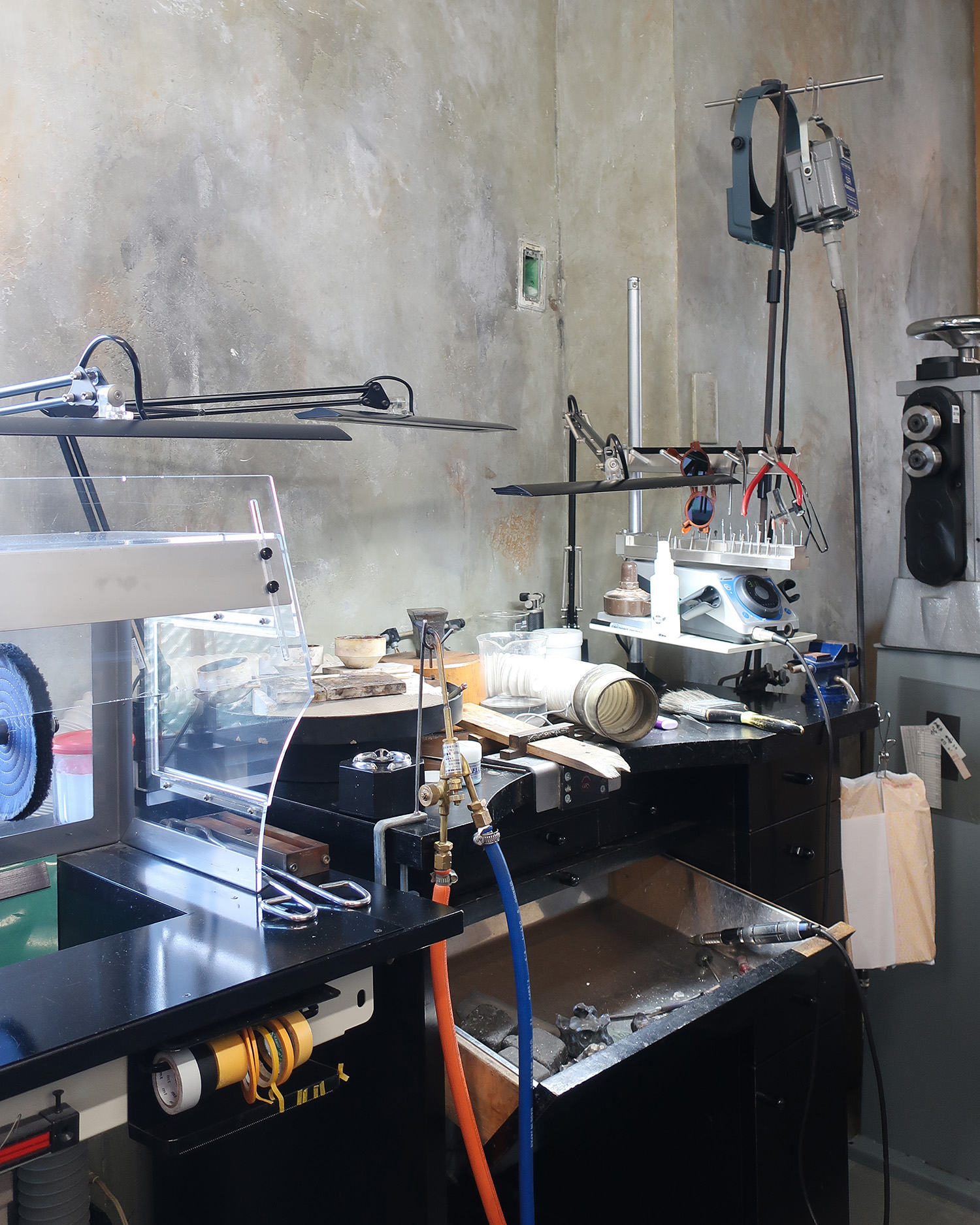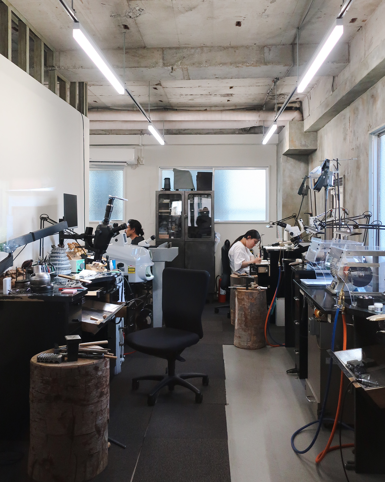 彫金の機械や工具が整然と並ぶ、ラボのようなGICLATのアトリエ。