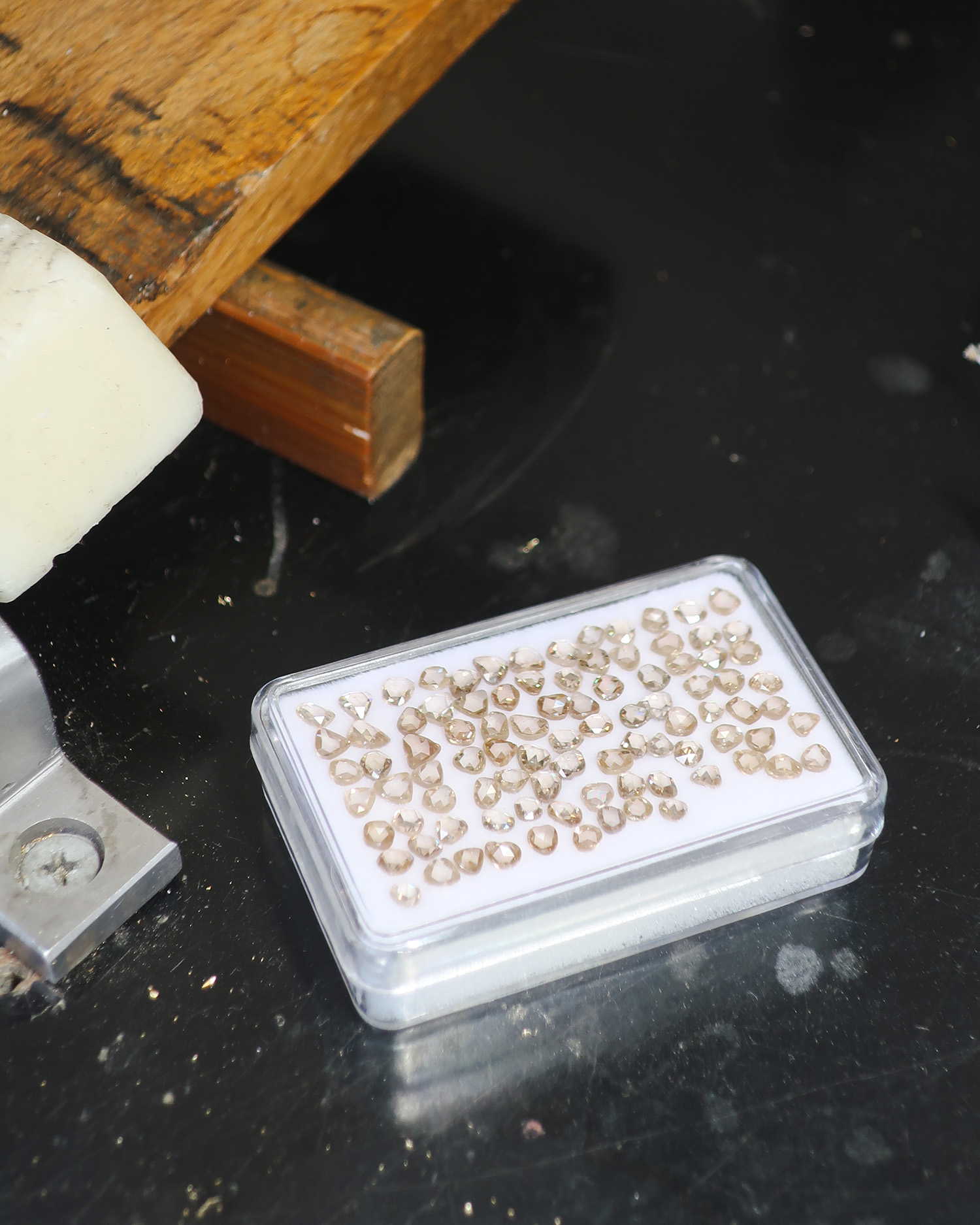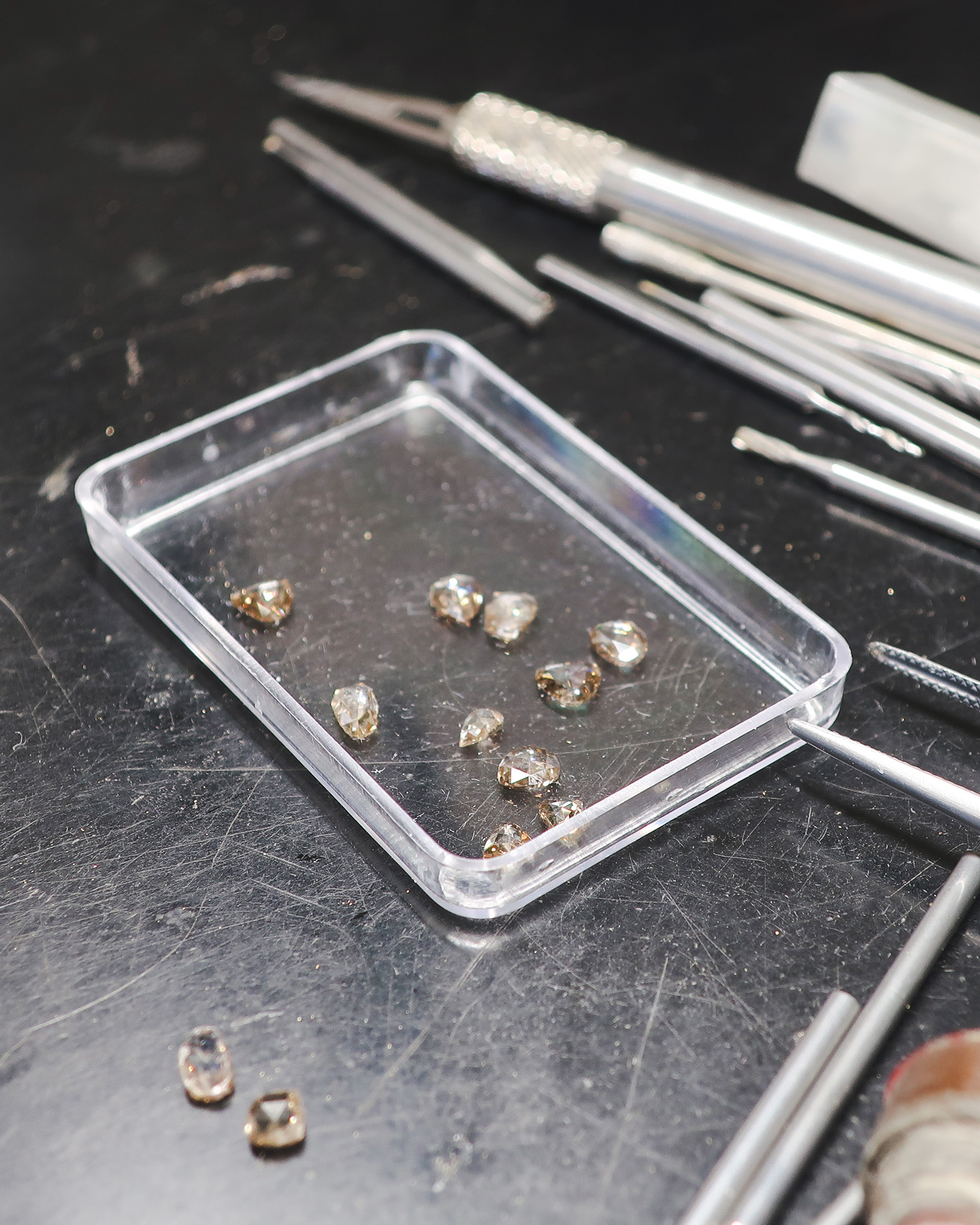 麦倉氏の素材へのこだわりは徹底している。18Kはマットな質感やホワイトゴールドとのコンビネーションで、ダイヤモンドの輝きがいっそう引き立つよう配合を工夫。一点物の場合、ダイヤは均一なものではなく、あえて形に癖のある石を選び、留めにくいものを彫留めで仕上げる。「その個体差こそ味になる」と語るように、石の表情に宿る独自性が手仕事ならではの風合いを際立たせるのだ。
