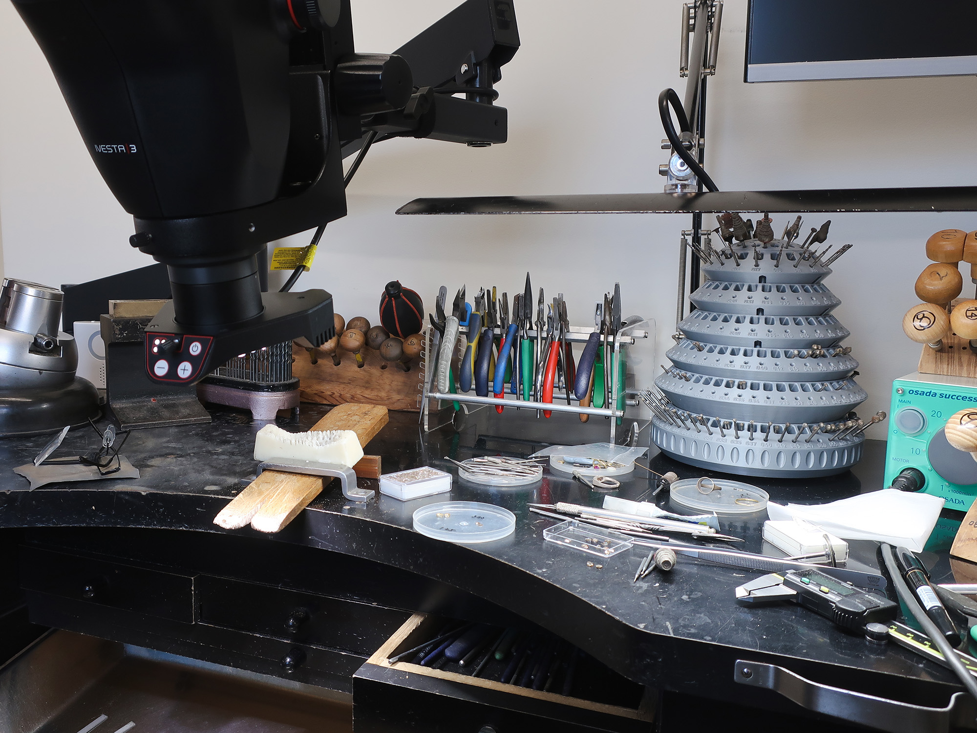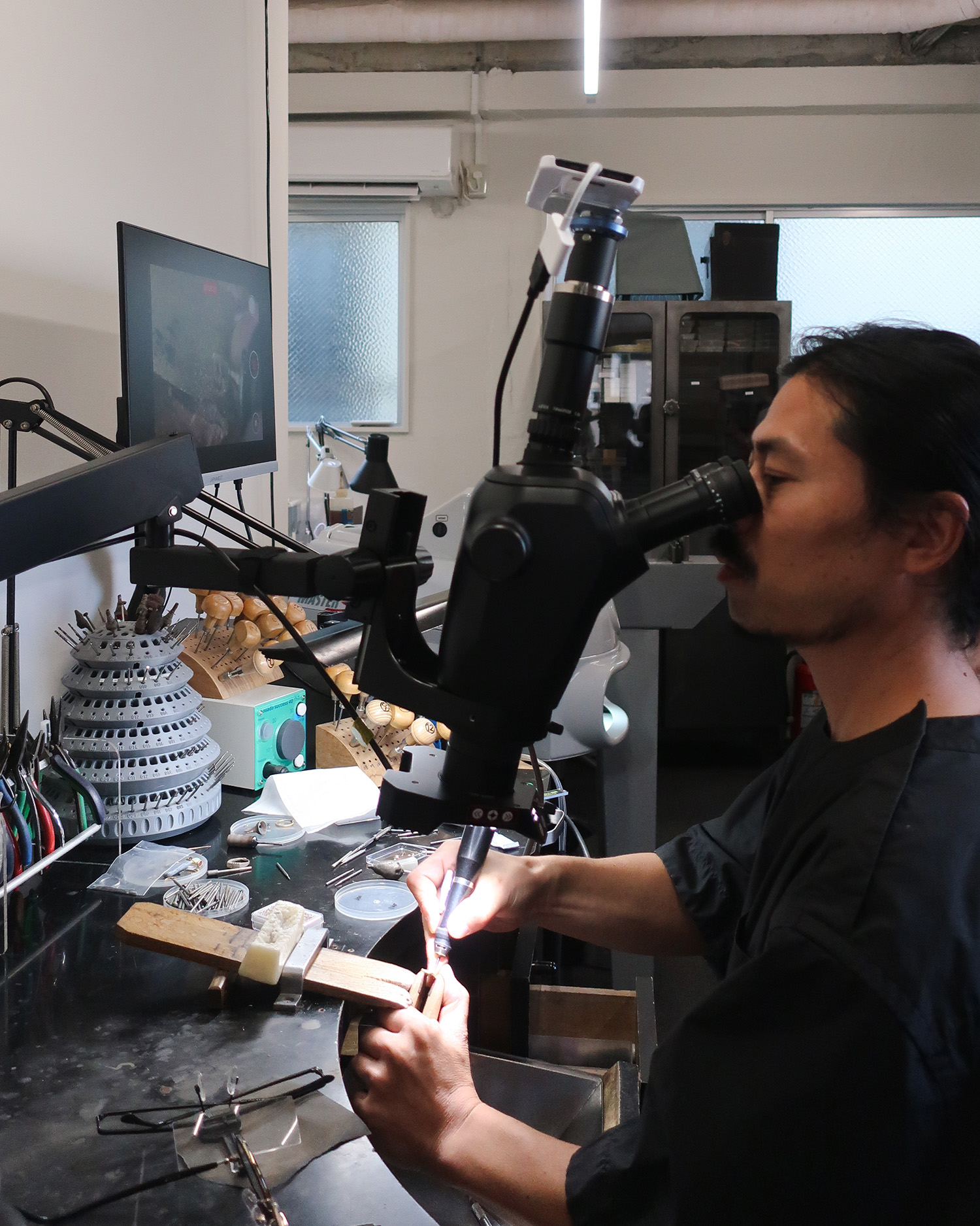 顕微鏡を使い、肉眼でも確認しながら彫金を行う。