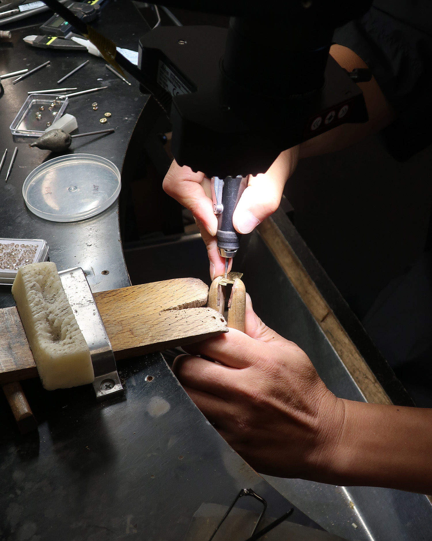 さらに、仕上げの工程まで抜かりない。「最後に石を留め、刻印を施す瞬間が一番楽しい」と、デザインを固める上での一連の崩しの作業とは対照的に、仕上げにはたっぷり手間と時間をかける。「滑(ぬめ)っとした風合いは好まないので、きっちり角を出していく」と語る麦倉氏。素材がベストな状態で収まり、形も留めも理想通りに仕上がったとき、石が一斉に光り出すように見えるという。