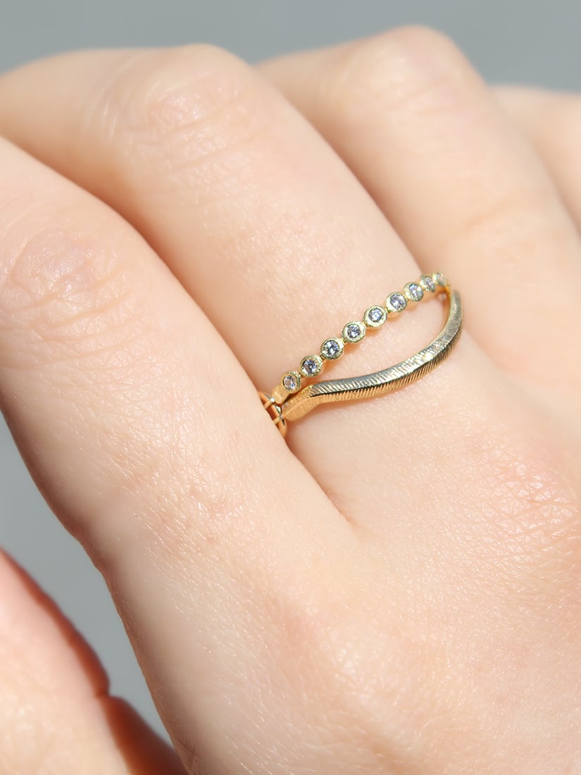 このリング誕生のきっかけは10年ほど前、麦倉氏がGICLATをスタートして間もない頃に遡る。当時、複数のパターンにアレンジ可能なリングのデザインを考えていた時に思い付いたもので、丸カンで繋がったそれぞれのパーツをパタパタと倒すように動かすことで、異なるデザインを何通りも楽しめる。最初は一点物として、2種類のデザインを組み込んだリングが制作されたが、「drama H.P.FRANCE」のスタッフたちの記憶に残り、過去には何度か別注イベントも開催された。