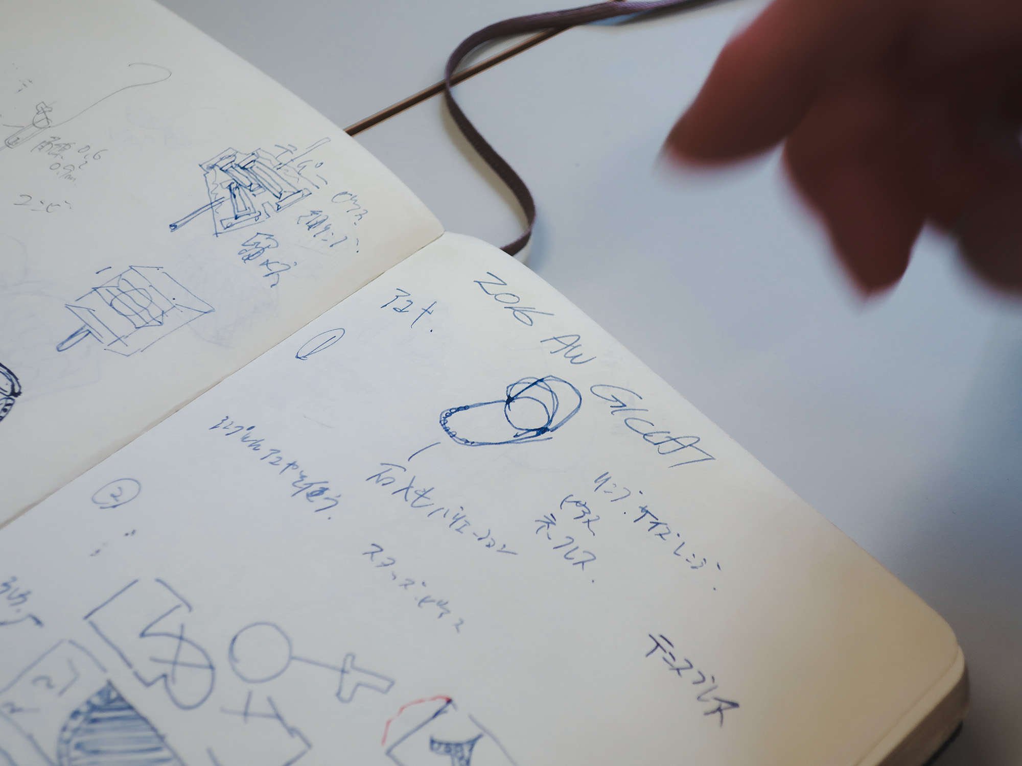 麦倉氏がブランド設立当初から少しずつ書き留めているネタ帳。ふと思いついたこと、石の使い方、留め方の楽しいアイディアなどをメモして、後々デザインに起していく。写真のページでは、パタパタリングの元となったデザインを発見。