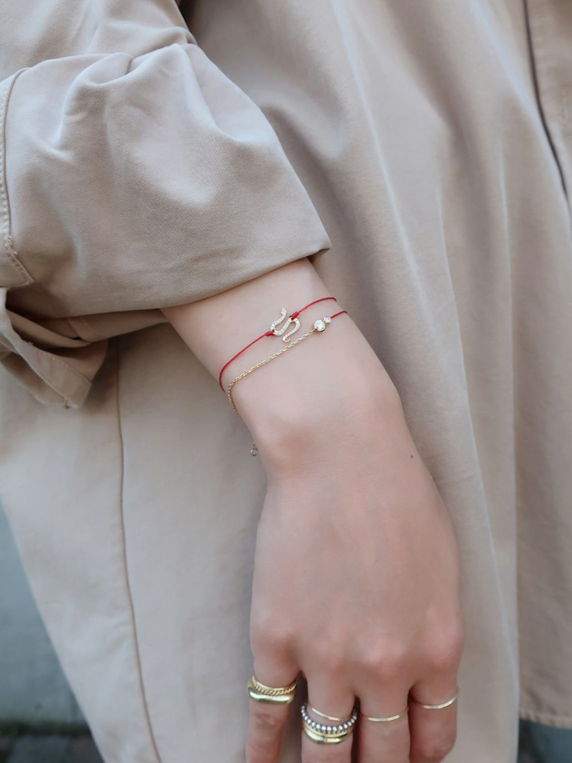 ベージュのシャツに映える、しなやかなレッドコードのレイヤード。幸運のシンボル・ヘビモチーフと、無限大を表すインフィニティダイヤモンドのコンビネーションが、情熱と静かな強さを宿し、あなただけのお守りジュエリーに。