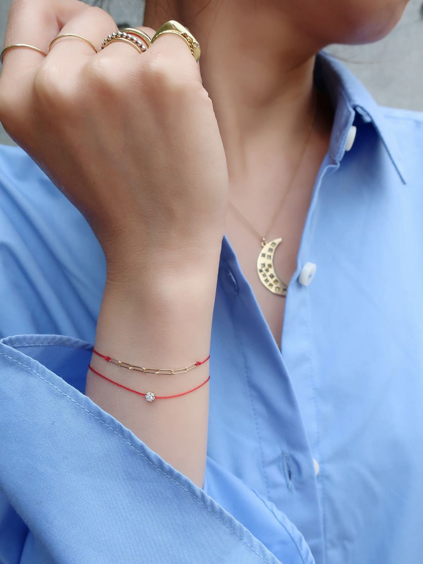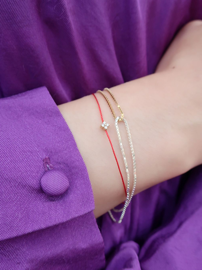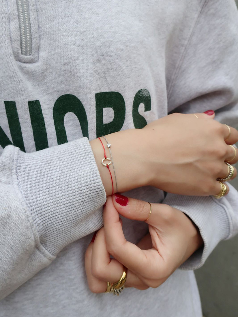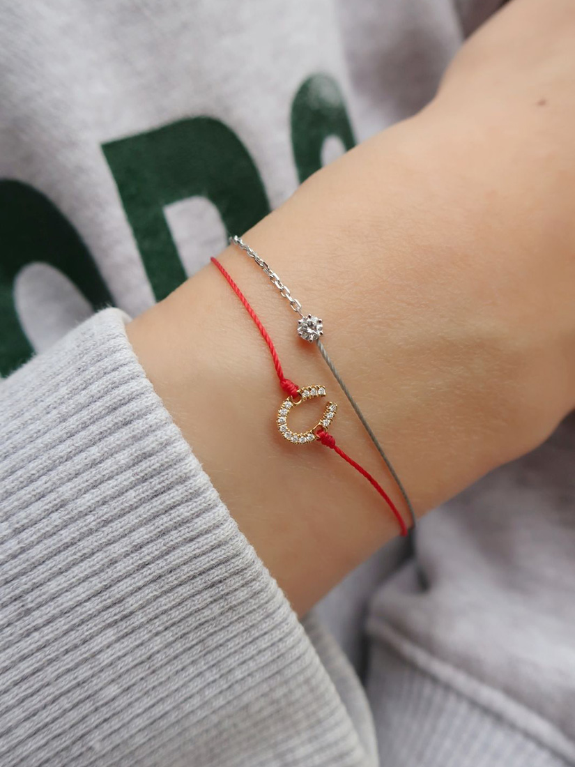 スウェットに映えるラフで軽やかなレイヤード。赤いコードの馬蹄モチーフが、手元に幸運のきらめきを添えます。グレーの糸に光るホワイトゴールドのチェーン、一粒のダイヤモンドが、上品な大人の抜け感をプラス。