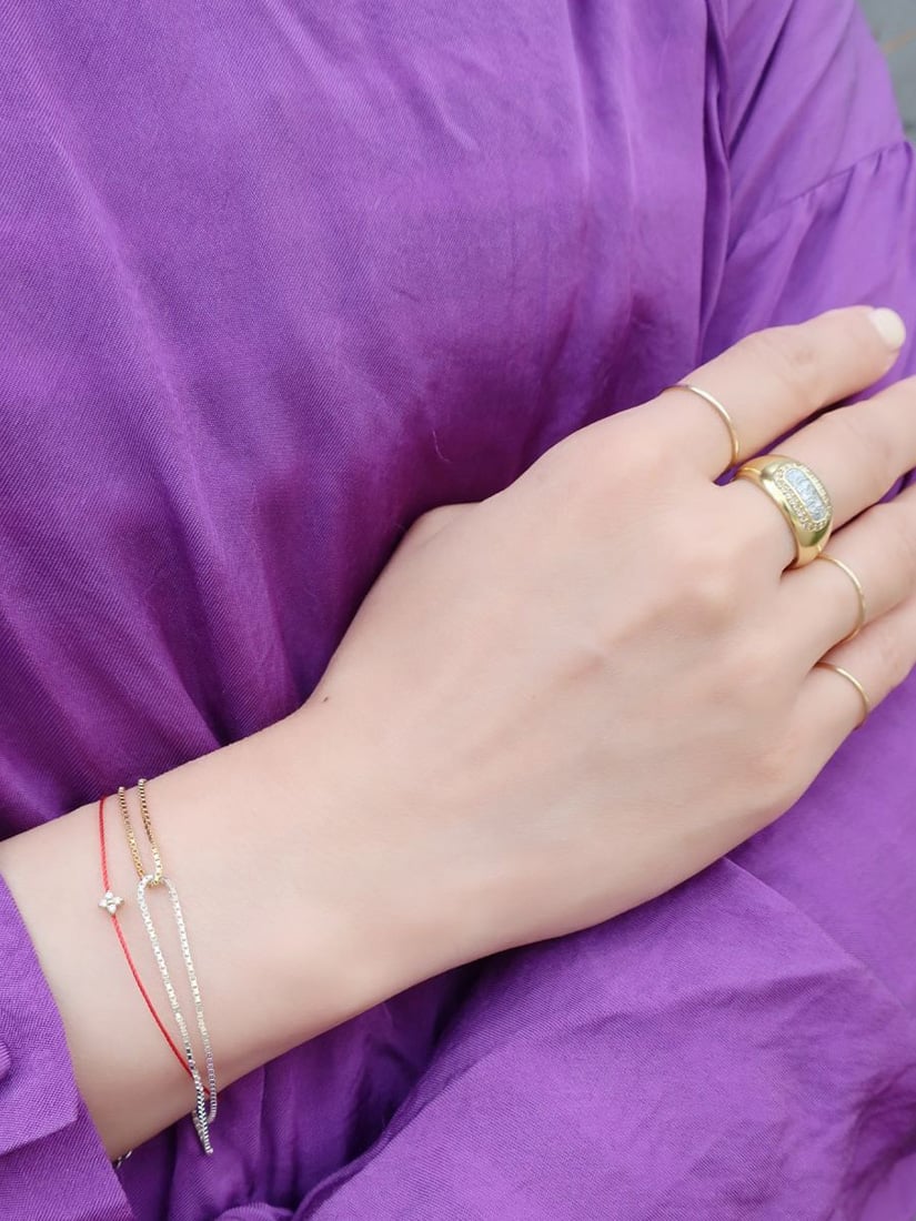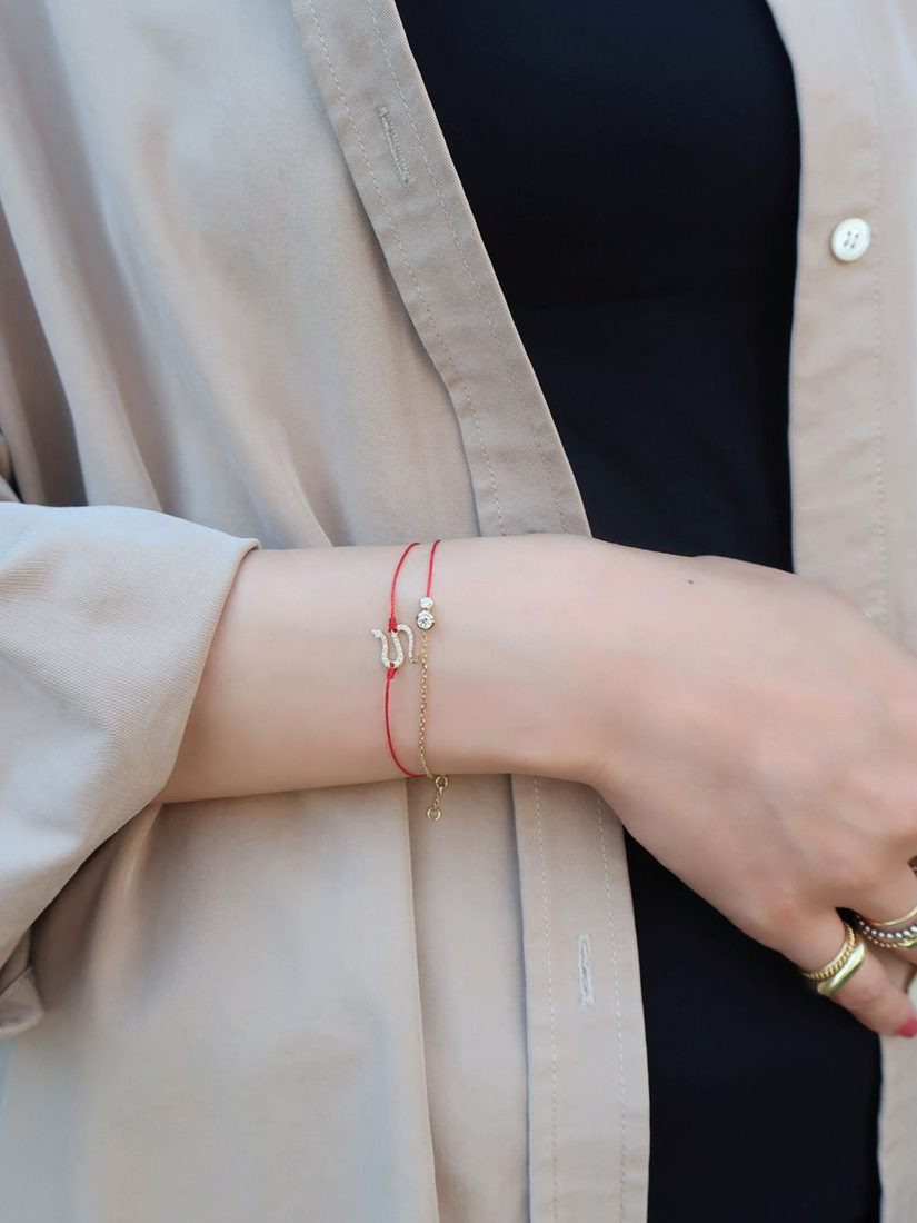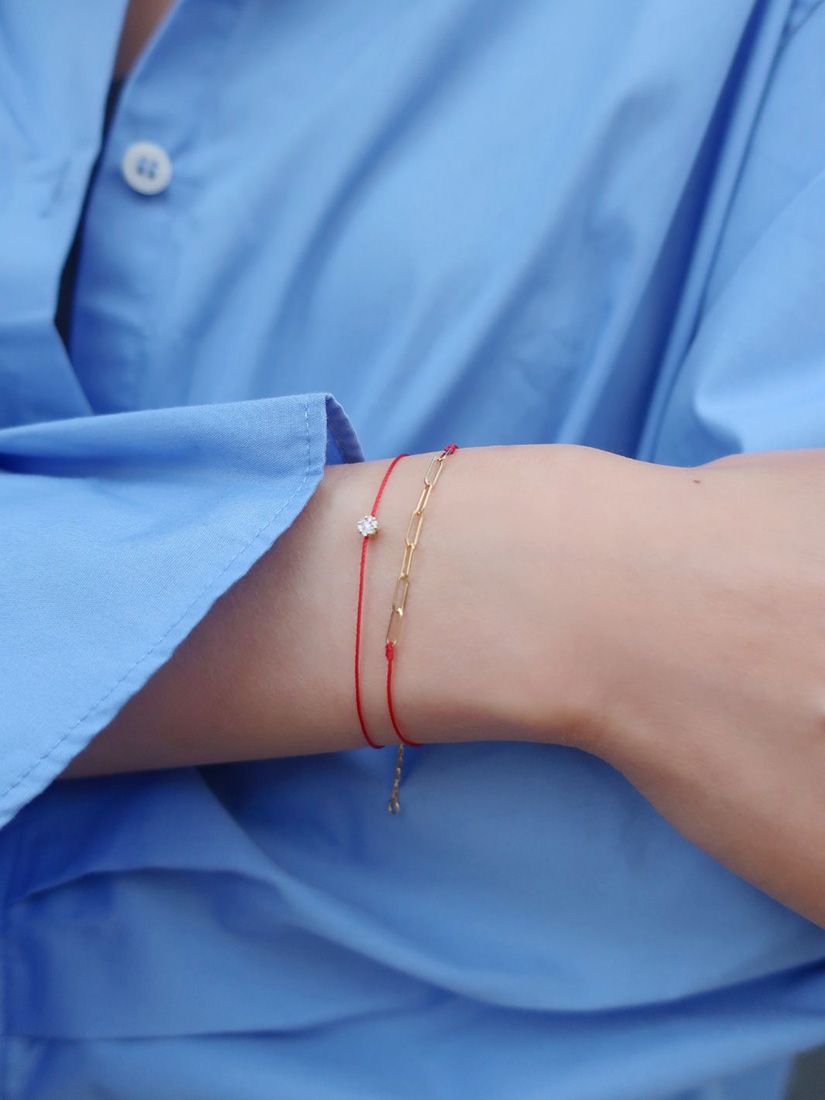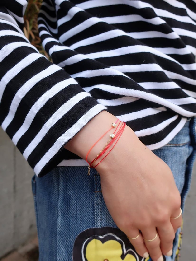 スウェットに映えるラフで軽やかなレイヤード。赤いコードの馬蹄モチーフが、手元に幸運のきらめきを添えます。グレーの糸に光るホワイトゴールドのチェーン、一粒のダイヤモンドが、上品な大人の抜け感をプラス。