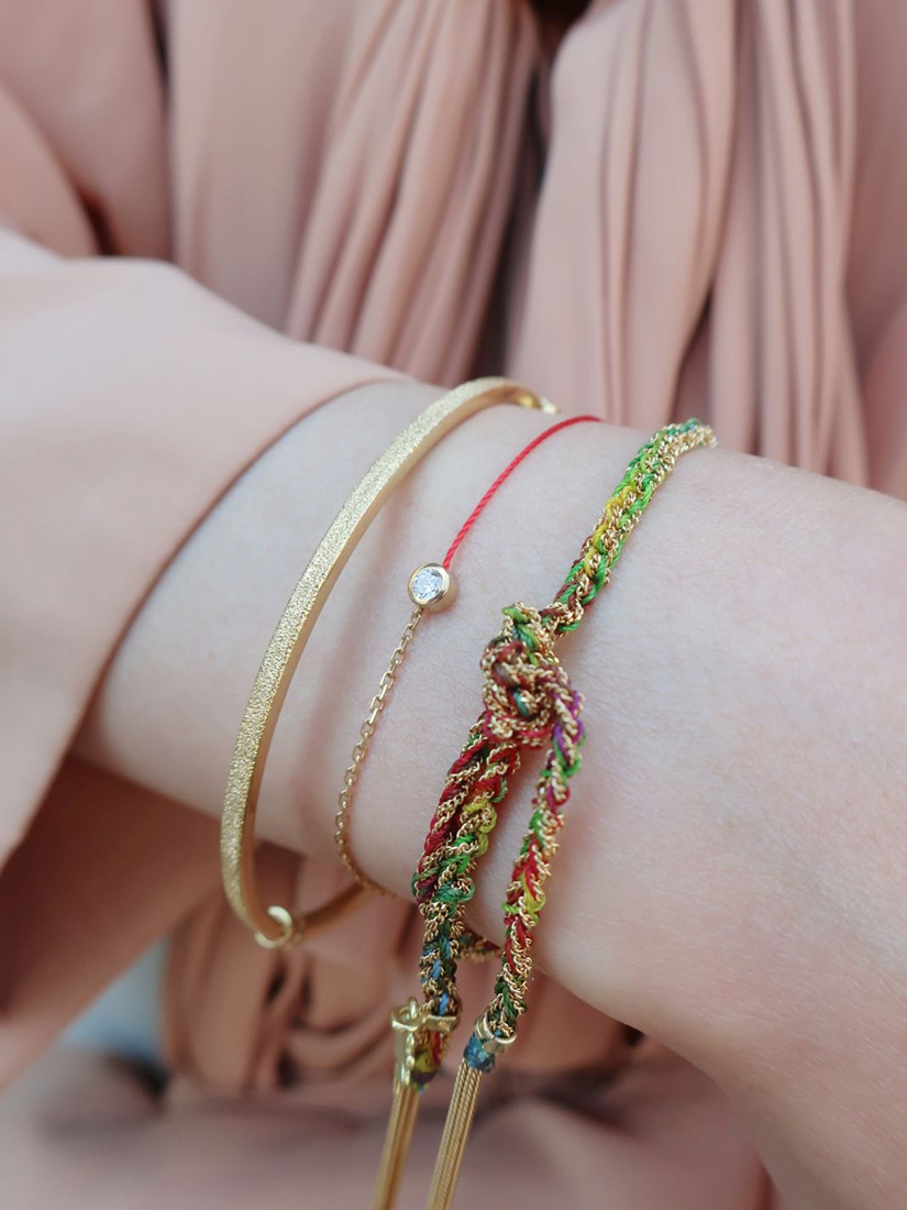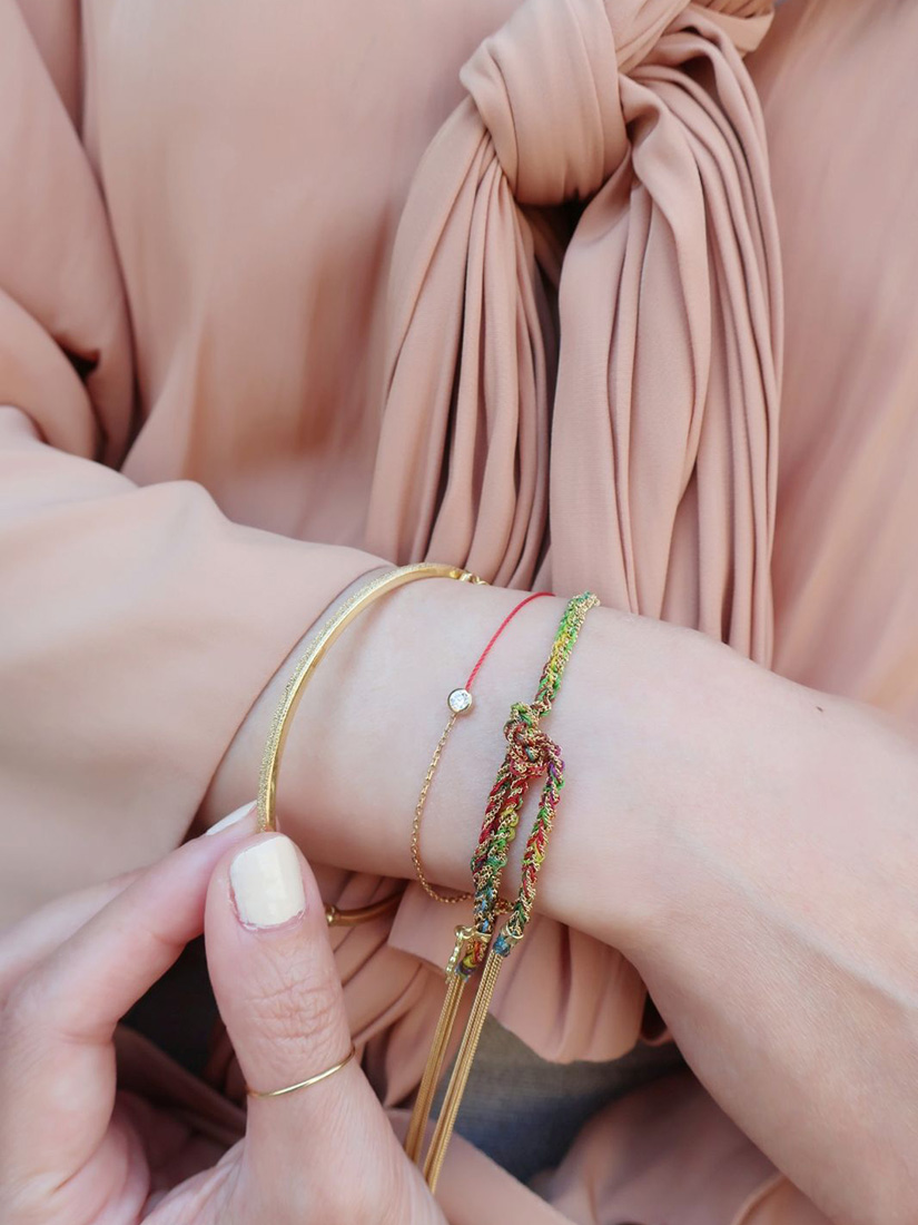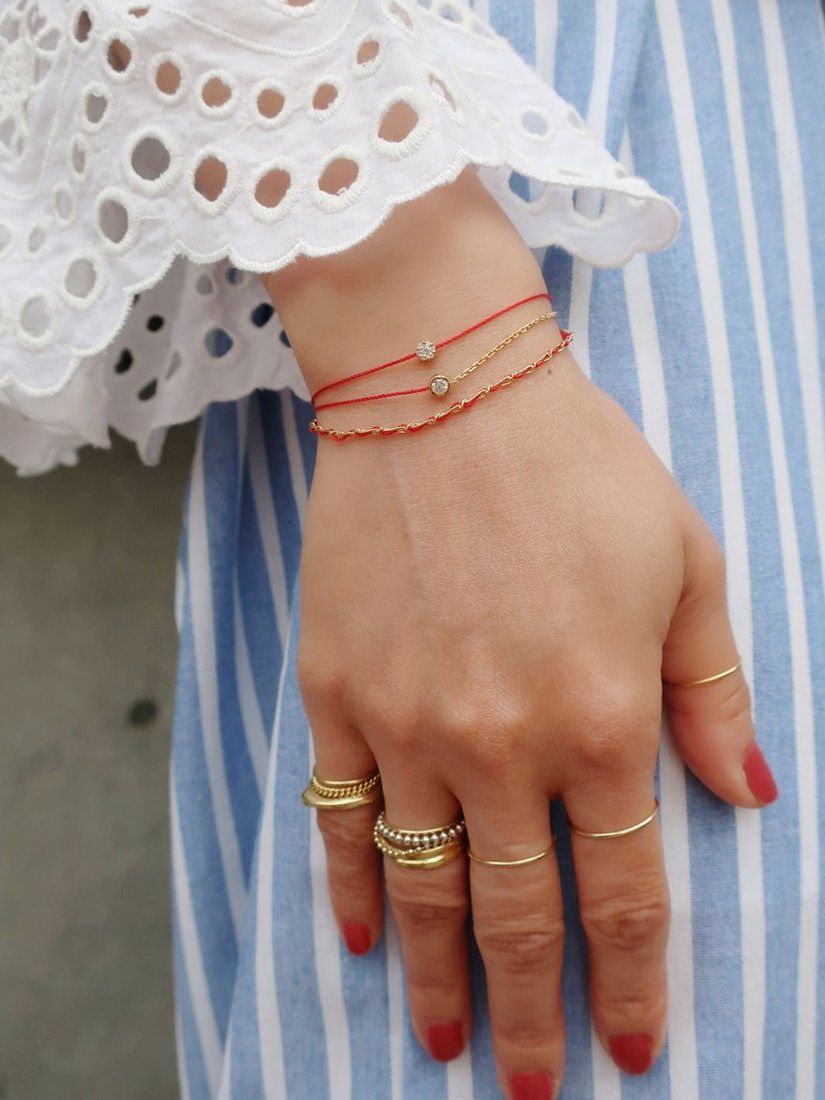 ベージュカラーのブラウスになじむ赤いコードが、手元の主役。レインボーカラーのミサンガやスパークルに輝くバングルを重ねて、Redlineの赤いコードをいちばん美しく見せるスタイルが完成。
