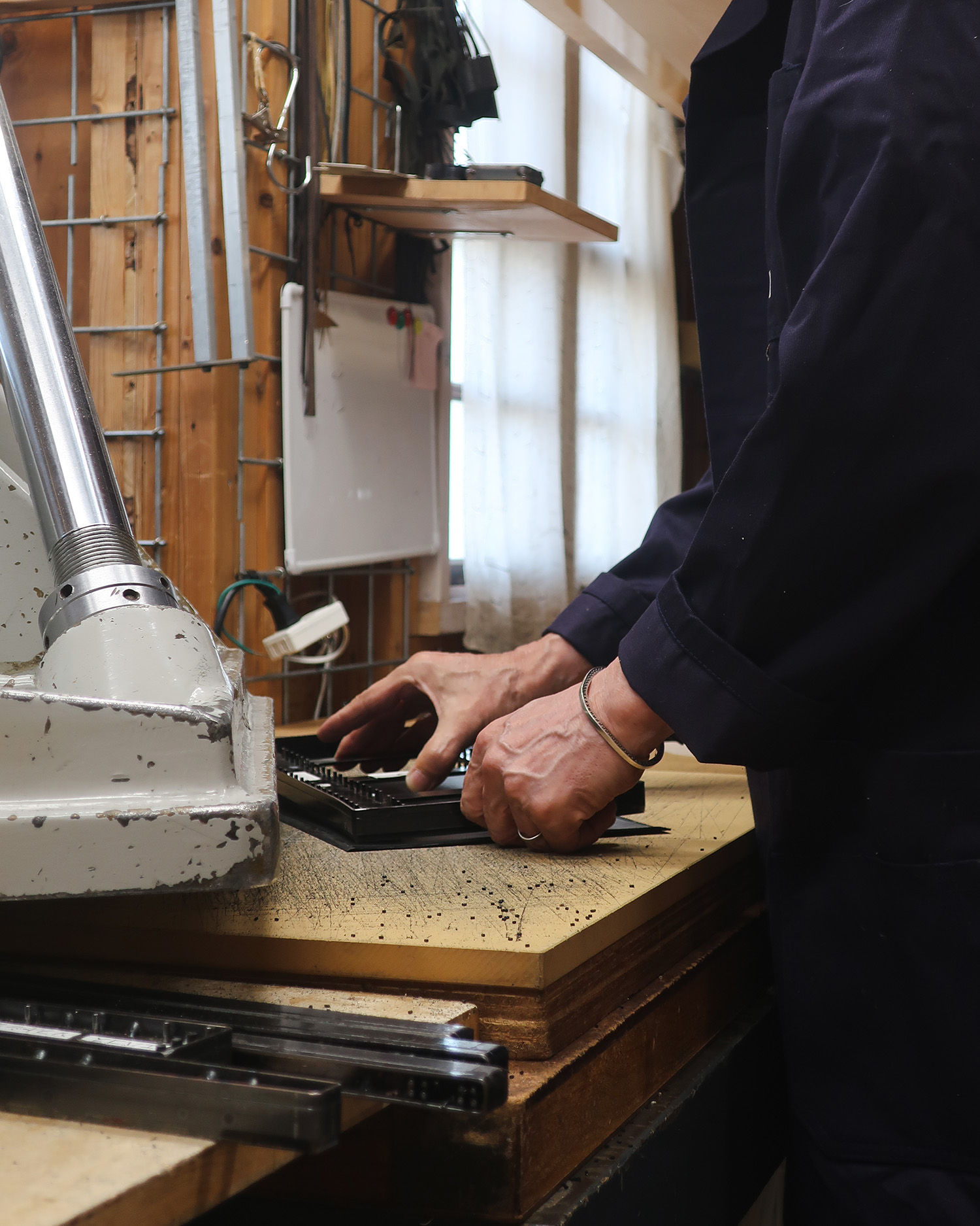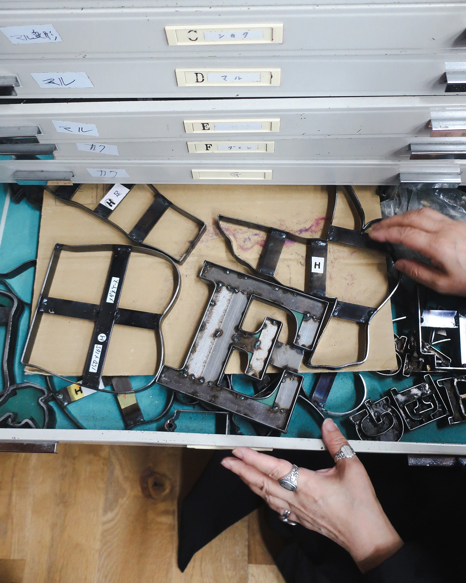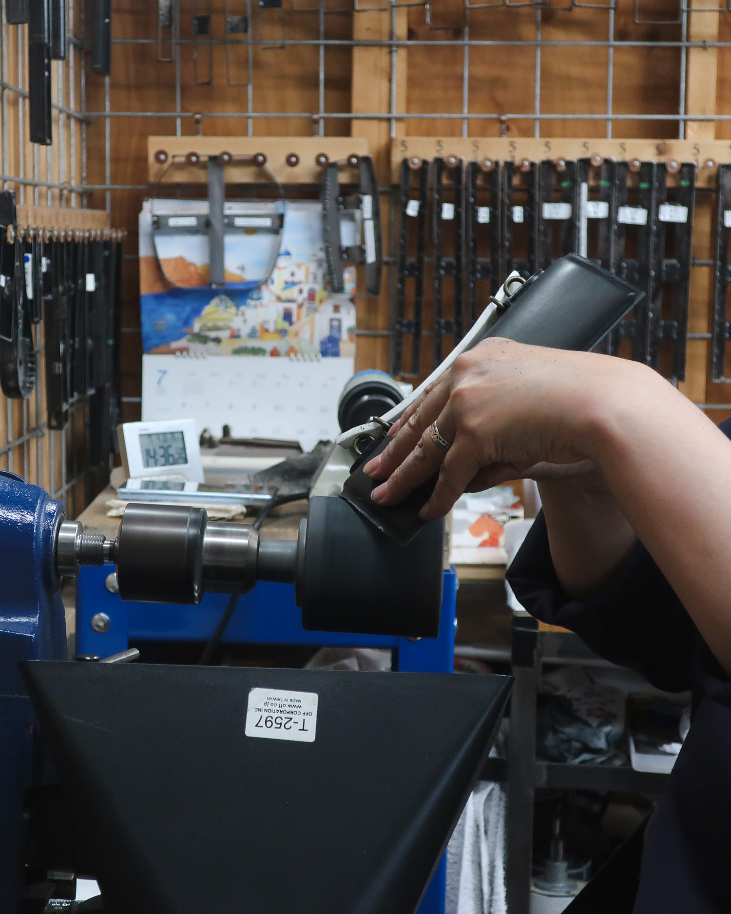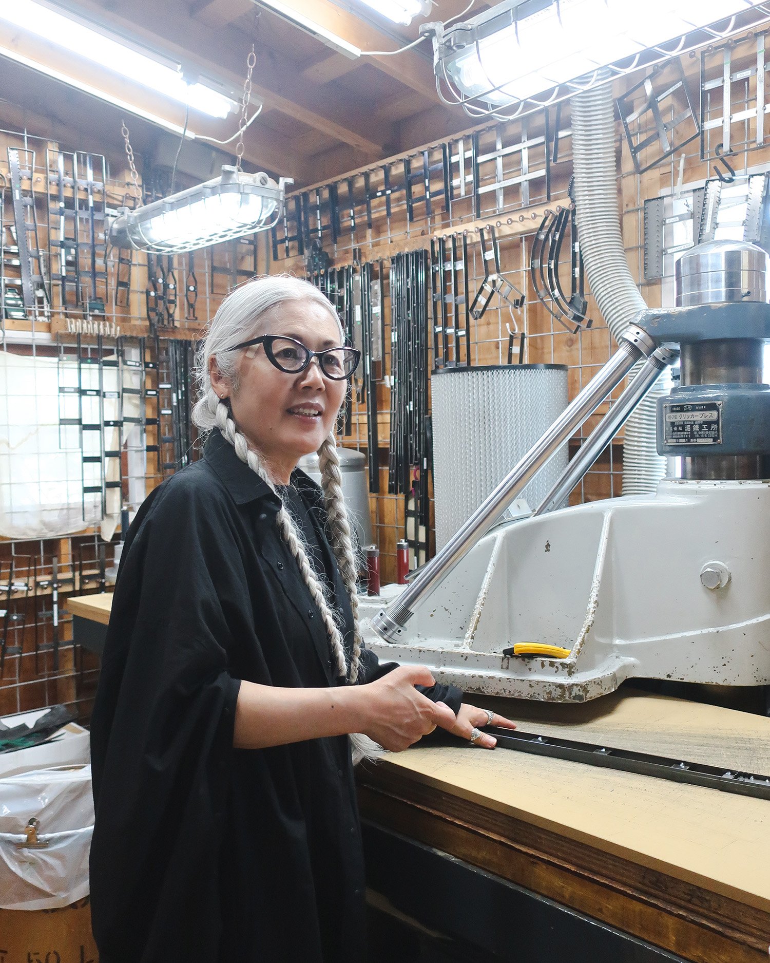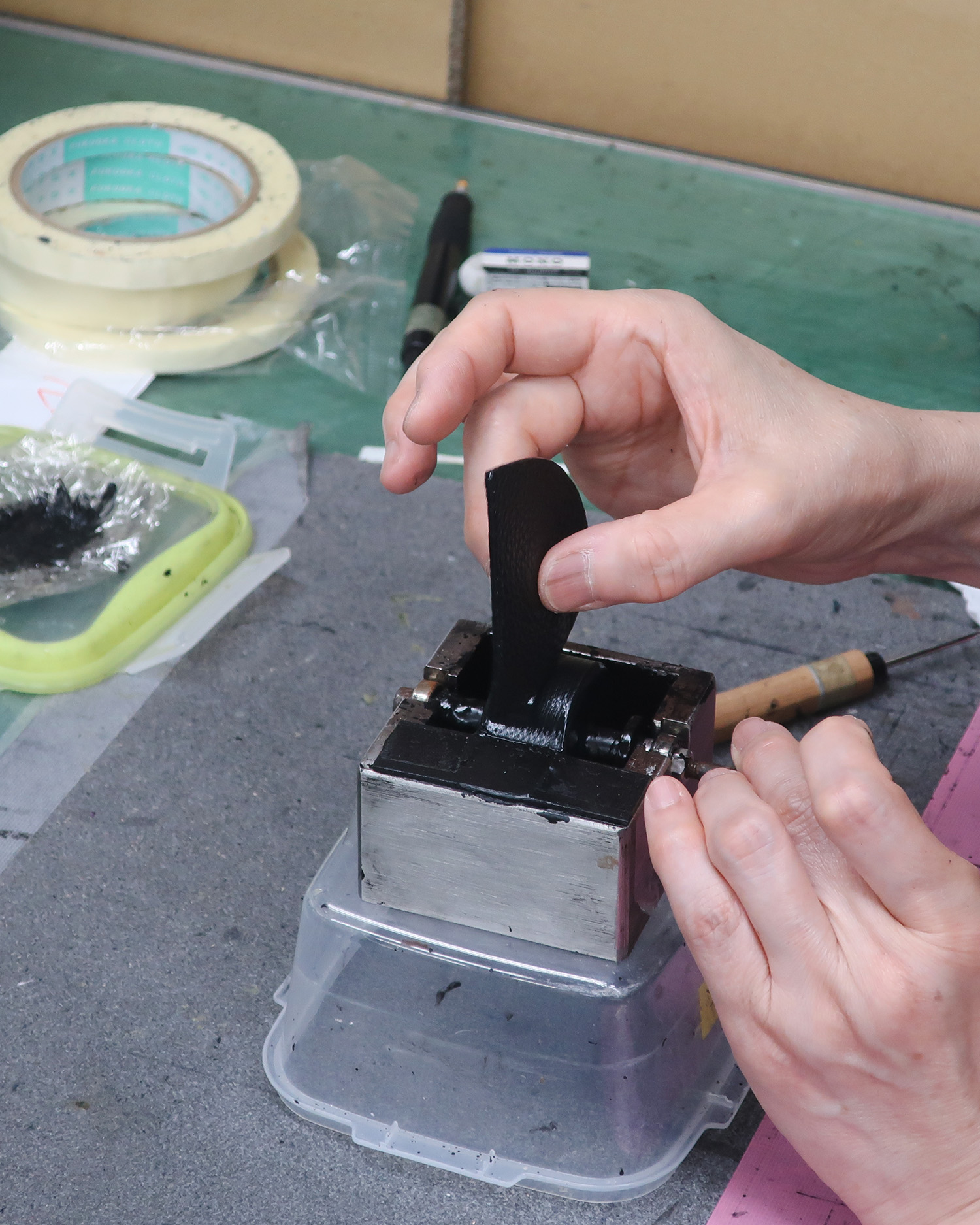 一つのバッグが完成するまで、eb.a.gosのチーム内では何度も会議が開かれる。文鎮のような重いものを入れて持ってみたり、色々な持ち方を試したり、飾りのパーツが使い手にとって邪魔にならないかを検証したりと、使いやすさや使い心地を追求していく。さらに、一度完成した商品であっても経年変化や強度を見ながら、改良が重ねられている。シーズンごとに微調整を加えていく作業も、アトリエと工場が同じ場所にあるからこそ叶うこだわりの部分だ。