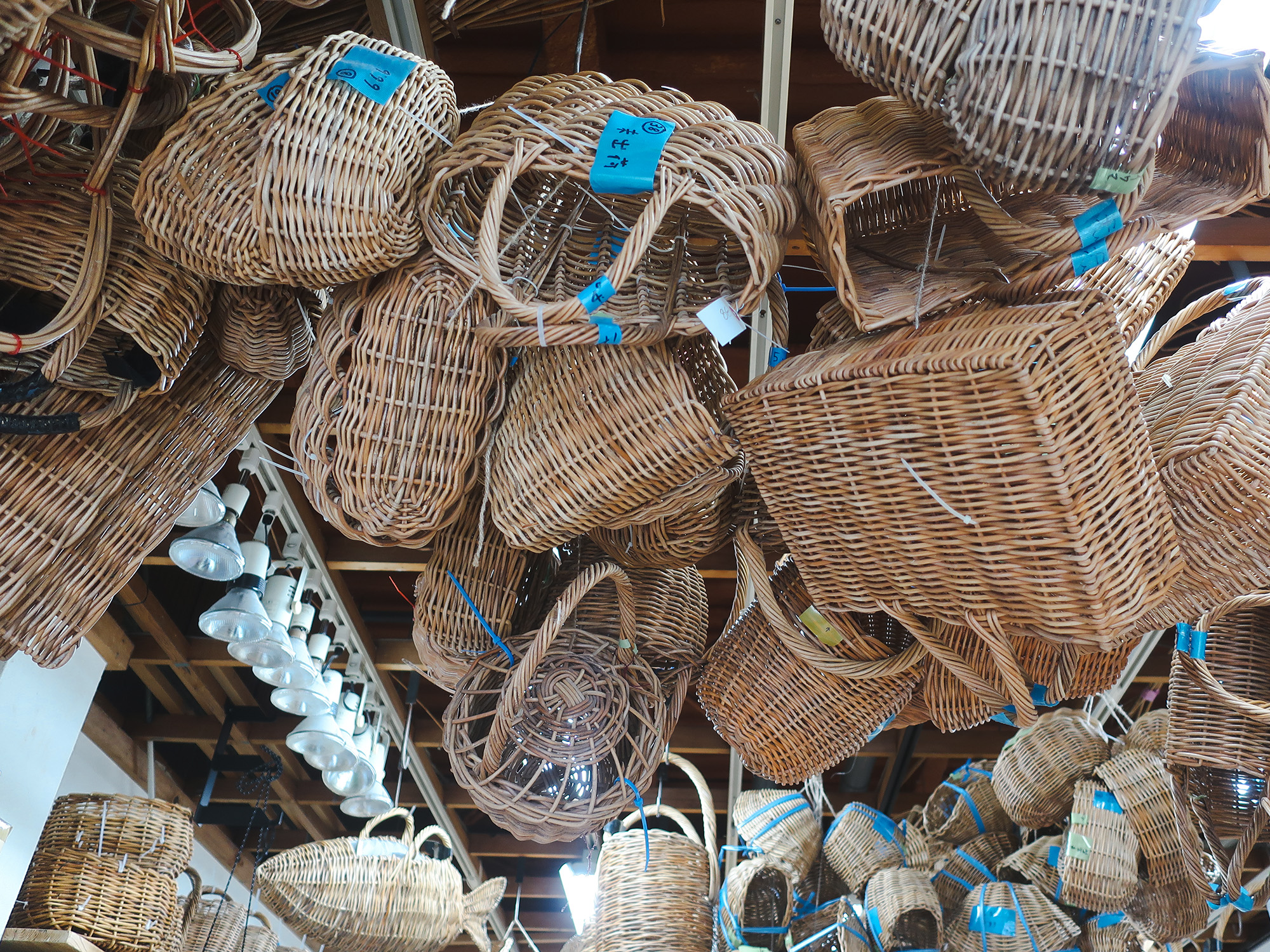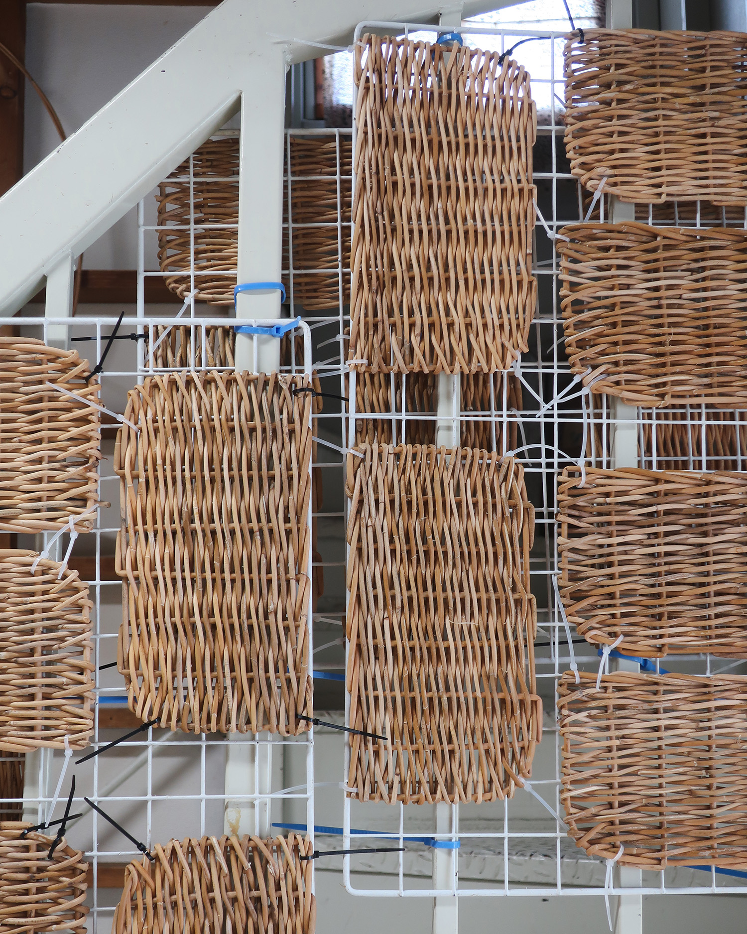 アトリエの天井に吊るして保管される、編み終わった紅籐のバッグたち。