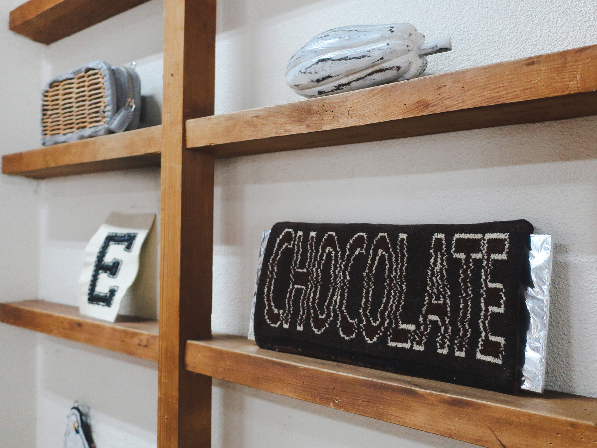 アトリエの入り口にはカカオ豆のオブジェや、巨大な板チョコレートのパッケージなど、コレクションのまつわるアイテムがディスプレイされていた。