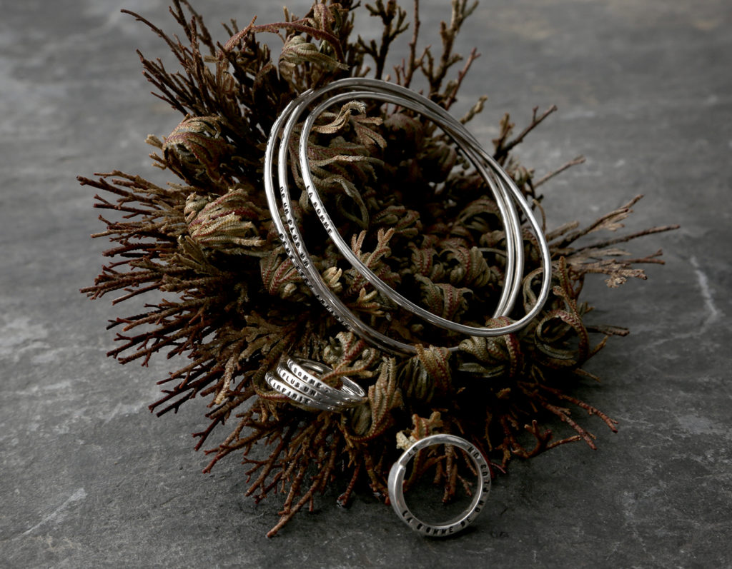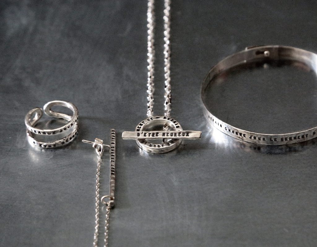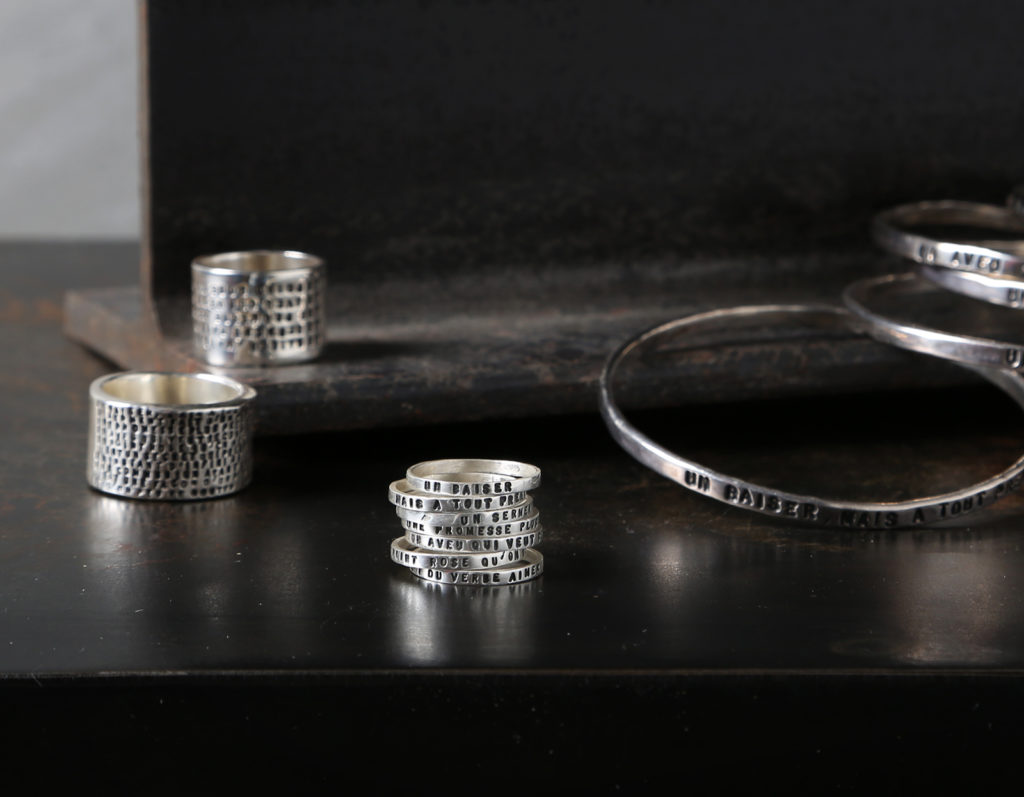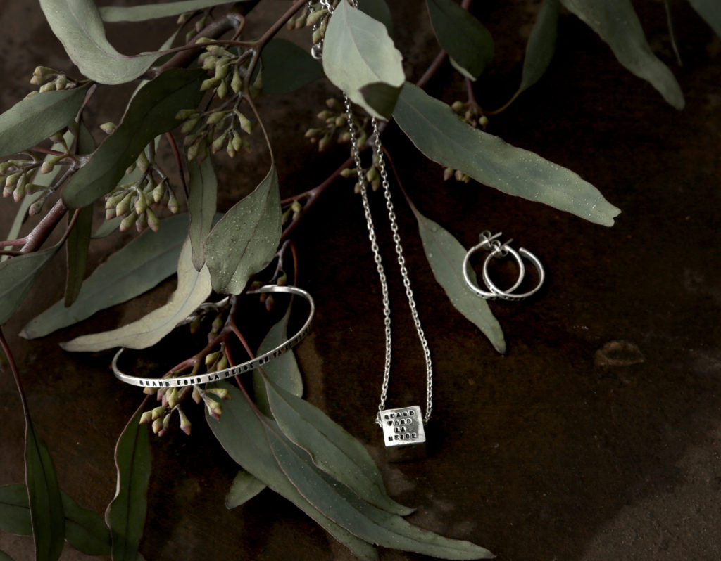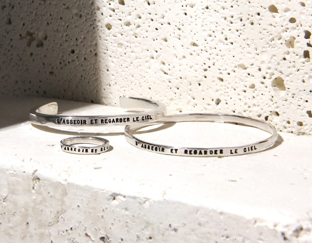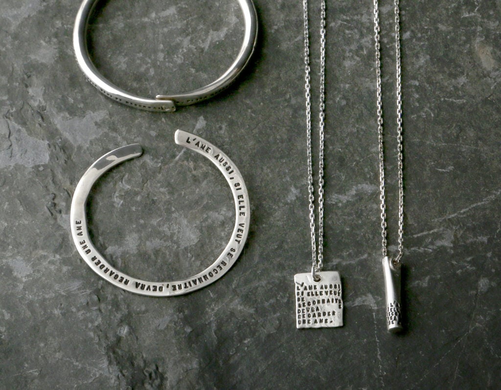 詩人でもあったセルジュ・トラヴァルが紡いだ数々の言葉は、シルバーやブロンズのプレートに刻まれ、ジュエリーという形で人々の心に寄り添い続けています。シンプルで力強く、時に優しく響くその言葉は、身につける人自身の物語を映し出すよう。
