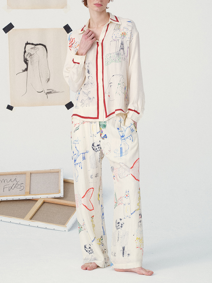 「カダーヴル・エクスキ(Cadavre Exquis/素晴らしき死体)」と呼ばれるフランスに古くからある遊びがインスピレーションソースとなったグループ。シルクサテン生地に偶然性をたのしむドローイングを、そして縁取りのラインを効かせ刺繍を施しています。