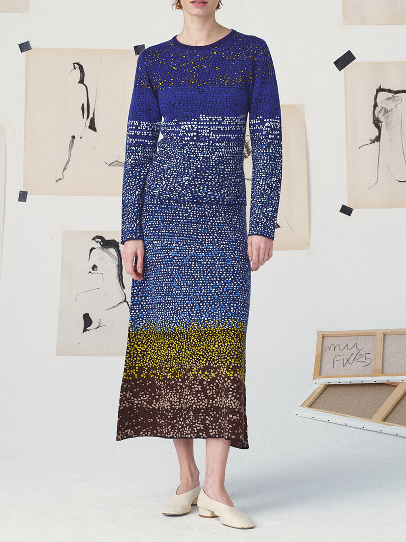 同じ風景を昼や夜に置き換えたり、スケール感で遊んだバリエーションです。シルクとニットのミックス素材で構成し、さらに新しいハンドウーブン(手織り)のシルクコットン素材も一から開発しました。