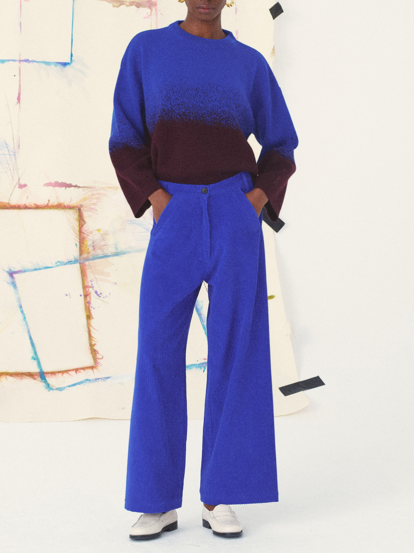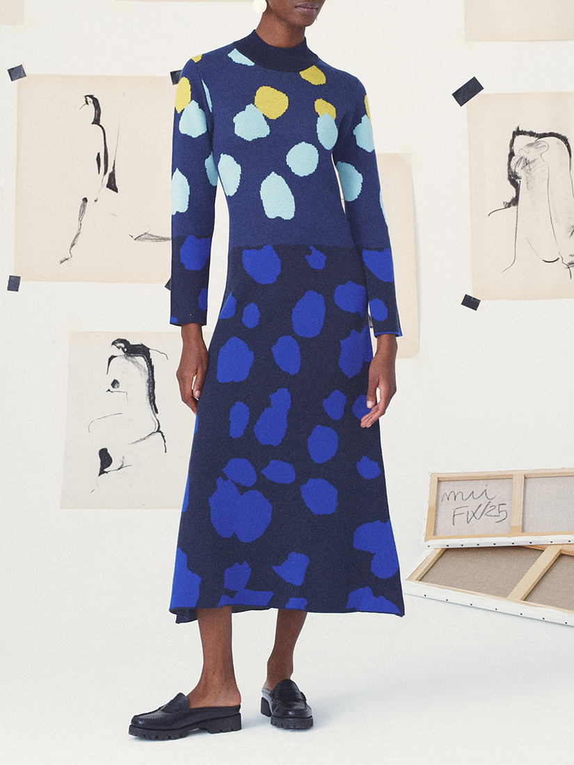 ウールやカシミアで作られたセーターは、ストライプや色の効果を使って、まるで抽象表現主義の絵画のように、あるいは色の飛沫のように遊び心を表現しています。素材感にもこだわり、パッチワークや刺繍を施しラグジュアリーなタッチを表現したり、生命感とグラフィカルなニュアンスを加えています。