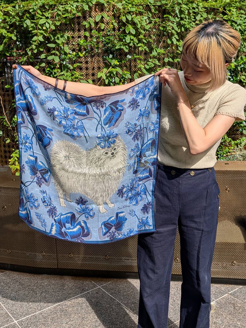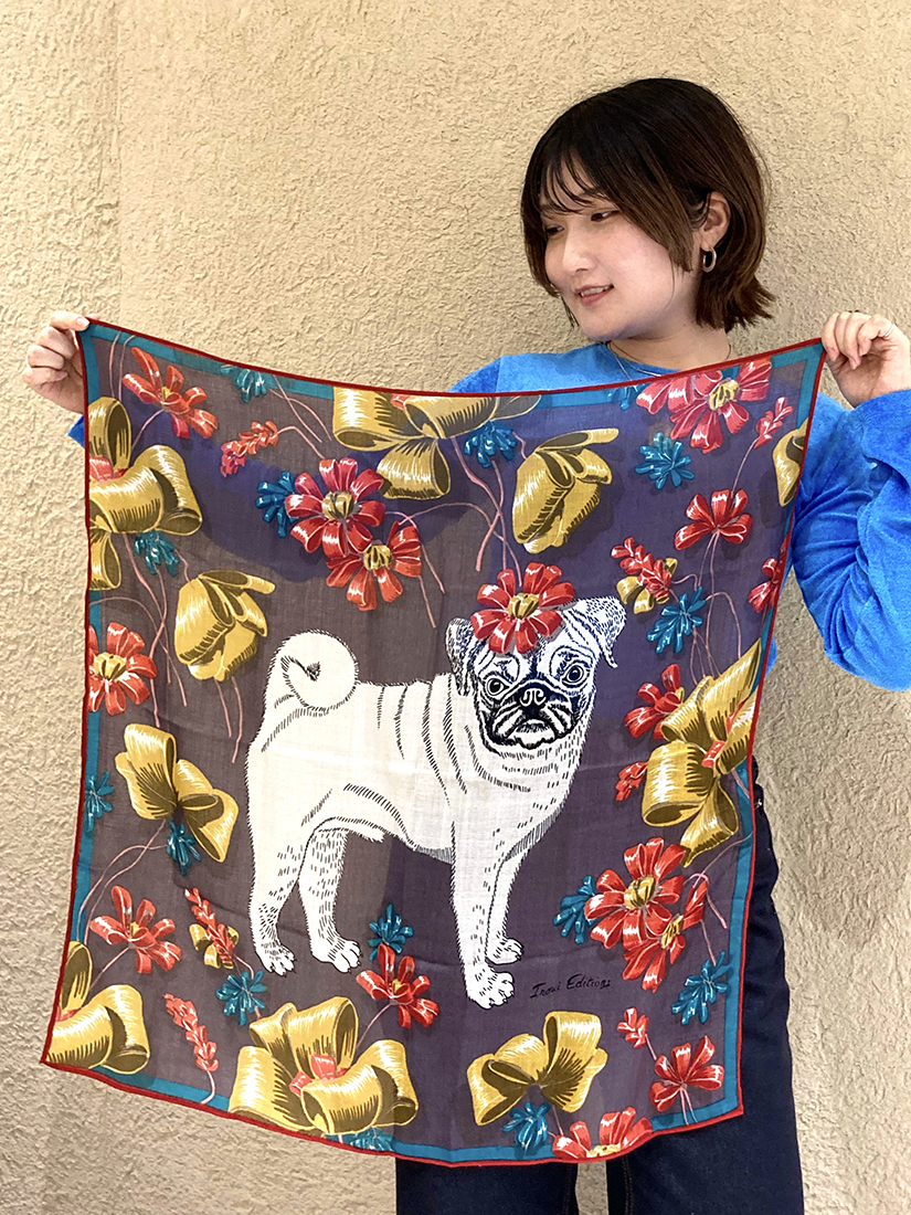 INOUI EDITIONS(イヌイ・エディション)の、お花でおめかししたポメラニアンがとってもキュートなスカーフ♡よく見ると一輪ずつリボンで描かれているトキメキたっぷりなデザイン。70 × 70cmと程よいサイズ感なので、首元に巻くのはもちろん、さらりと肩にかけてスカーフリングで留めるのも◎細く畳んでBAGに結ぶアレンジも素敵ですよ!