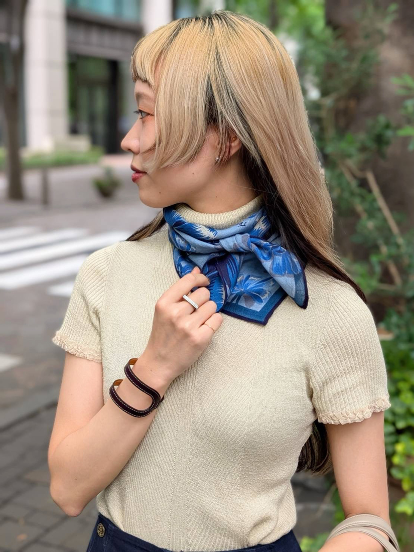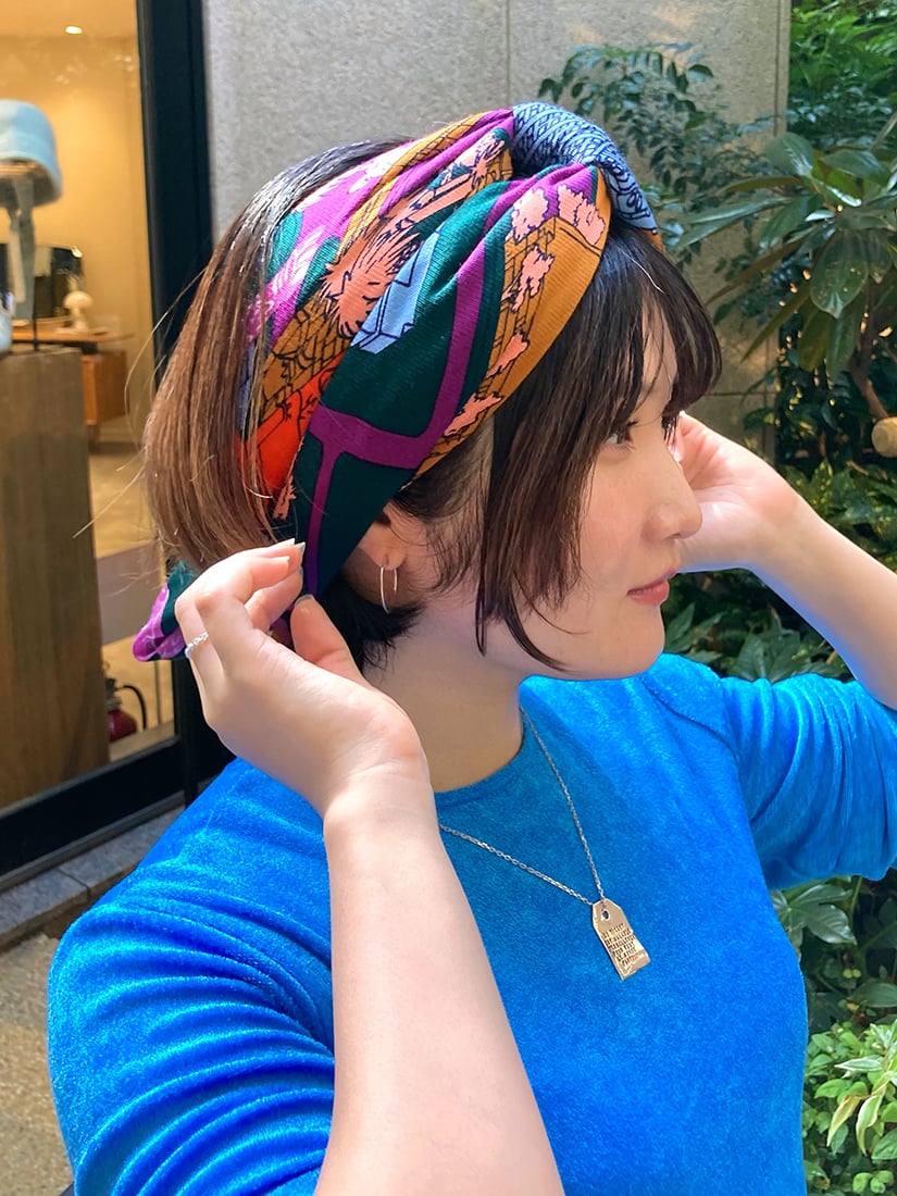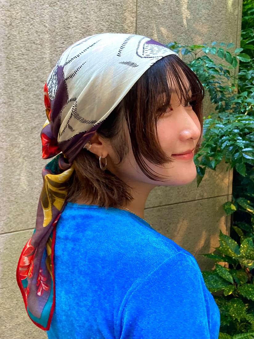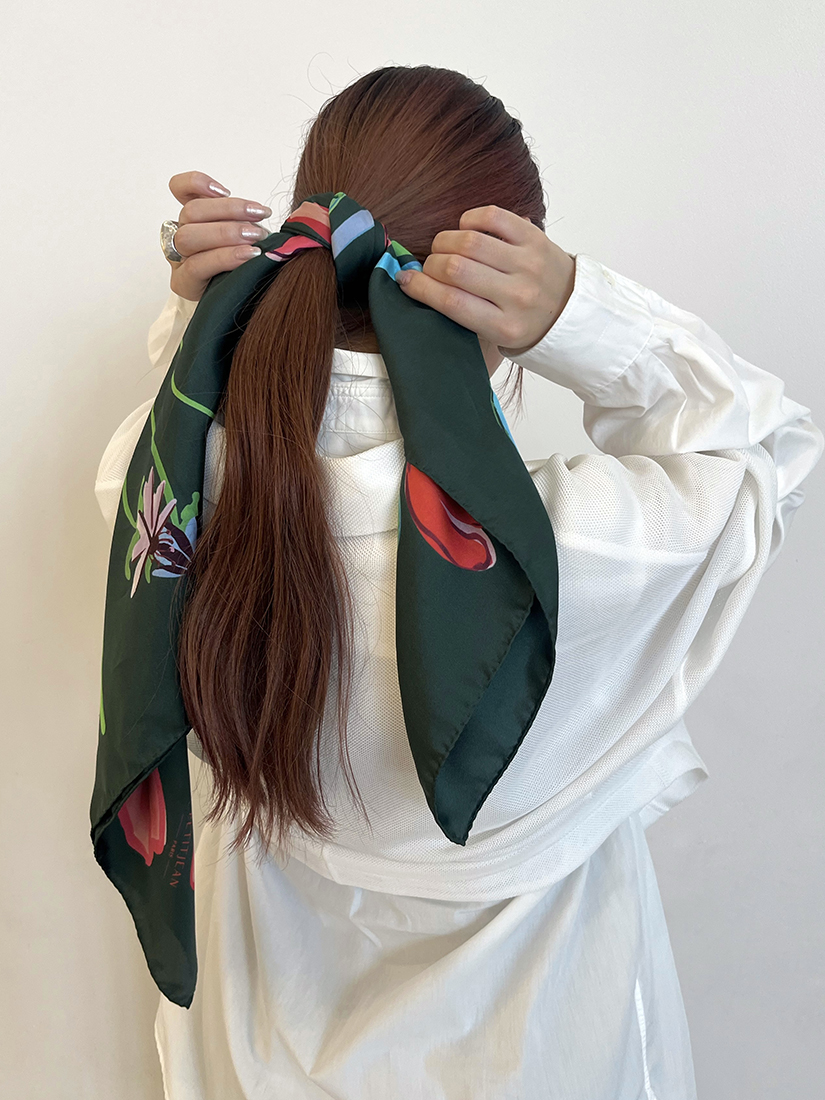 巻き方をアレンジするのにとても使いやすい 75 × 75 cmの正方形サイズですので、三角に折りたたんで首に、バッグに、はたまた忙しい朝にはひとつ結びをした髪に結び付けたり、、日常に寄り添ってくれるスカーフは一日の中でも幅広い使い分けができるところが嬉しいですね。