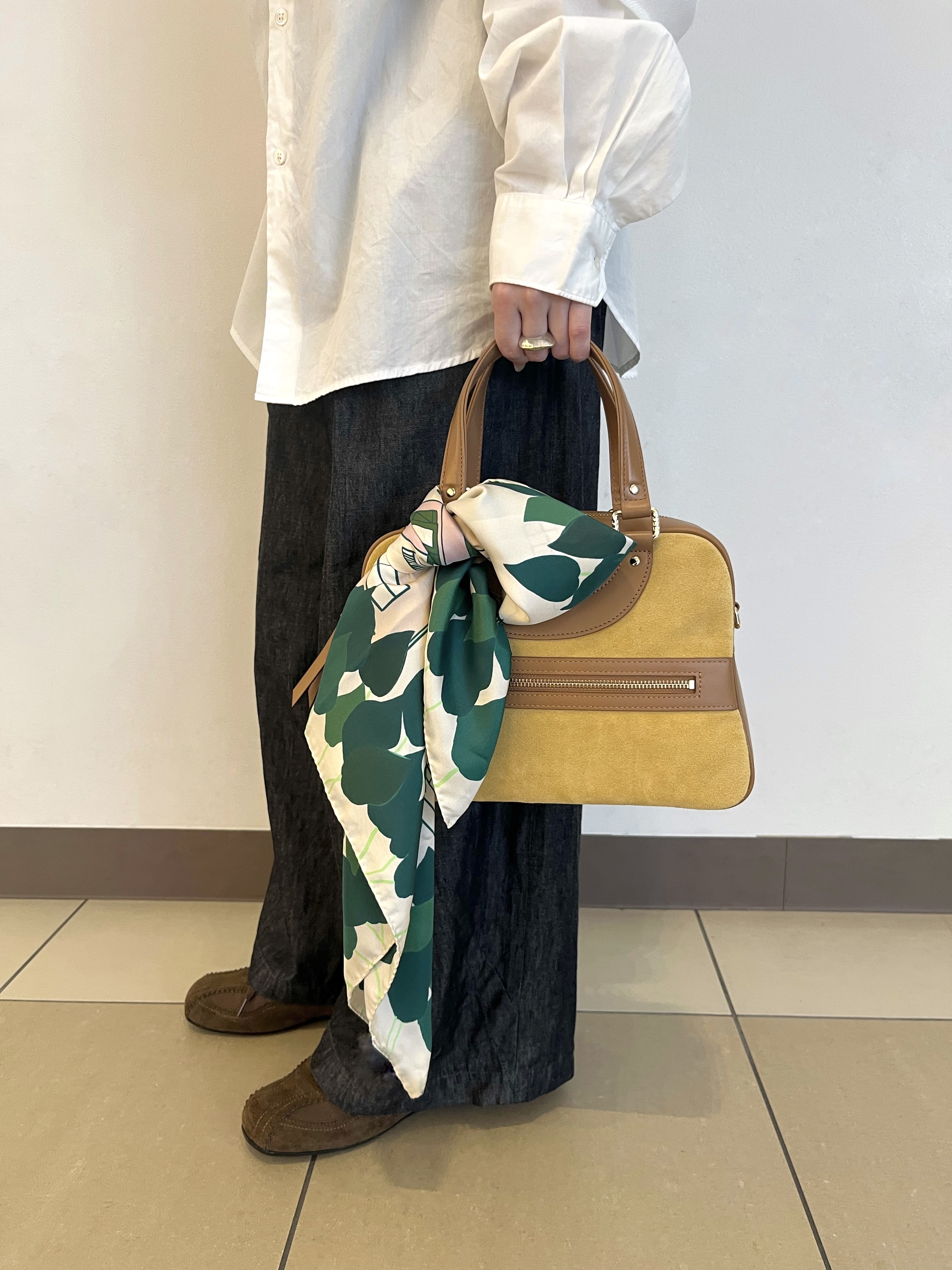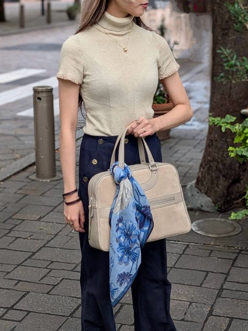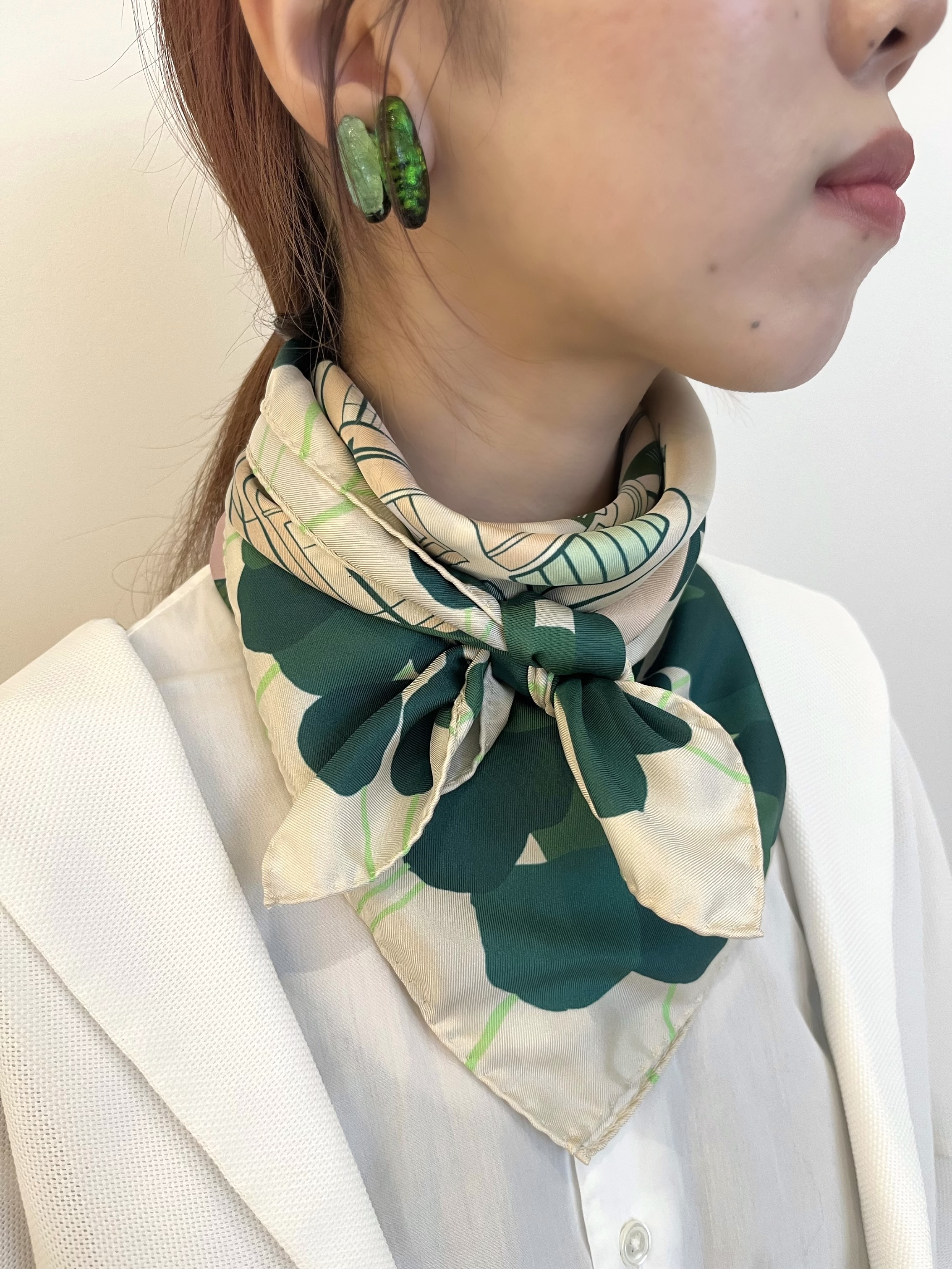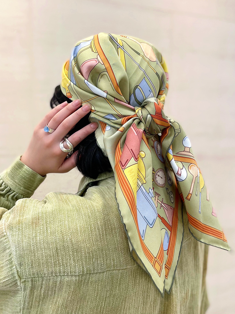 巻き方をアレンジするのにとても使いやすい 75 × 75 cmの正方形サイズですので、三角に折りたたんで首に、バッグに、はたまた忙しい朝にはひとつ結びをした髪に結び付けたり、、日常に寄り添ってくれるスカーフは一日の中でも幅広い使い分けができるところが嬉しいですね。