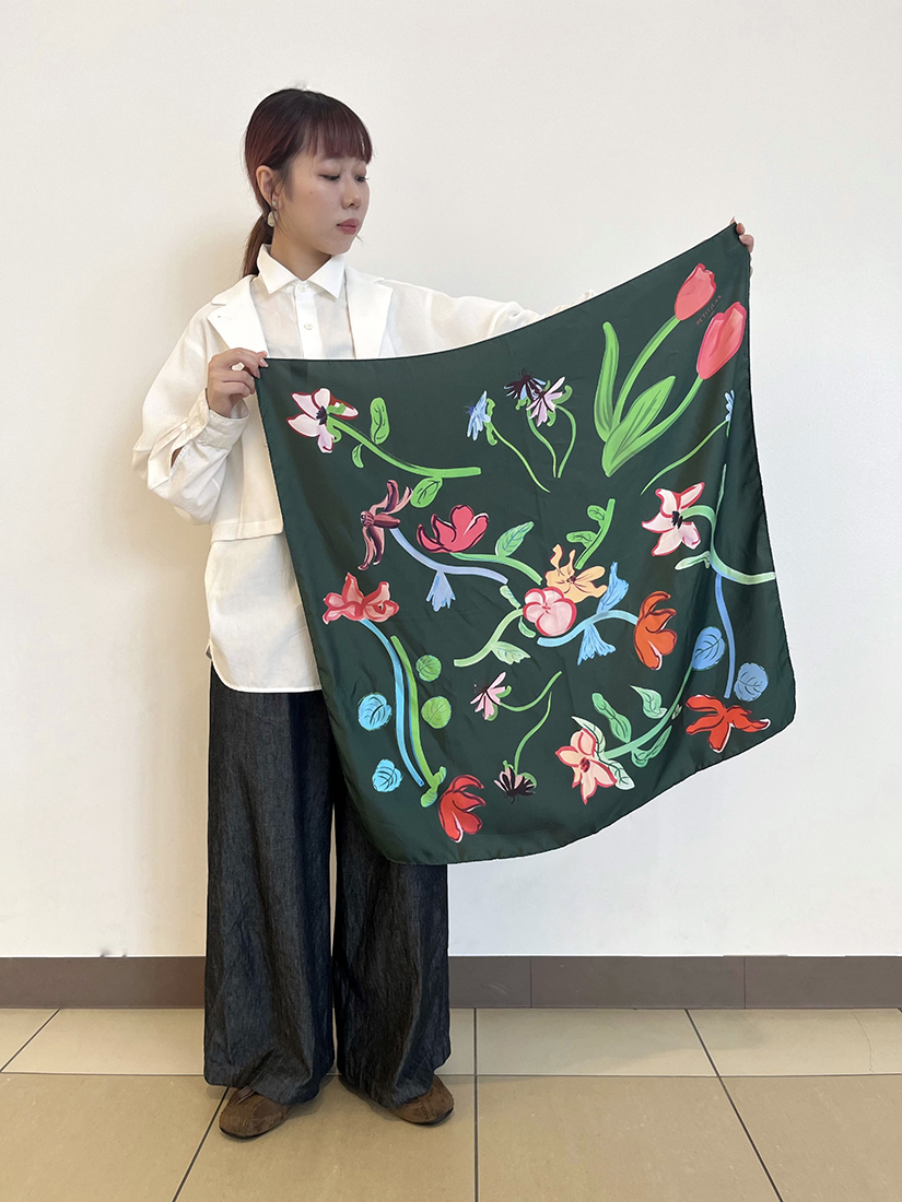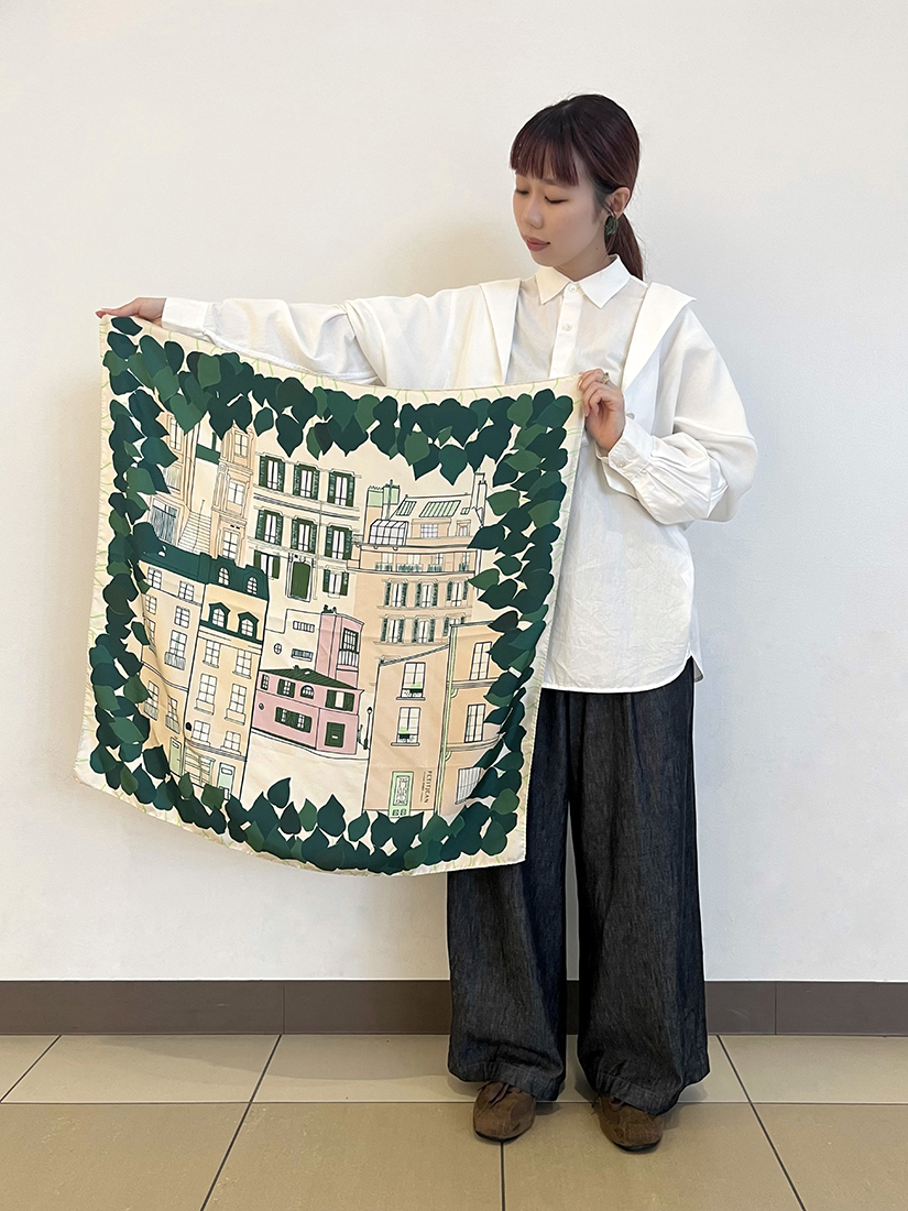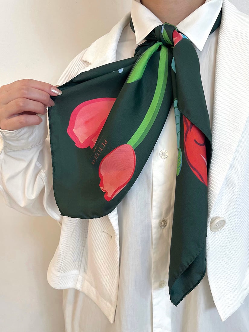 今回私が着用したPetitjean Paris(プティジャン パリ)のスカーフはデザイナーの記憶の風景をのせた詩的なデザインが魅力のアイテム。セレクトした2アイテムはパリのモンマルトルの街並みと、艶やかな花々が描かれたデザインです。