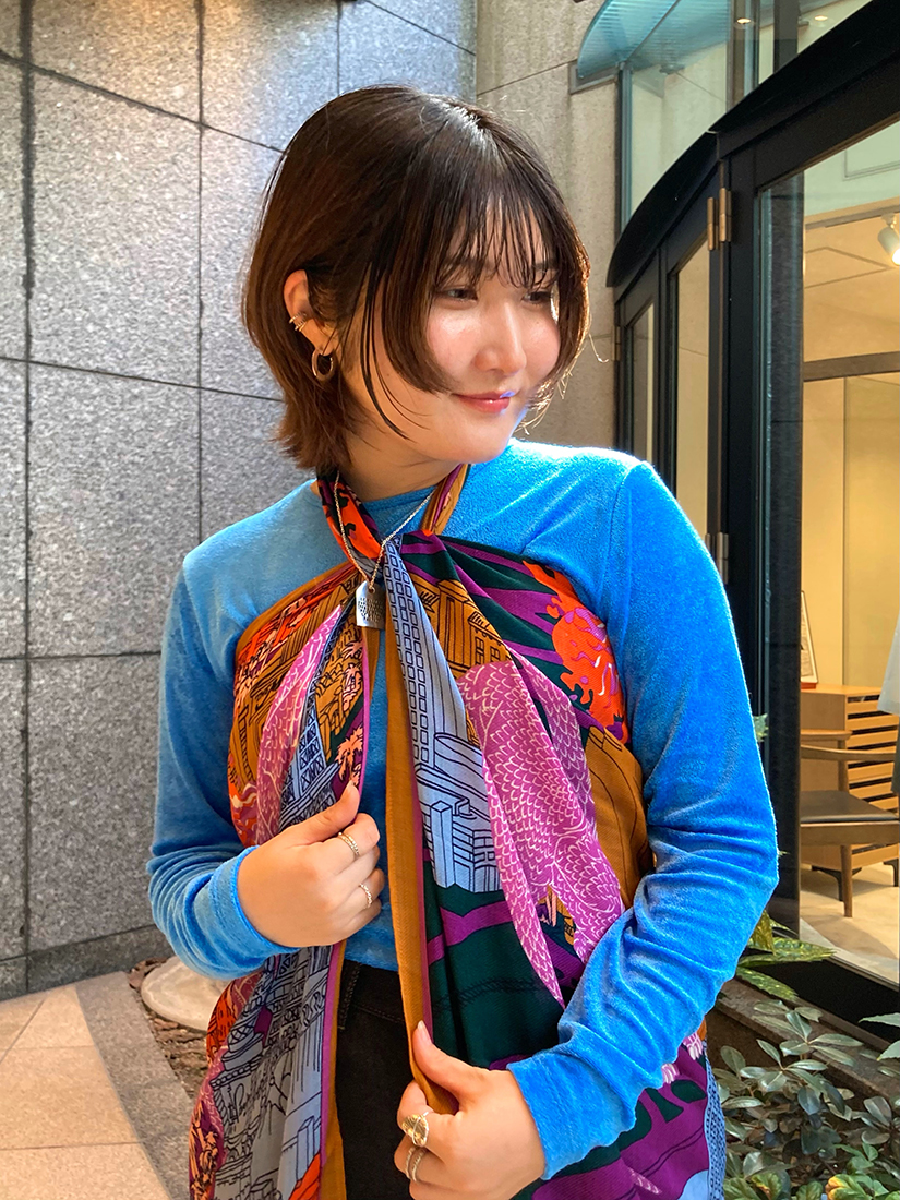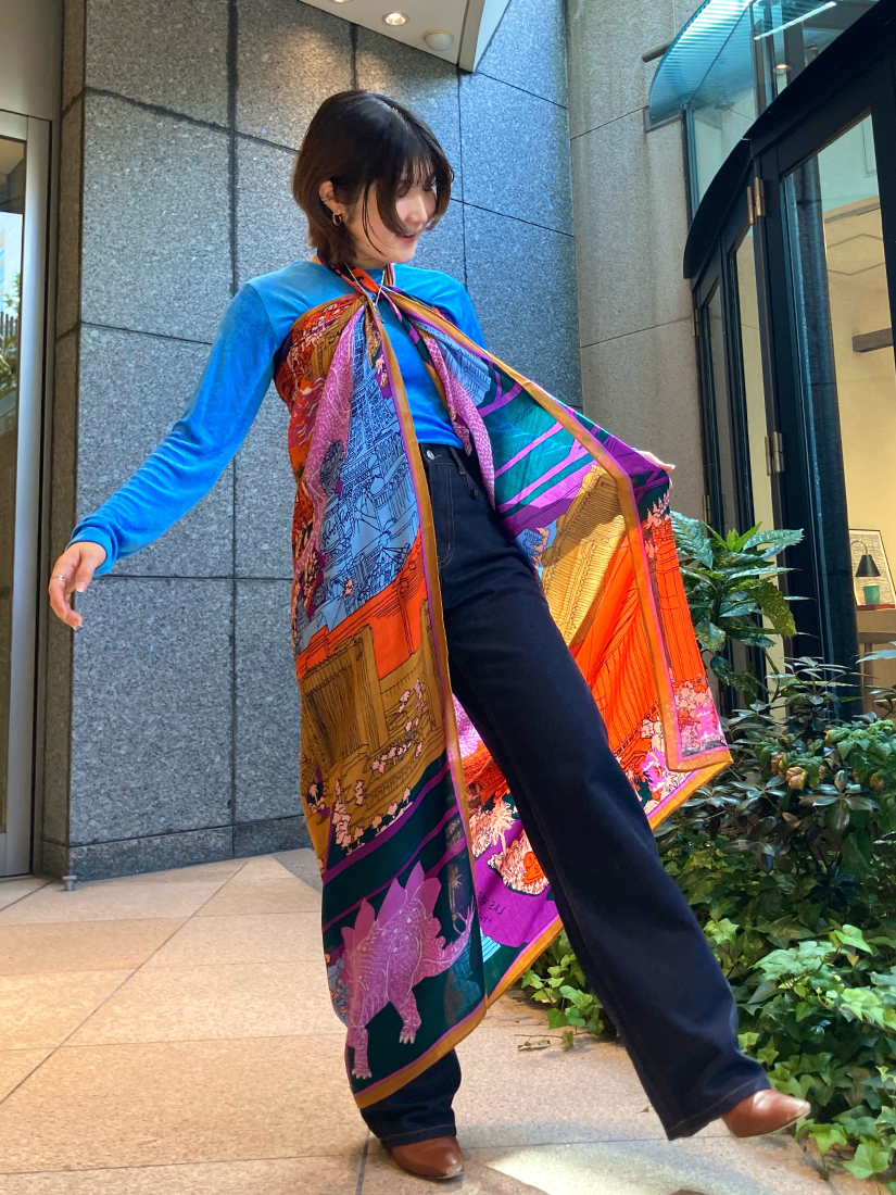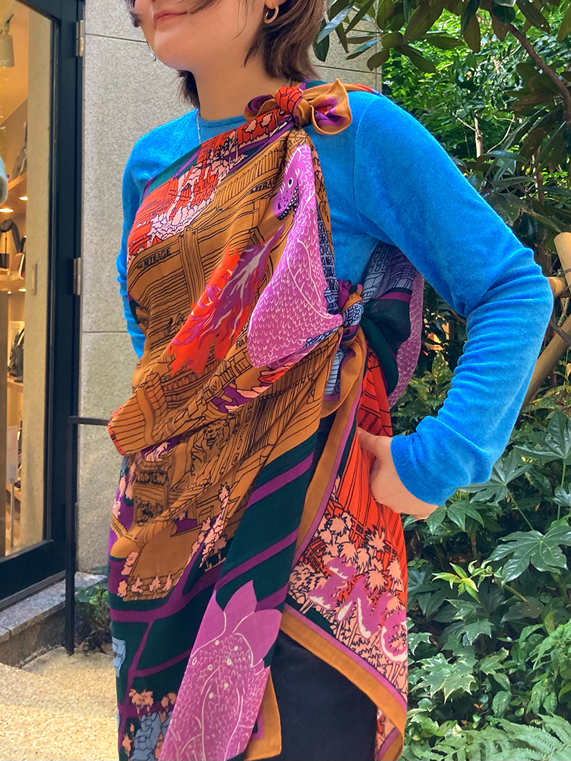 一見組み合わせが難しそうなパグと恐竜柄の2種類をピックアップ!頭に巻いてみたり、ビスチェ風にアレンジしてみたり…。70 × 70cmのサイズは収まりの良いシルエットで着こなせ、130 × 130cmの大判タイプは大胆にワンピース風アレンジをしてドレープを美しく表現しても素敵です。ちなみに大判タイプも頭に巻くと意外とコンパクトになりますよ♪INOUI EDITIONS(イヌイ・エディション)のストールは巻く位置によって柄や色合いが全く異なって見えるのが最大の魅力♡私自身も撮影中に使い方のアイデアがたくさん浮かんできて、手に取った途端にワクワクしてしまうユーモラスなアイテムです!