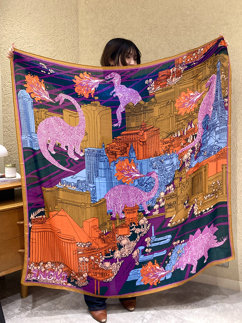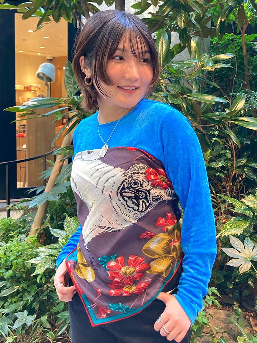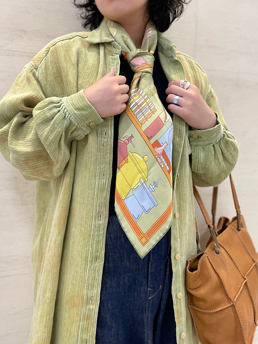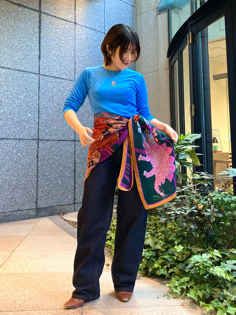 一見組み合わせが難しそうなパグと恐竜柄の2種類をピックアップ!頭に巻いてみたり、ビスチェ風にアレンジしてみたり…。70 × 70cmのサイズは収まりの良いシルエットで着こなせ、130 × 130cmの大判タイプは大胆にワンピース風アレンジをしてドレープを美しく表現しても素敵です。ちなみに大判タイプも頭に巻くと意外とコンパクトになりますよ♪INOUI EDITIONS(イヌイ・エディション)のストールは巻く位置によって柄や色合いが全く異なって見えるのが最大の魅力♡私自身も撮影中に使い方のアイデアがたくさん浮かんできて、手に取った途端にワクワクしてしまうユーモラスなアイテムです!