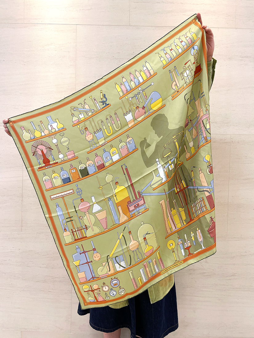 今回は偉大な科学者マリー・キュリーに捧げる一枚をピック。男性科学者しかいない時代にノーベル賞を二度も受賞した彼女の功績を称えて、、、素材感はさらっとしたシルク100%のお素材。90 × 90cmの大きめサイズなのでアレンジし放題です✨スカーフの色味に合わせてお洋服やバッグは優しい色味のものをチョイス。首元にはネクタイ風に巻いてみました!コンパクトに折りたたんで巻くと、すっきりとしたコーディネートに◎スカーフを頭に巻くのもおすすめです!三角に折って頭に巻くだけの簡単なアレンジですが、さり気ないおしゃれさがプラスされます。MALFROY MILLION(マルフロイ ミリオン)のスカーフは老舗のブランドならではの上質な素材感が魅力。手に伝わる感触がとても心地よく、シャキっとした気分にさせてくれるアイテムです。