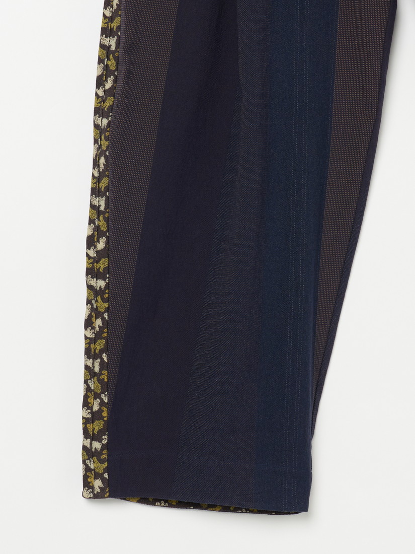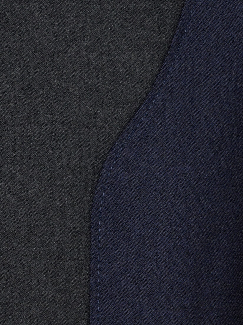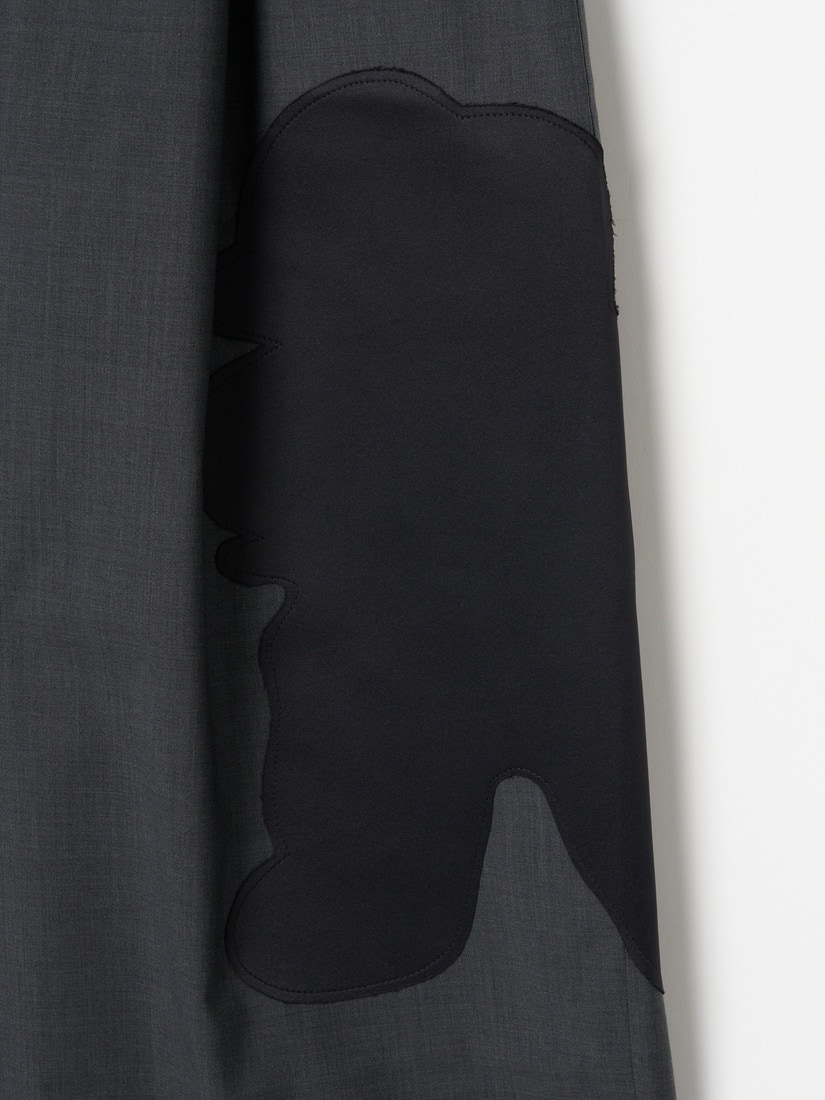 滴り落ちる水や"MOSSY"のシルエットがパッチワークで表現されています。異素材を接ぎ合せながらもまるで一枚の生地のようにスムースな仕上がりとステッチの美しさ、そして裏側まで美しい仕立てに、D-dueの高度な技が光ります。