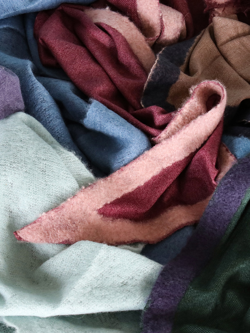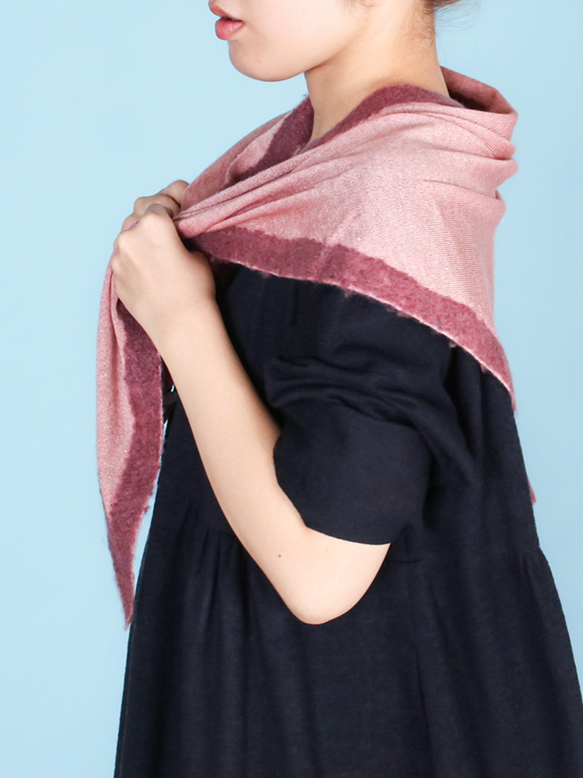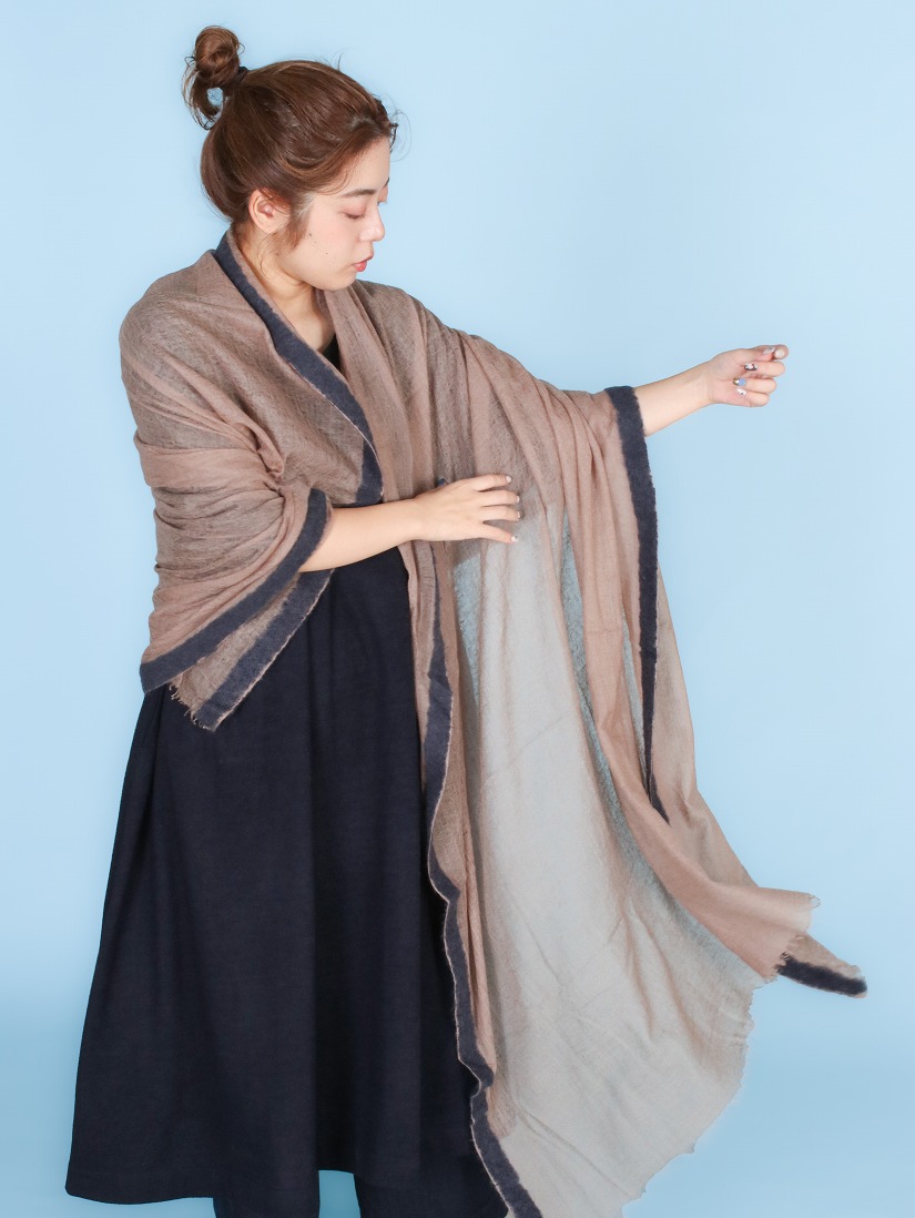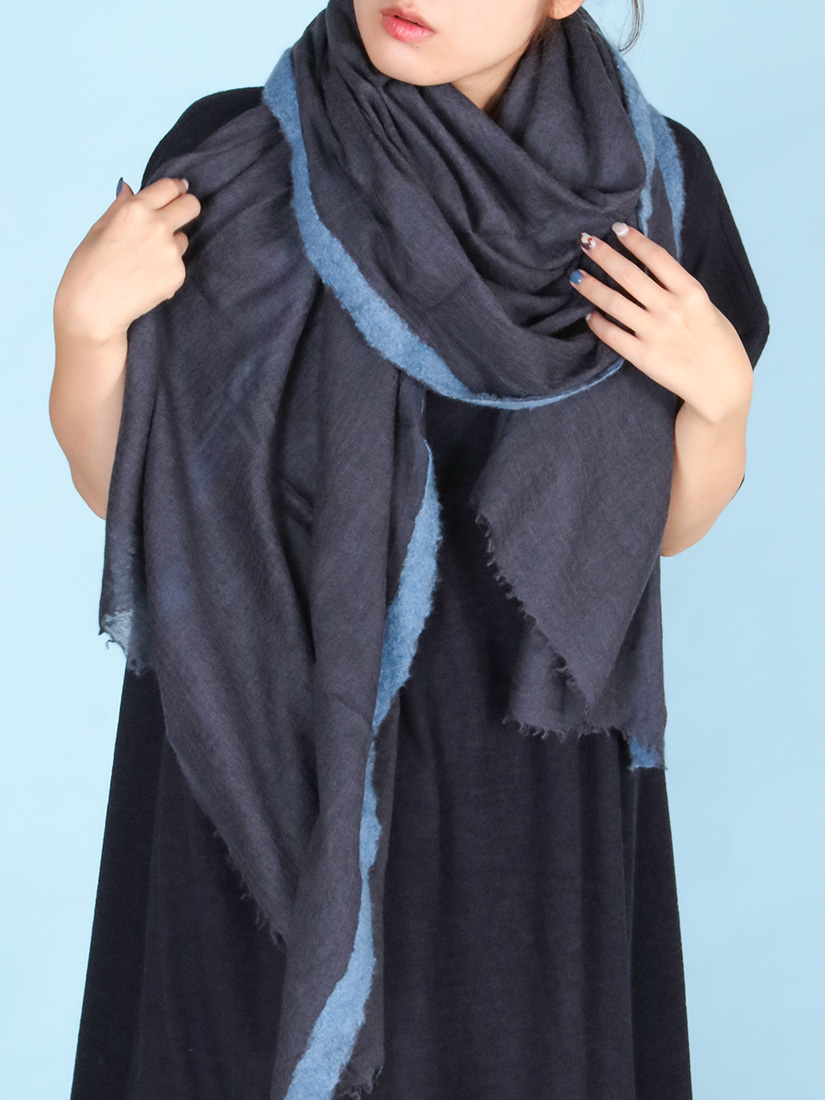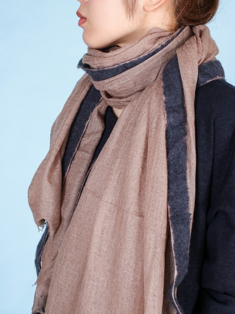 “スフレ”の名のとおり、ふわりとした軽やかさととろけるようなしなやかさで纏う人をそっと包み込んでくれる、大判カシミヤストール。半フェルト仕上げの縁取りが生む立体感がアクセントに。薄くしなやかな質感で巻き方のアレンジも自在です。