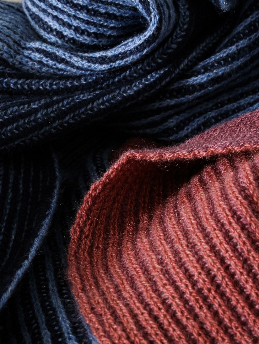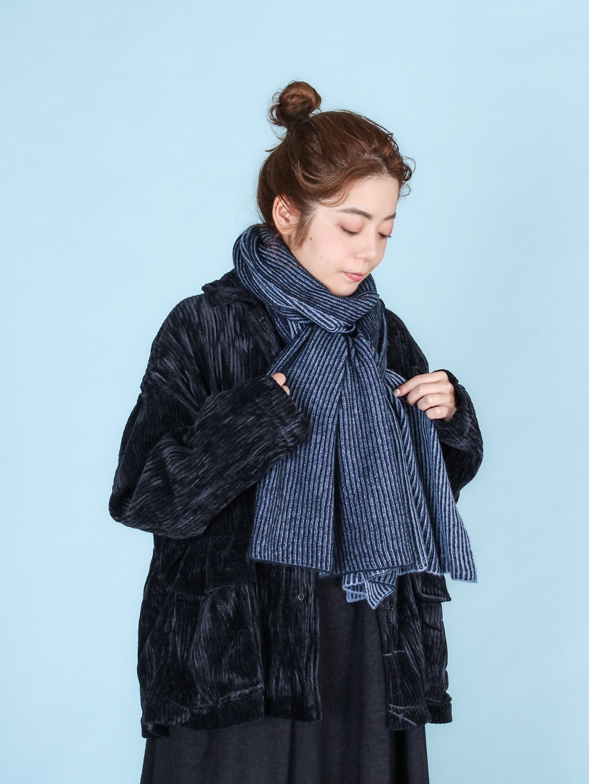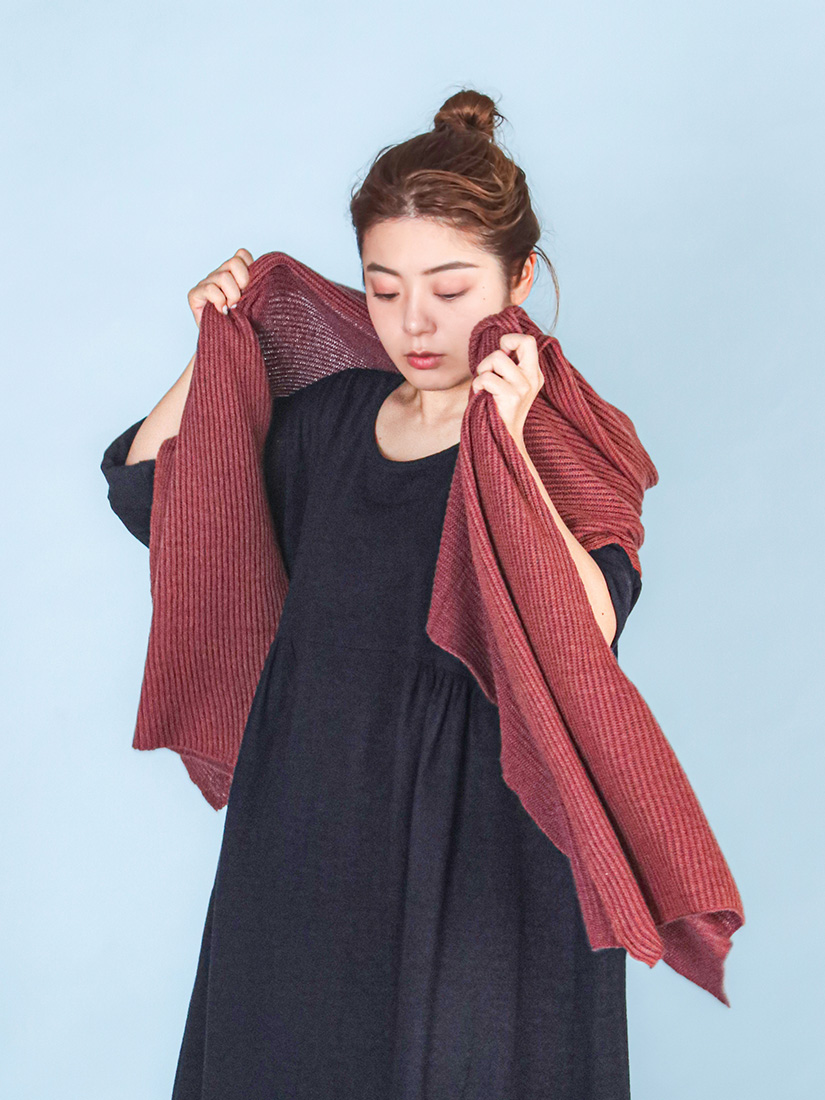 2色の糸が織りなす立体的な陰影が魅力のリブ編みカシミヤストール。巻き方で色の出方の変化をたのしんでいただけます。エレガントで洗練された雰囲気とカジュアルスタイルを併せ持つ逸品です。