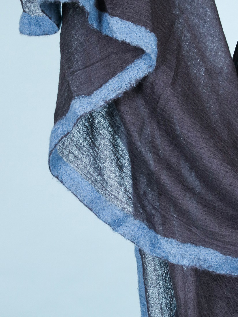 フェルトのあたたかみのあるラインが、まるでアートピースのようにお顔を縁取ります。首元にやわらかな輪郭を描く、ミニマルな温もりをどうぞ。カシミヤ70%、シルク30%のなめらかな肌触りです。小ぶりなのでバッグの中にも小さく収まってくれます。