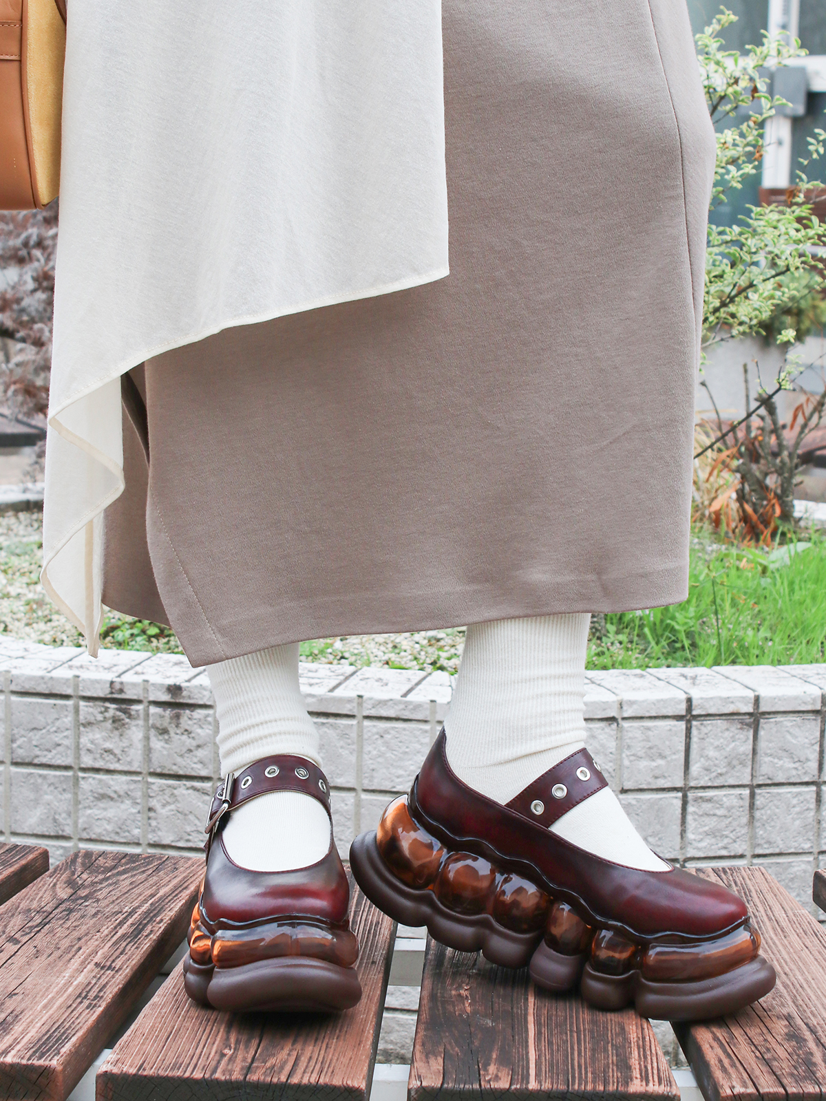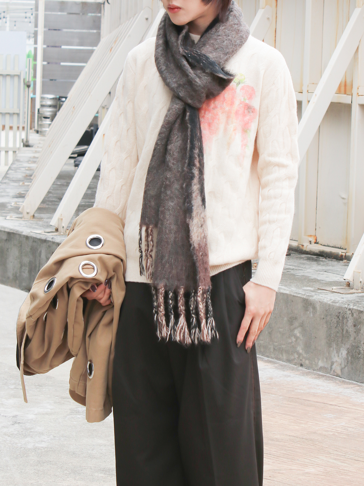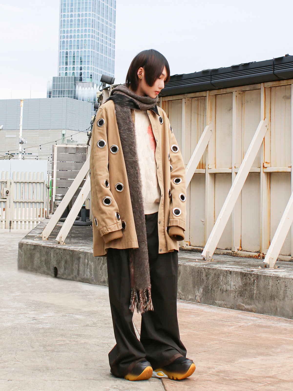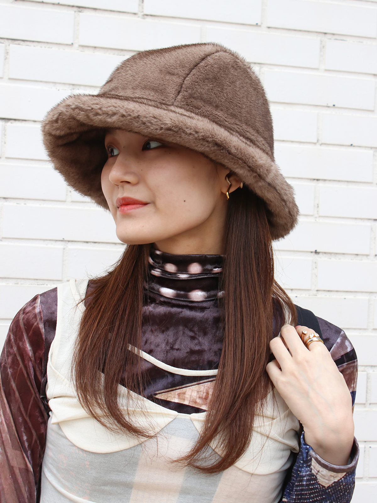 ファーハットとボリュームのあるシューズが程よいアクセントになり、やわらかさの中にモードな雰囲気を添えています。