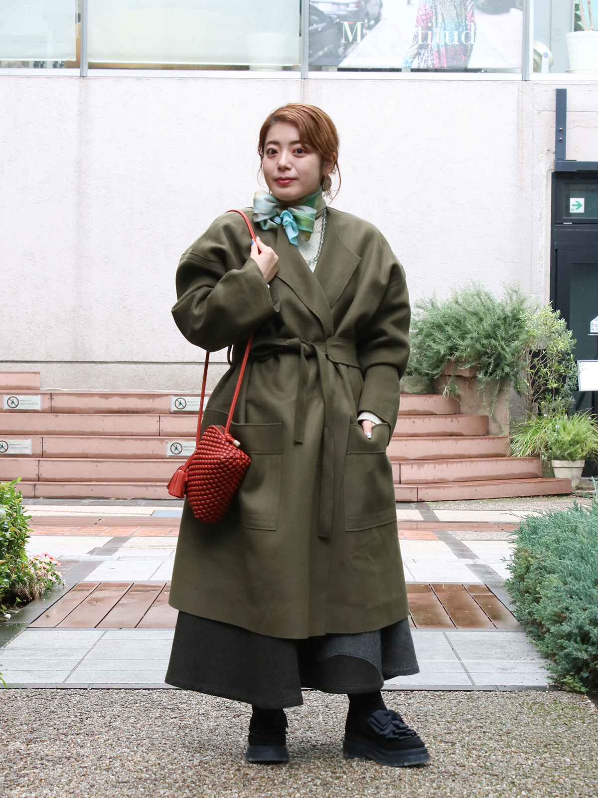 カーキのコートにブラウンのスカートを合わせた、秋らしいトーンコーデ。