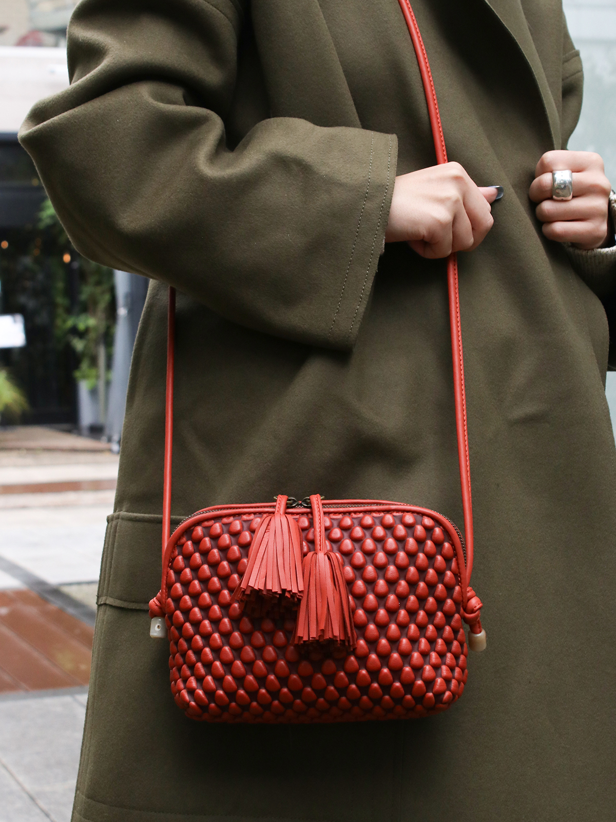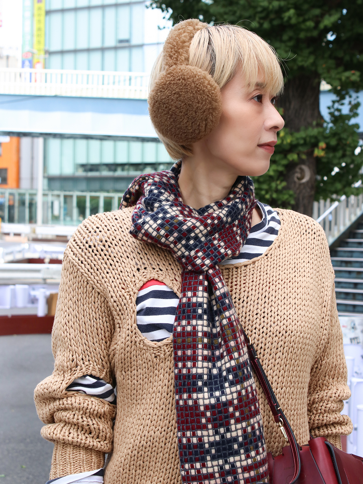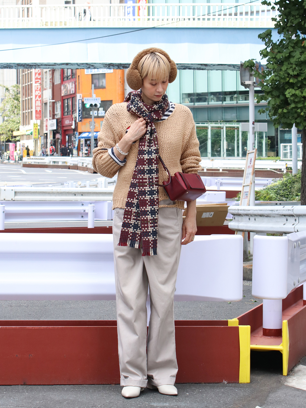 ブラウンやバーガンディの配色でまとめた、季節感あふれるコーディネート。