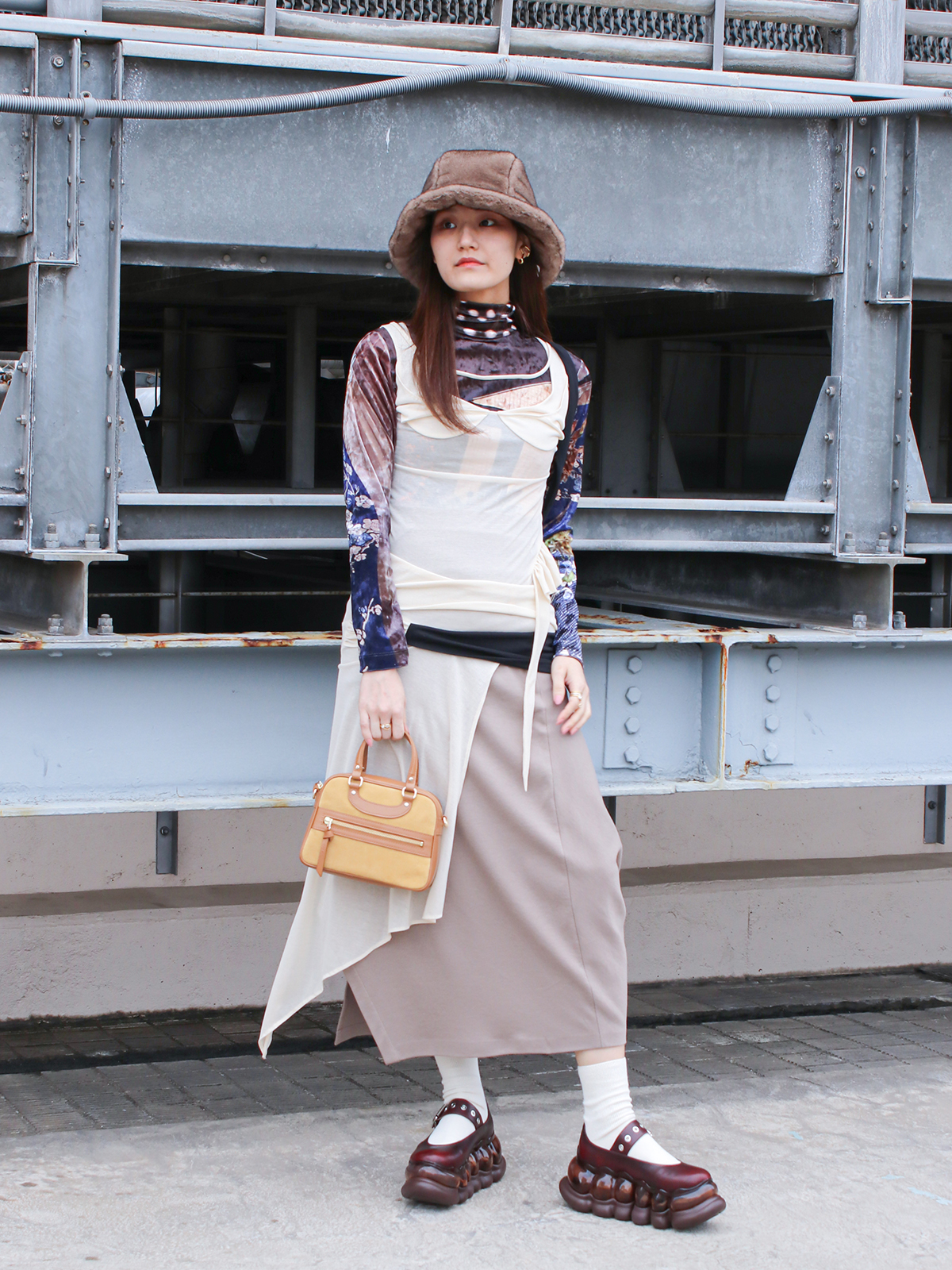 異素材を重ねた立体感が、季節感と都会的なニュアンスを引き立てるスタイルです。