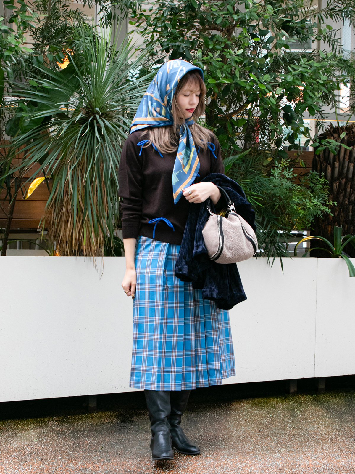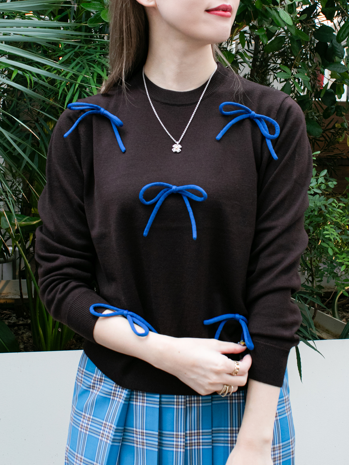 ブルーのリボンが映えるブラウンのニットに、チェックのプリーツスカートを合わせた上品なコーディネート。