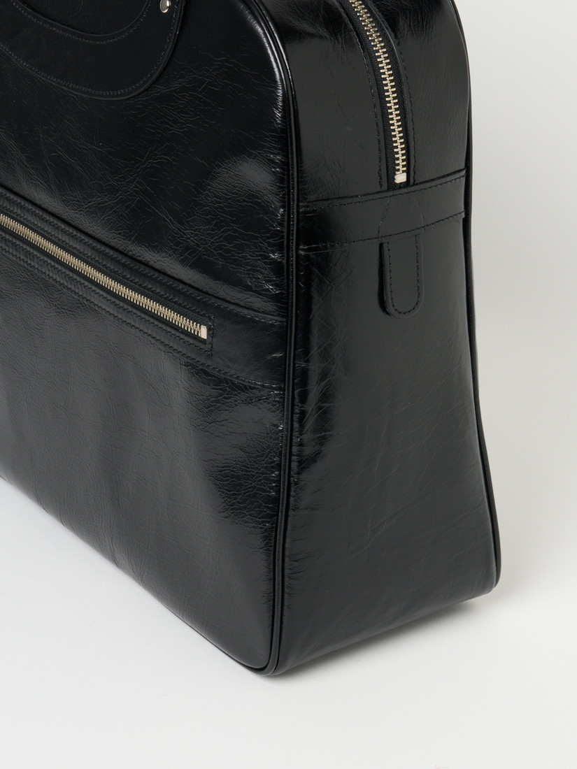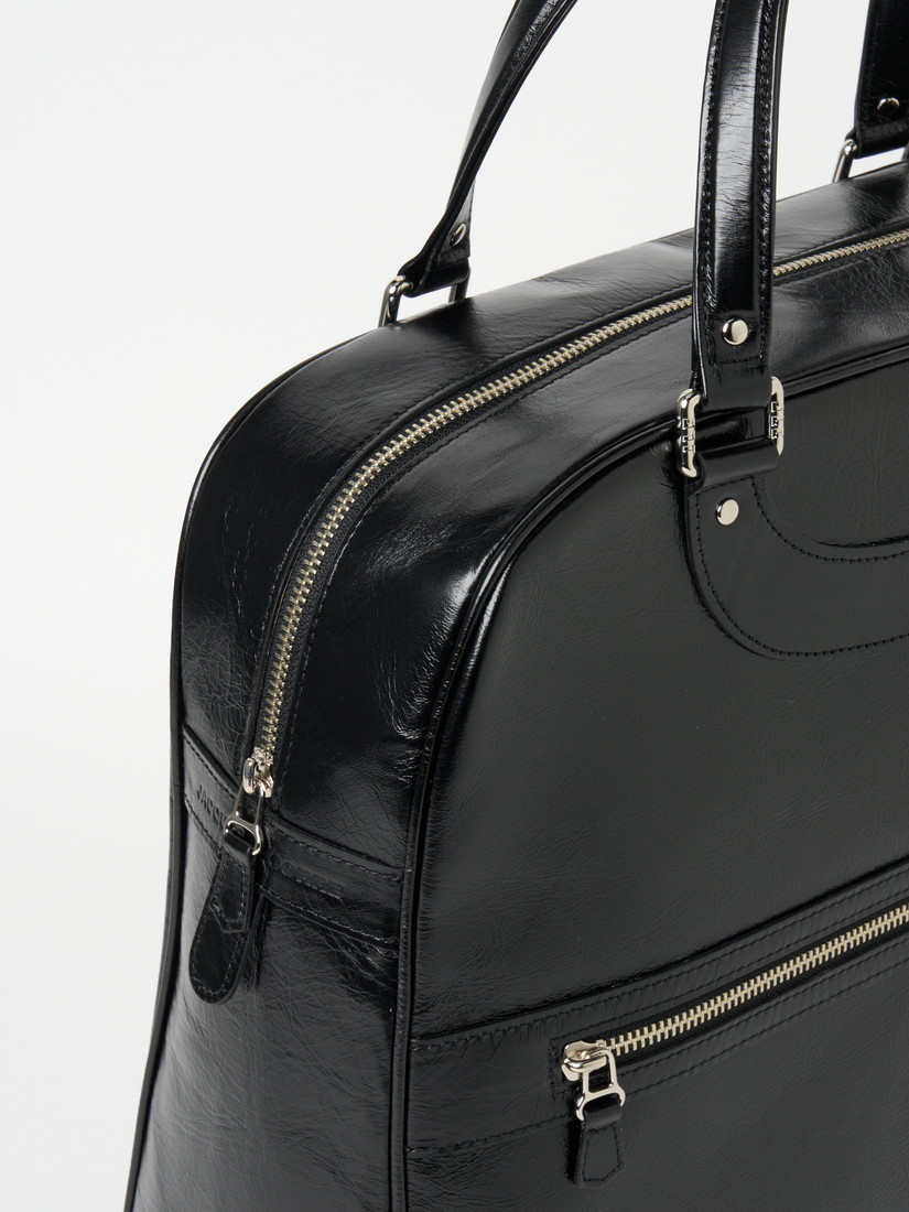 深みのあるブラックレザーに、微細な反射をたたえた光のニュアンス。