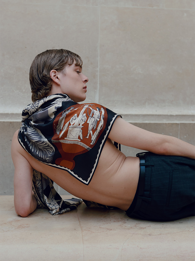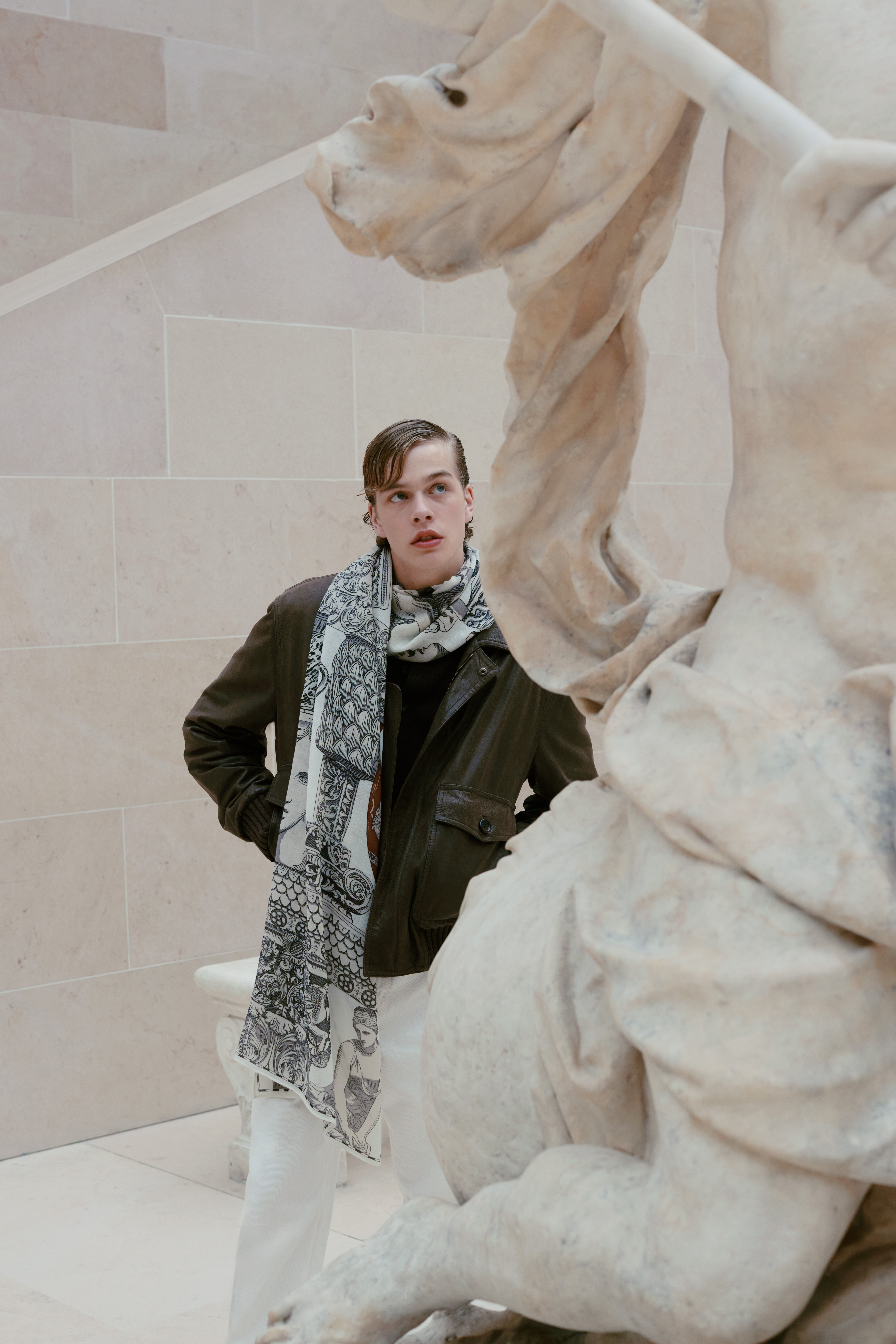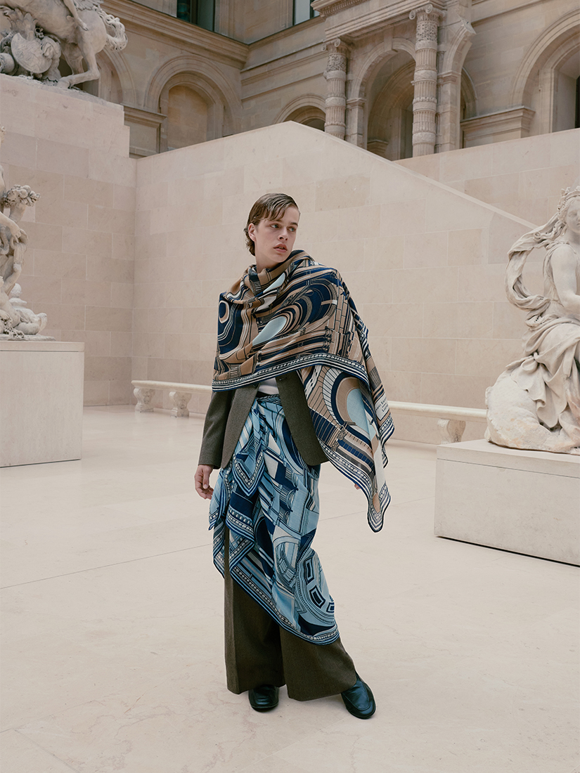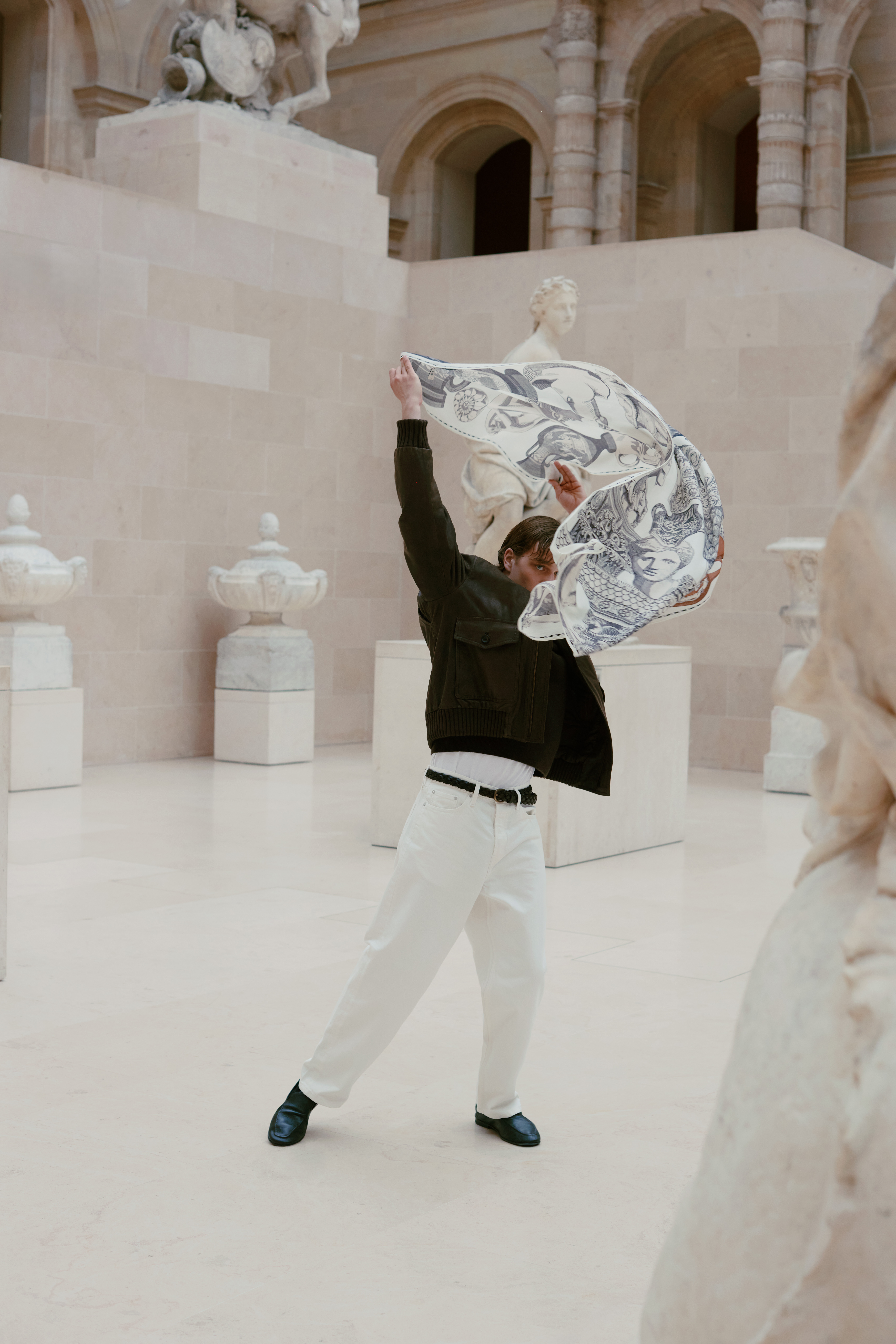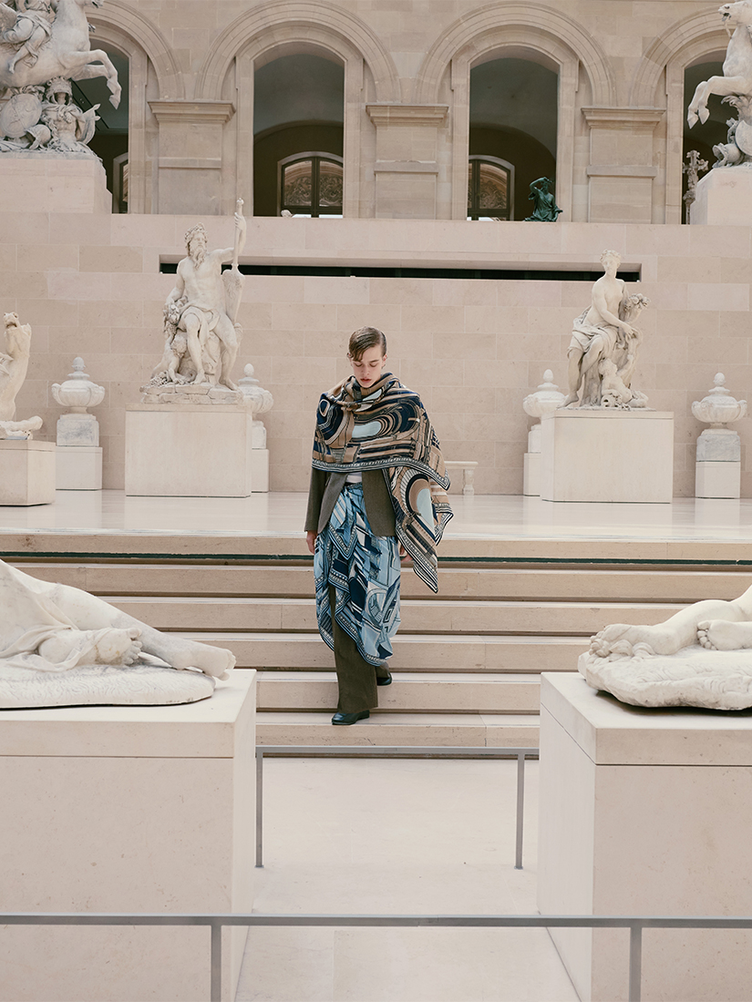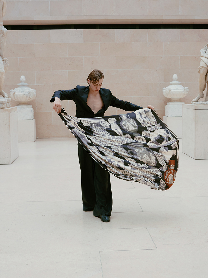 さまざまな時代や大陸を横断するモチーフ、古代彫刻、歴史的な浅浮き彫りを巧みに組み合わせ、コラージュのように構成した一枚。ルーヴルに蓄積された豊かな美のアーカイブを、テキスタイルの上で新たな物語として表現しています。