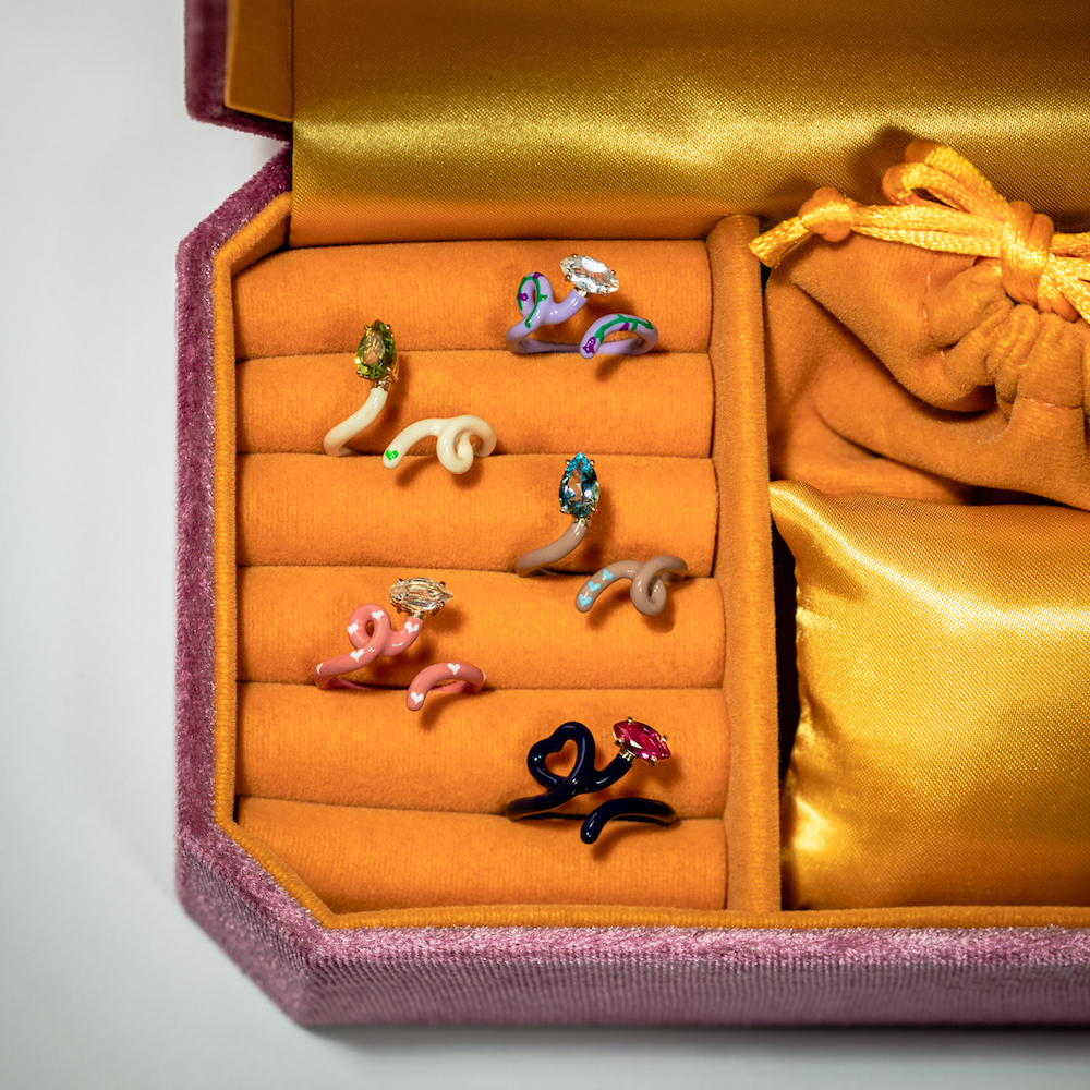 ミラノを拠点に活動するジュエリーブランド Bea Bongiasca(ベア・ボンジャスカ)が贈るのは、H.P.FRANCEのためだけにカスタマイズされた5種類のリング。ブランドのアイコンとも言える、鮮やかなエナメルカラーが描く有機的な曲線をベースに、ひとつひとつミラノのスタジオで手描きによって仕上げられている。モチーフに選ばれたのは、シックであり、ジュエリーにおいて最も普遍的に愛され続けてきた「ハート」。ブランドの最新コレクションでも、ハートは「愛」や「つながり」、そして「時を超える感情」の象徴として重要なテーマとなっている。(リング 各106,700円/Bea Bongiasca、ジュエリーボックス 13,200円/H.P.FRANCE)