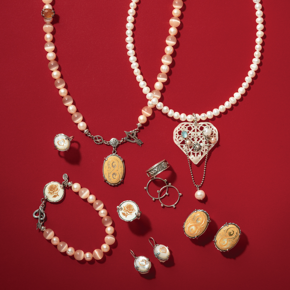 40周年を記念し制作されたコレクションは、自由な発想と創造の歩みの中で、ブランドが長年大切にしてきた「感情をかたちにする」という哲学を改めて表現したもの。クラシックなハートやバラのモチーフに込められた、「永遠」や「つながり」といった普遍のテーマ、そして、モダンでありながら、力強さを宿したデザイン。(ネックレス 左 95,700円・右 89,100円、ピアス 上 40,700円・下 52,800円、イヤリング 49,500円)