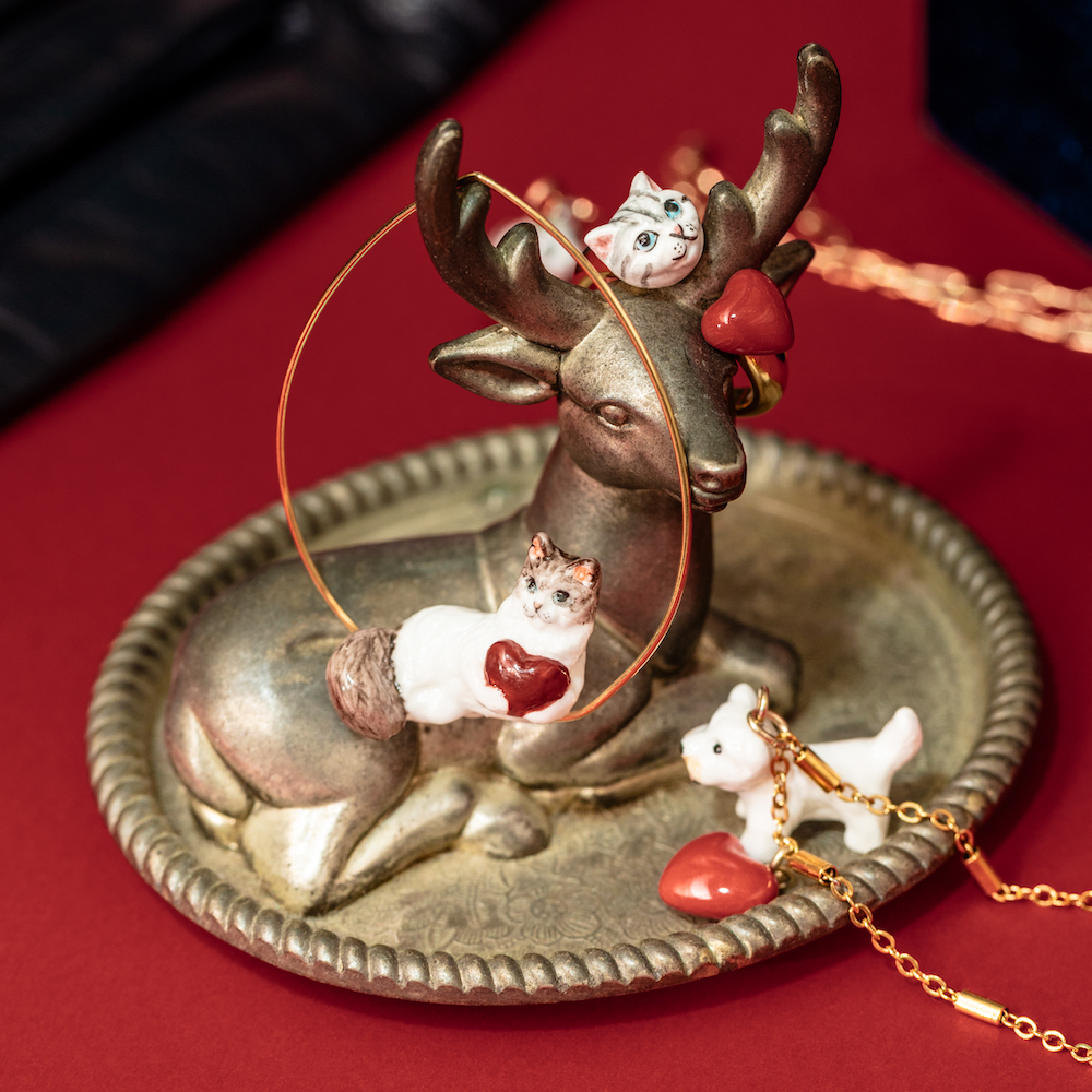 NACH(ナッシュ)が贈るキュートなコレクションは、動物や自然への愛情をモチーフに、40周年テーマ“H.P.LOVE ”に寄り添って制作された。犬や猫など愛らしい仲間たちと赤いハートを組み合わせ、思わず笑みがこぼれるデザインに仕上がっている。(リング 16,500円、フープピアス 16,500円、ブレスレット 14,850円)