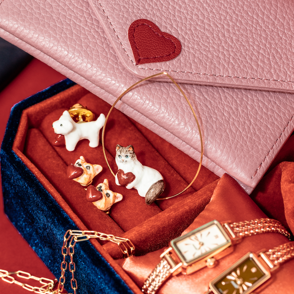 タイのアトリエで丁寧に手作業で仕上げられたアクセサリーは、ハンドクラフトならではの優しさと繊細さを放つ。犬好き、猫好き必見!NACHならではの“ハートフル・コレクション”。(ピンズ 7,150円、フープピアス 16,500円、ピアス 10,450円/NACH、カードケース 17,160円/FIORAIA、時計 各44,000円/VIDA+、ジュエリーボックス 13,200円/H.P.FRANCE)