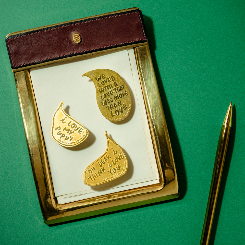 ユーモアとエモーションを織り交ぜ、“LOVE”を語る3つのブローチ。心の呟きをそのまま形にしたような小さ な吹き出しには、軽やかさと深い情感が宿る。ちょっとした茶目っ気を取り入れた、大人のための遊び心溢れるアイテム。ベストやブラウスと合わせてさりげない自己表現を楽しみたい。(ブローチ 各33,000円)