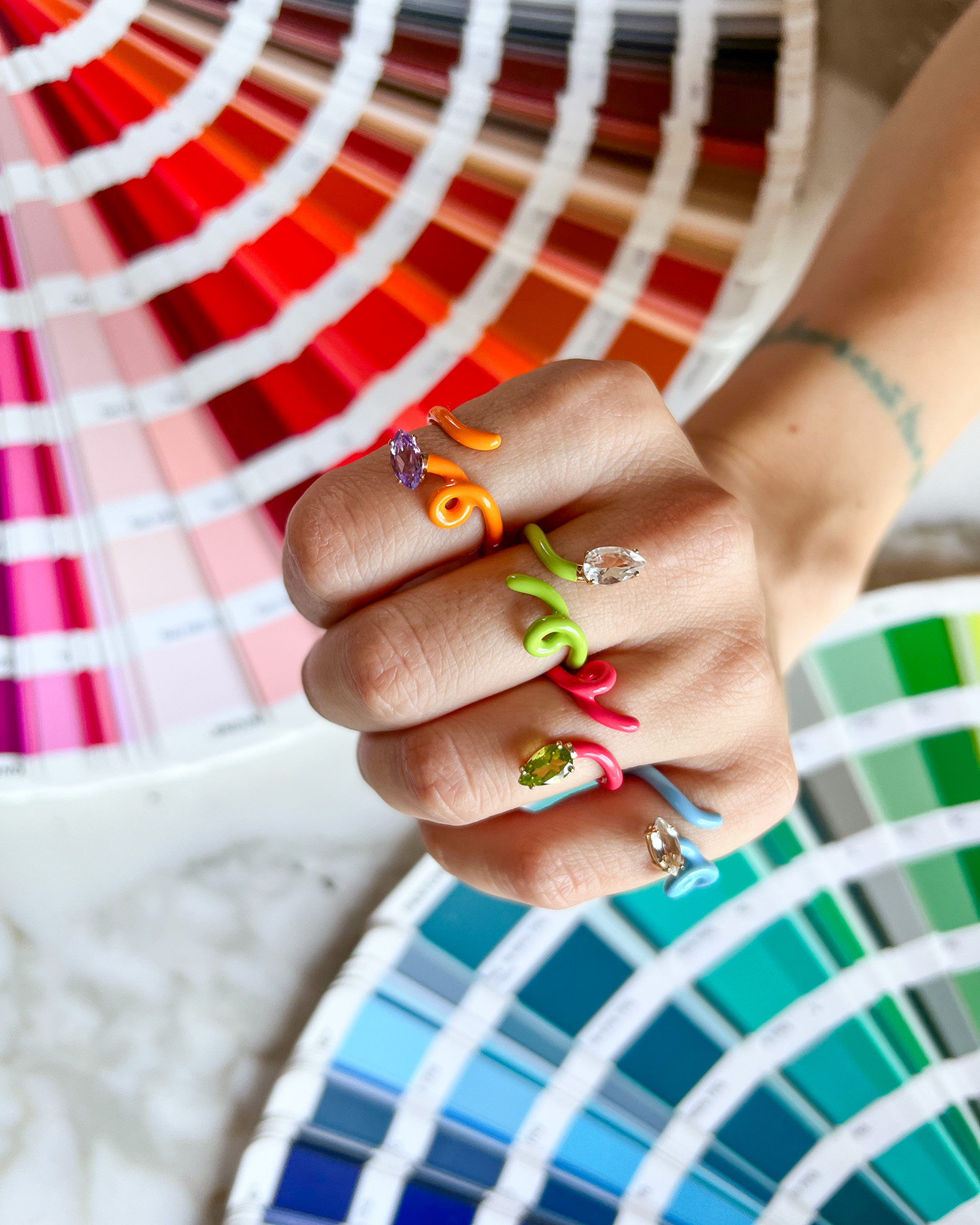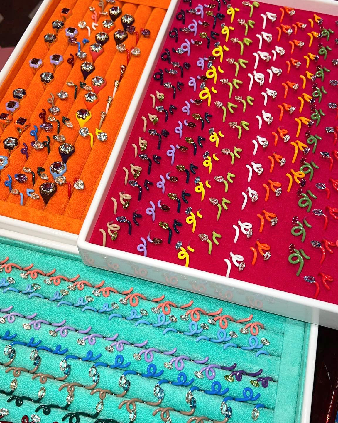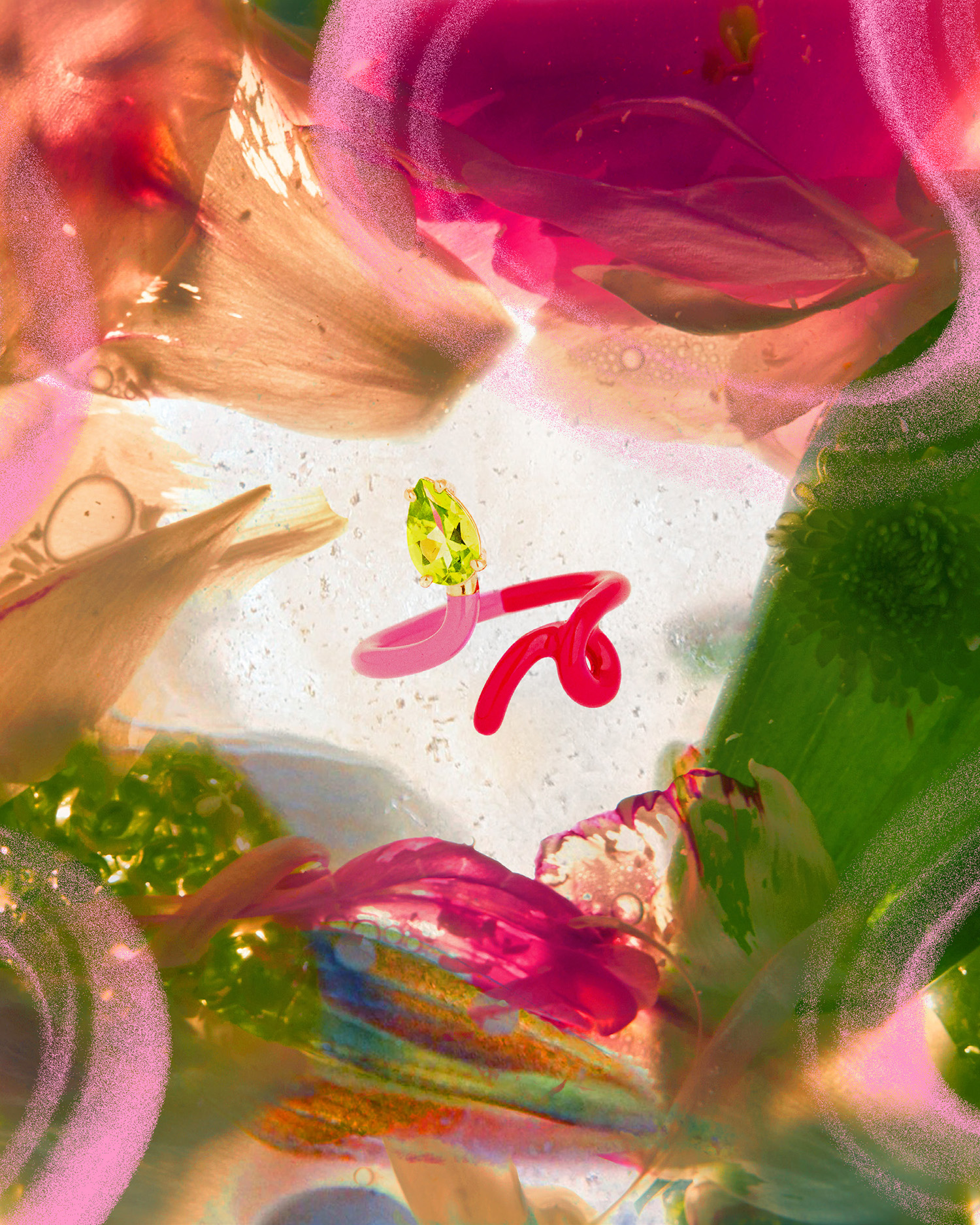 私のジュエリーを通して、「喜び」と「個性」の物語を届けたい。自由や遊び心を大切にしながら、「ファインジュエリーはもっと楽しくていい」という思いを表現したいのです。創造性と色彩、そして“違っていることの美しさ”を讃える──そんな、身につけるアートでありたいと願っています。