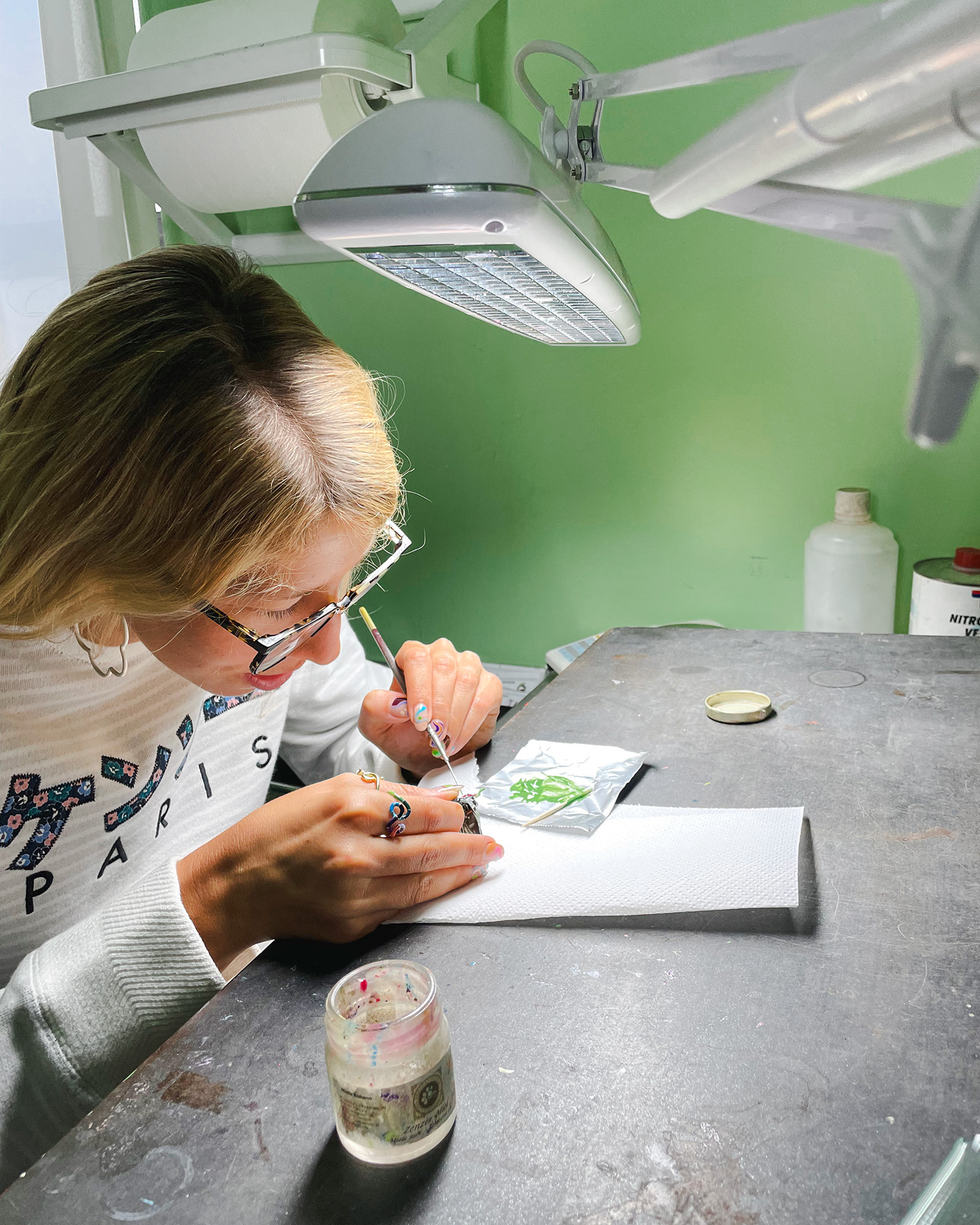 デザイナーのベア自ら、ジュエリーにペイントする様子。