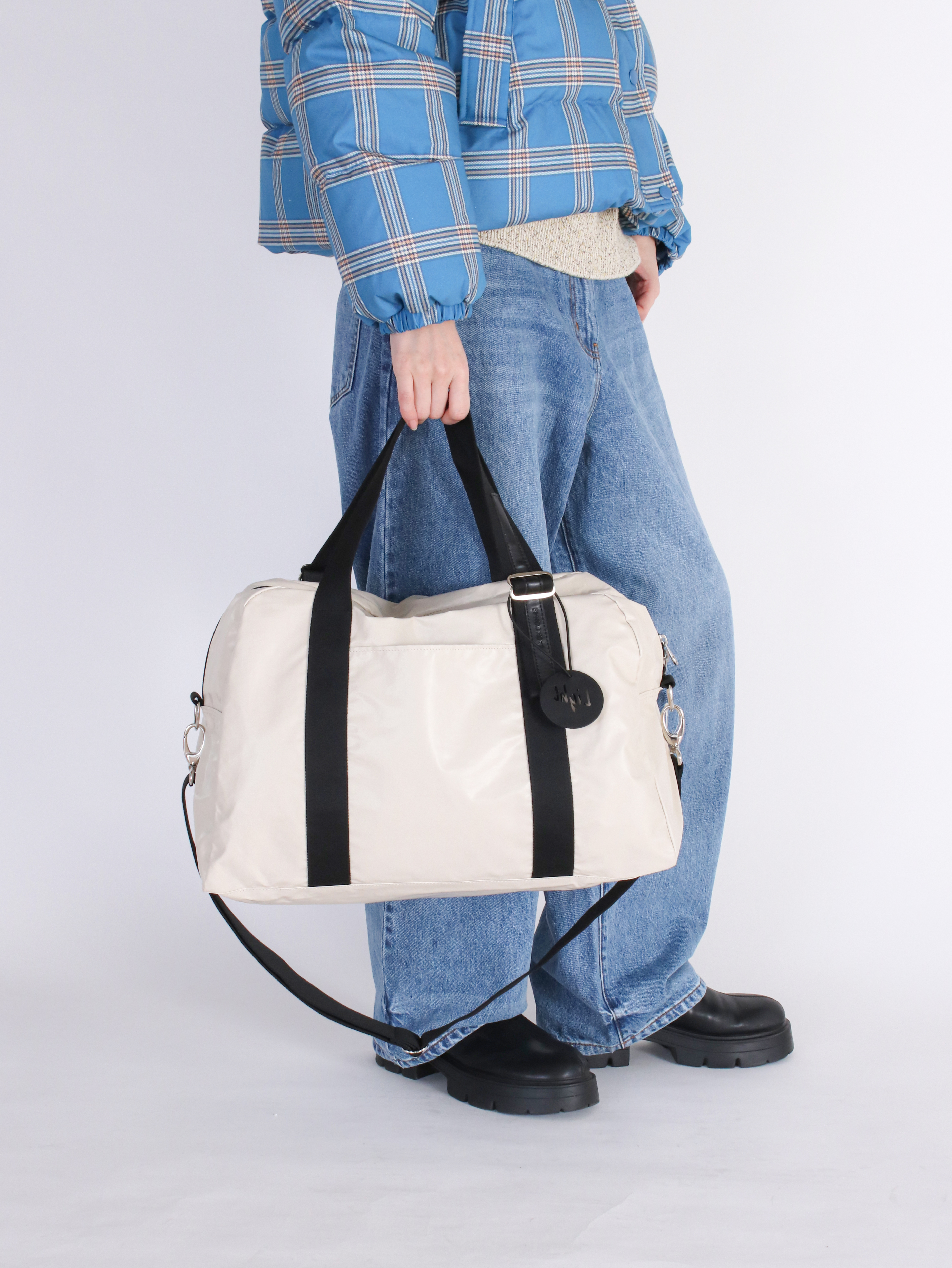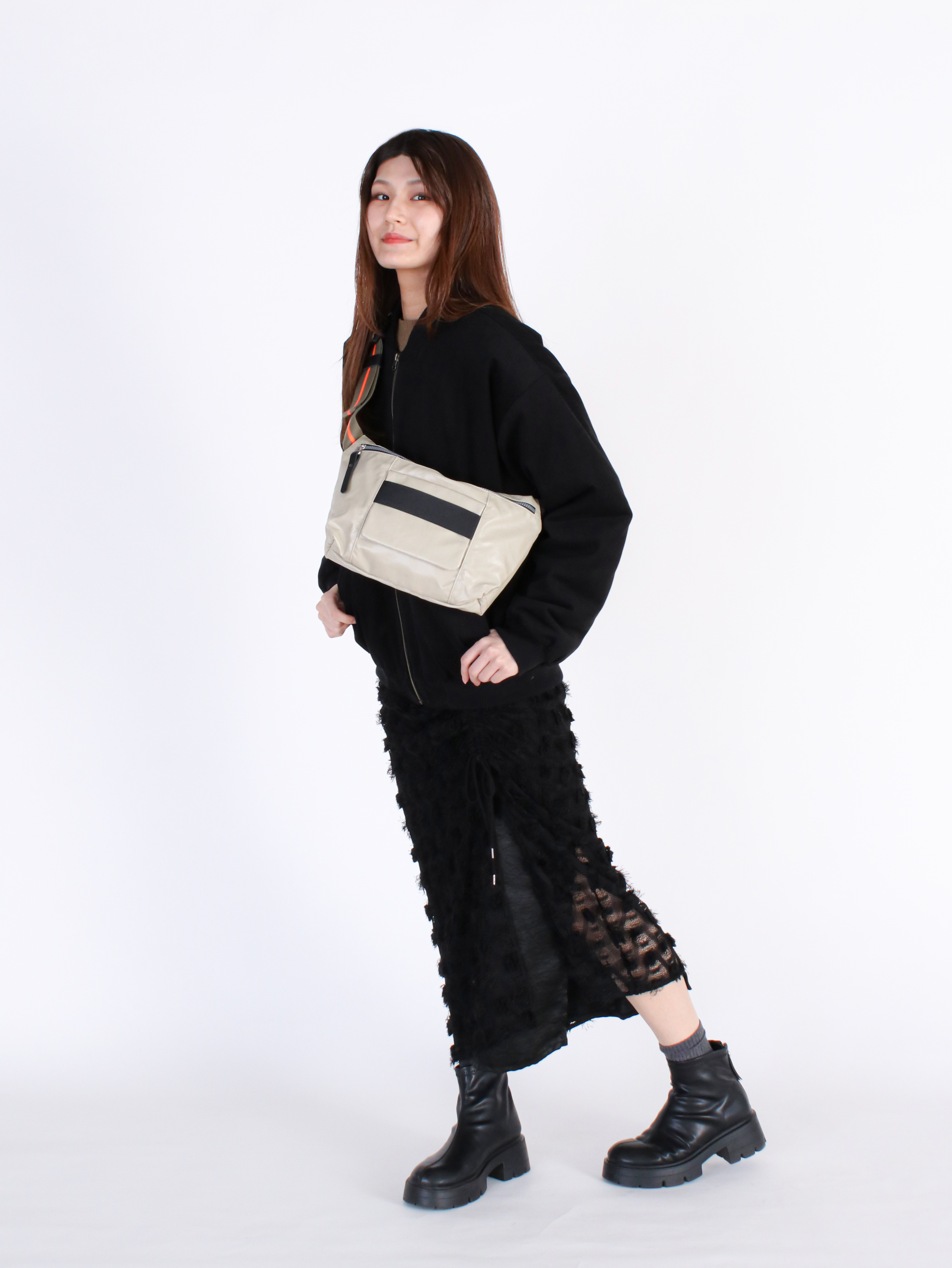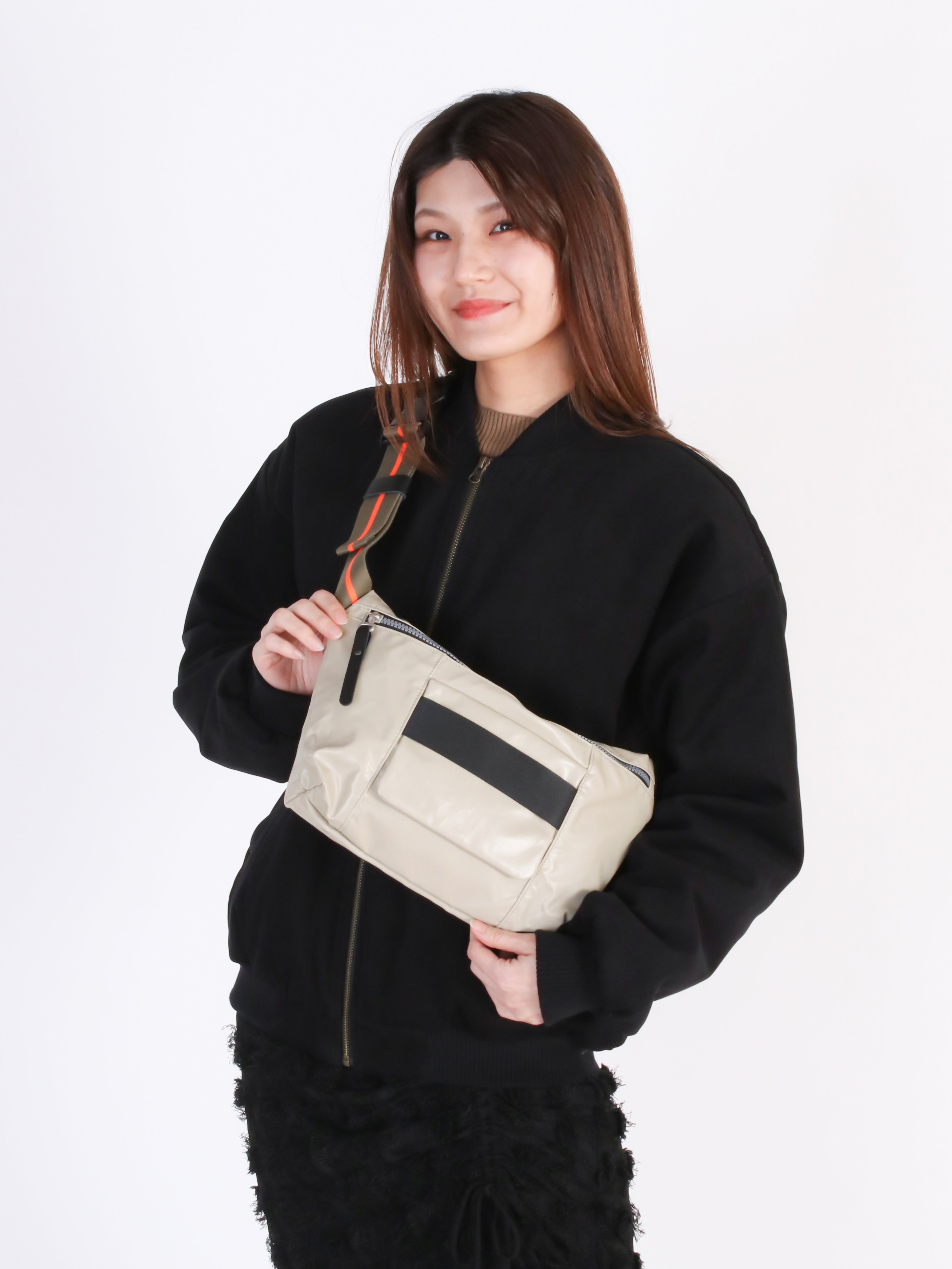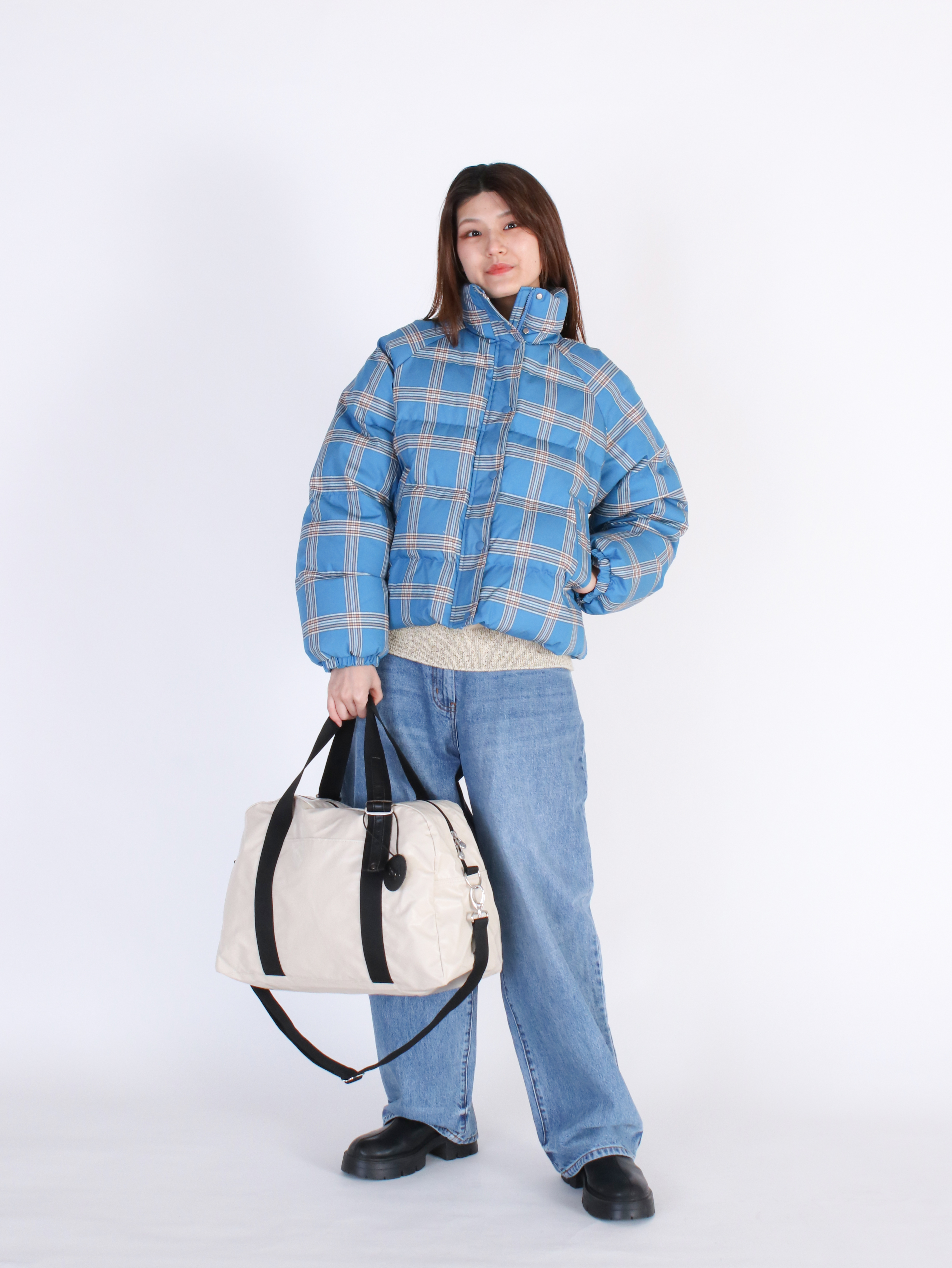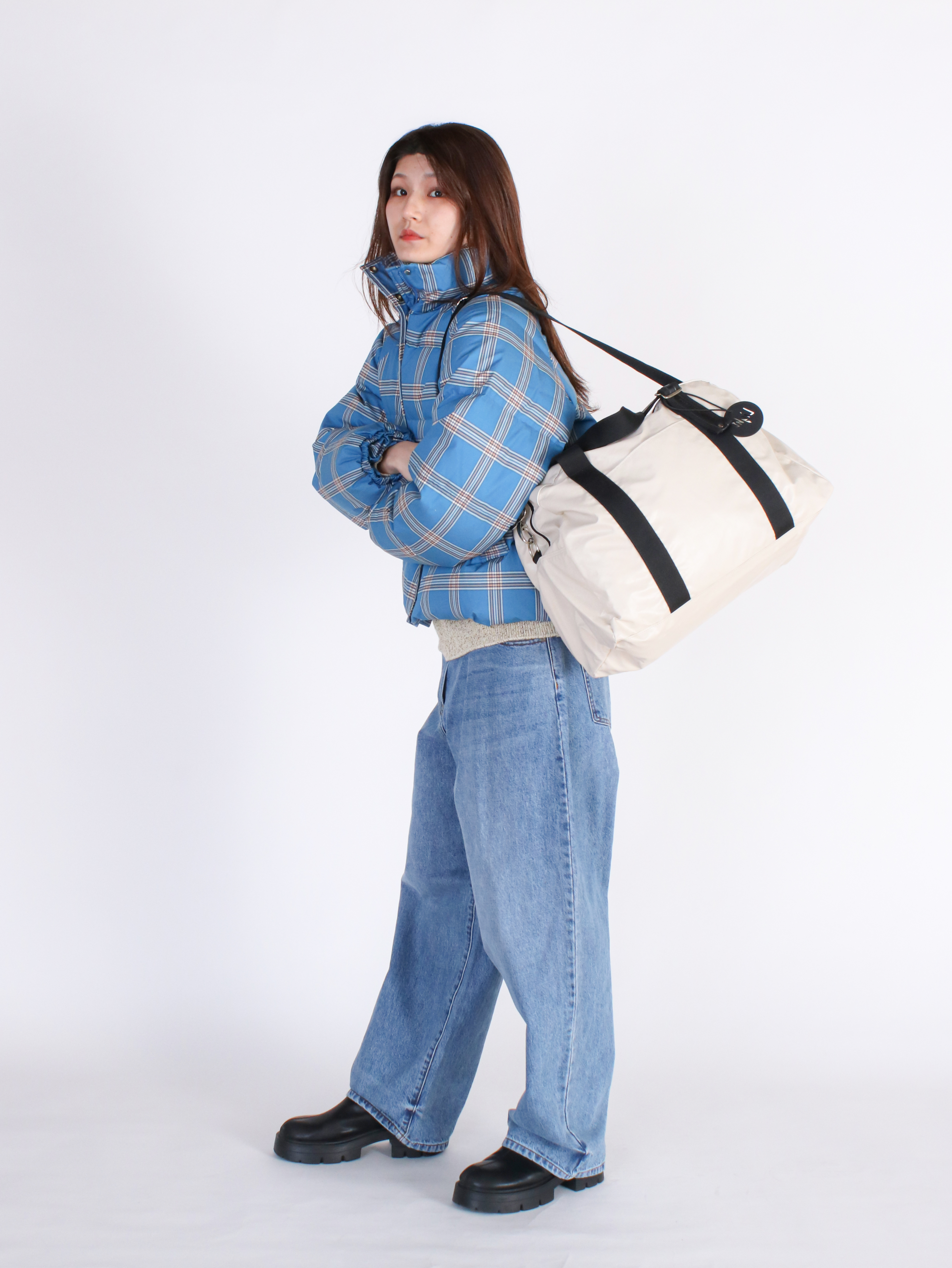 ボリュームのあるショートダウンに、手持ちWALLIのバランスが効いたタフ&ストリートのミックス。ホワイトを差すことで冬の空気に映える軽やかさが生まれ、1泊2日の旅や冬のお出かけにも頼れる収納力が魅力。大きすぎず小さすぎない絶妙サイズで、冬の“全部持ちたい日”に寄り添う万能バッグ。