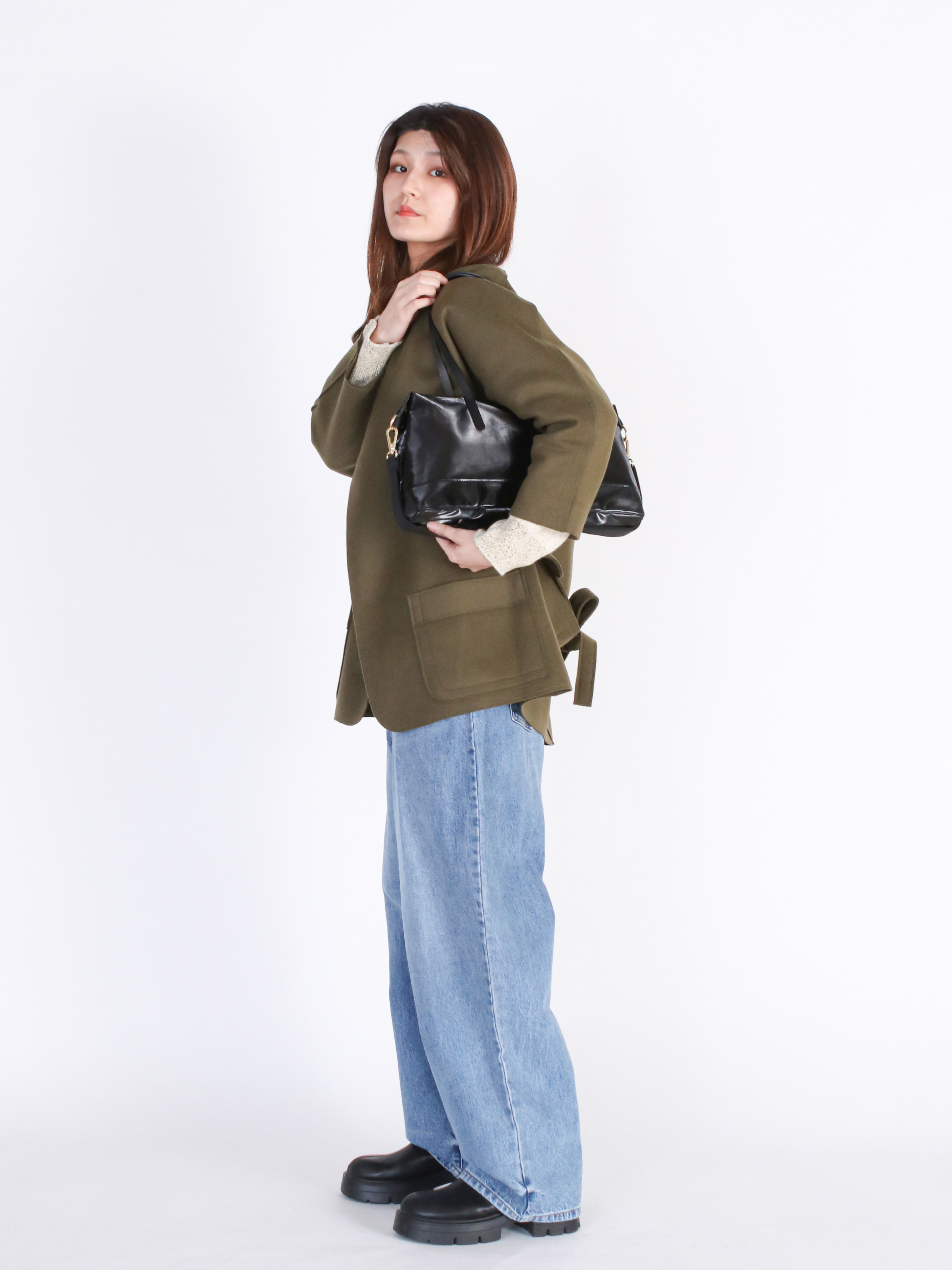 美しい光沢を宿したウールのコートに、グロッシーな質感のLEBOWLが凛とした奥行きを添える組み合わせ。カジュアルに寄りがちなカーキを、ラグジュアリーなゴールド金具が引き締め、ワンランク上の佇まいに。袖が広めのガウンシルエットでも肩掛けできる長めのハンドルが実用性とエレガンスを両立。