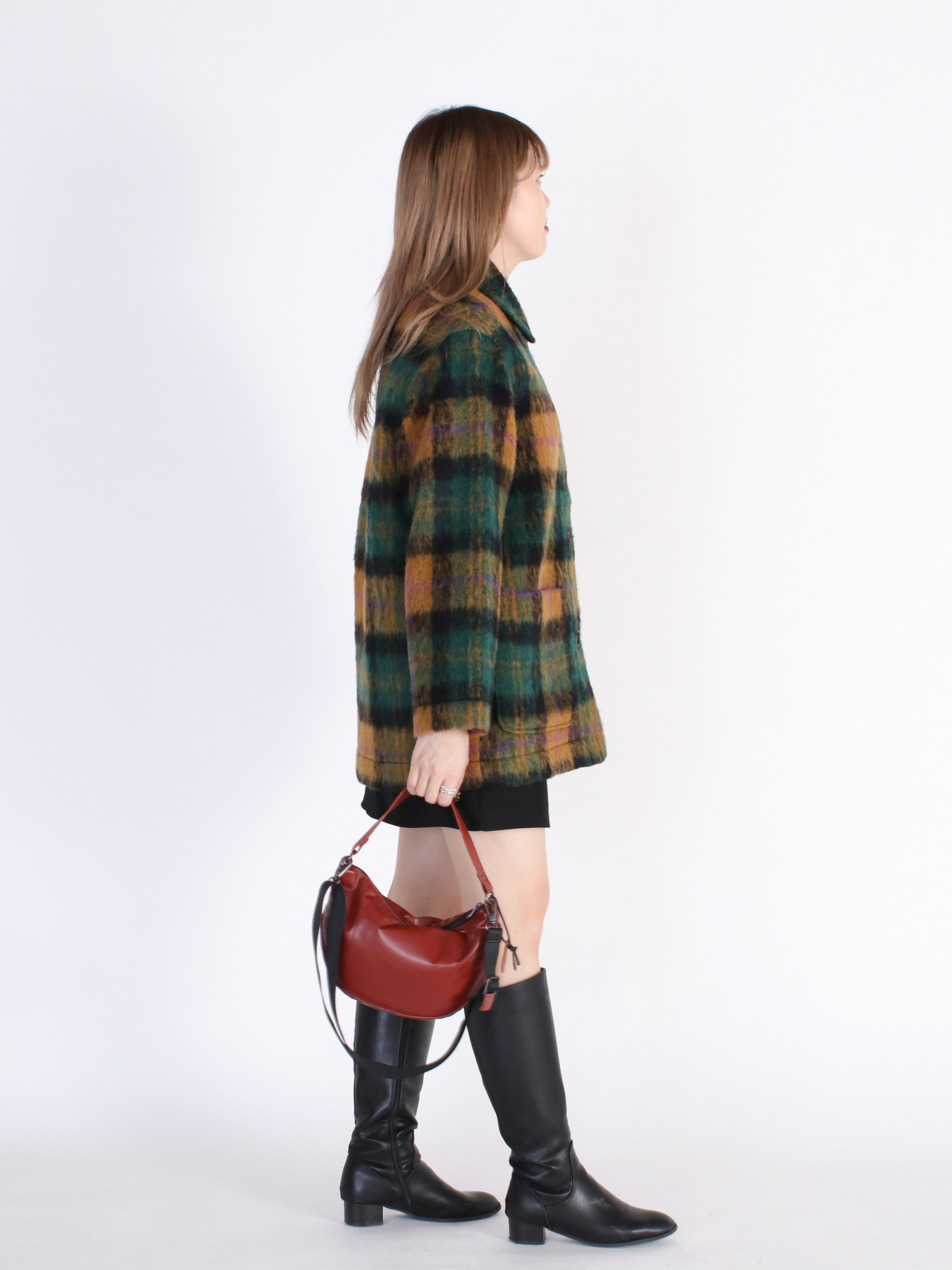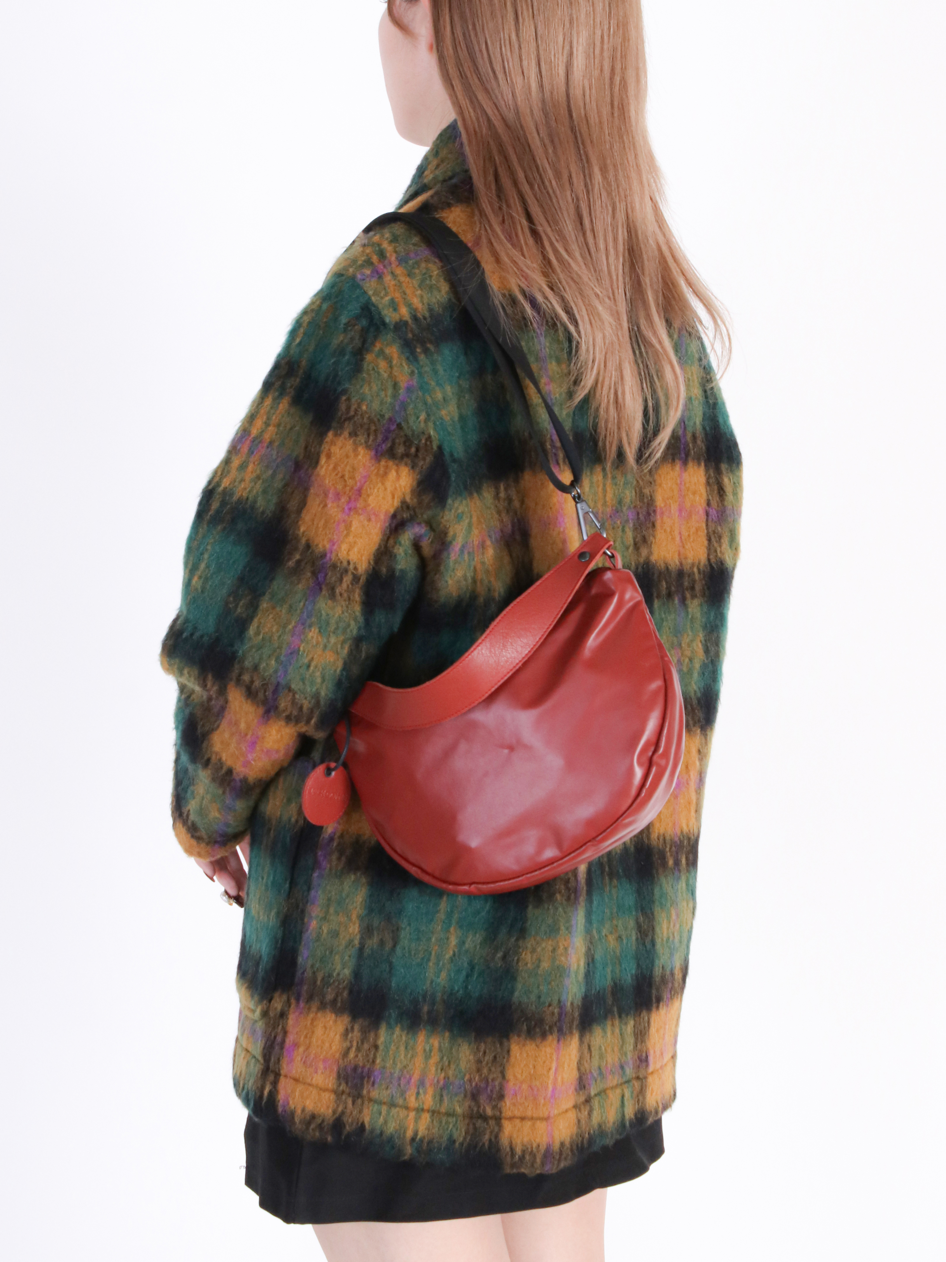 ロンドンムード漂う、レトロ&クラシカルなスタイル。毛足の長いチェックコートに、しなやかな薄革のNIKITA が生む素材のコントラストが鮮やか。チェックの色を拾ったキッチュなカラーリングが遊び心を添えつつ、レザーの持ち手がさり気なく品格をキープ。三日月型のモダンなフォルムは肩掛けでも手持ちでも美しく、フォーマルにも映える軽やかな2WAYバッグ。