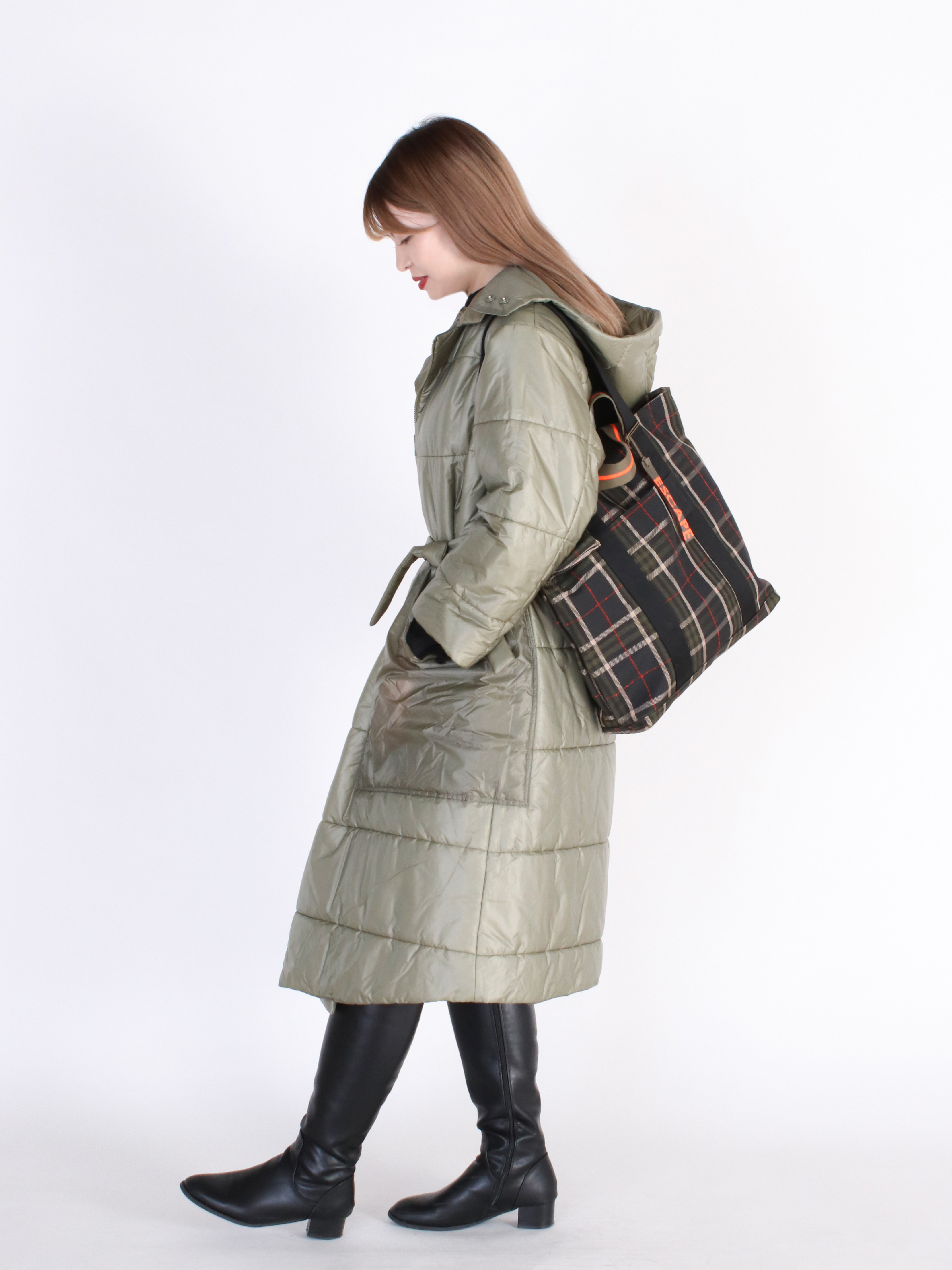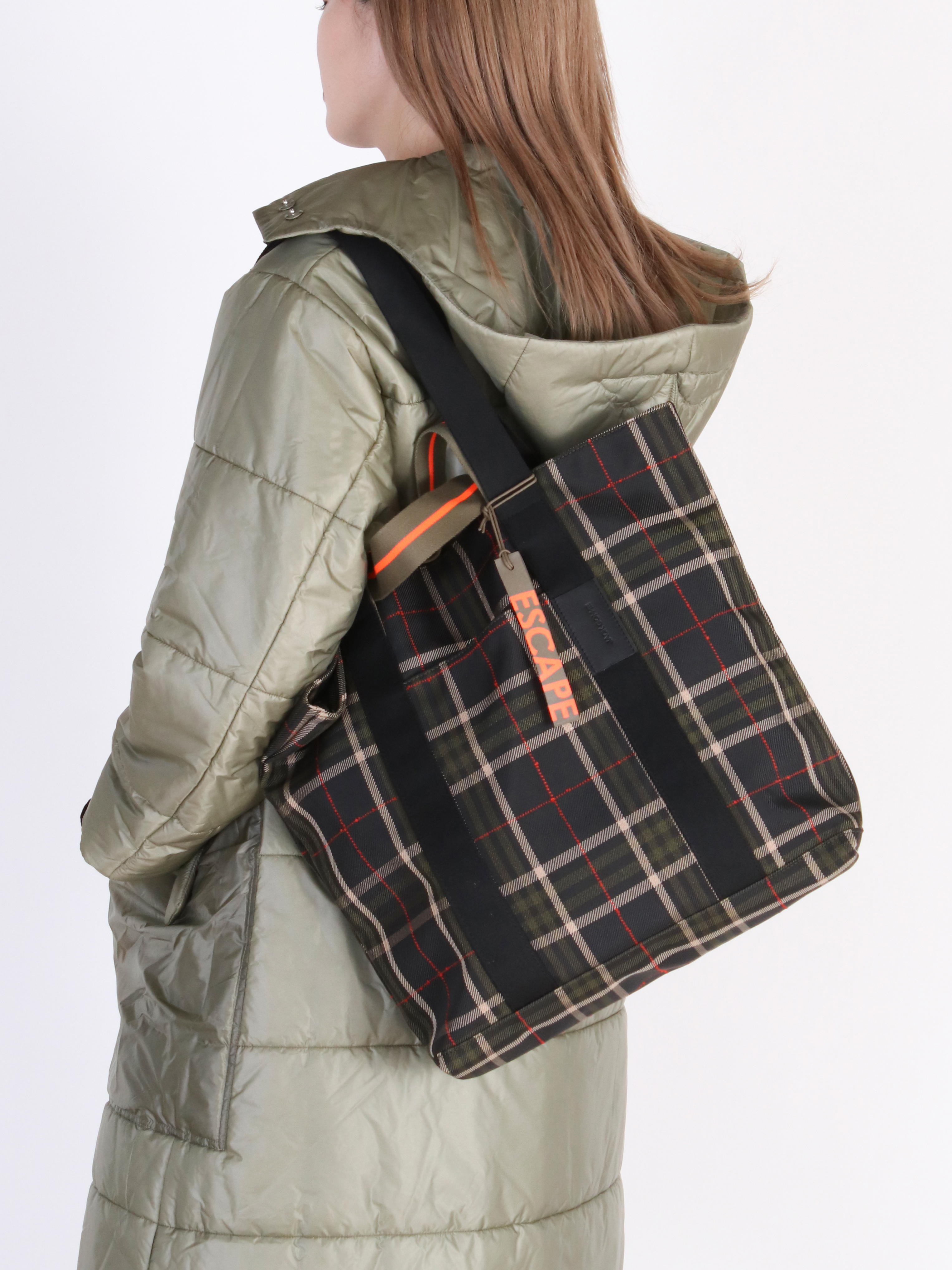 無地のスタイルに品よく溶け込む、トラッドなタータンのアクセント。光沢を抑えたESCAPE TARTANは、デイリーの装いに自然と馴染み、渋みのある色合いが冬のスタイルを静かに格上げ。フェミニンなパデッドコートに“辛さ”をひとさじ加える効果も。持ち手は2WAYで、ボリュームアウターには長い持ち手を肩に掛けるバランスがベスト。