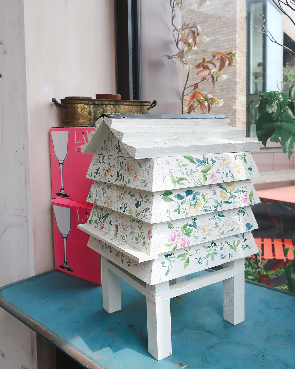 屋上のミニガーデン、生き物や植物のオブジェやアンティーク小物などで満たされた、温かな空間だ。