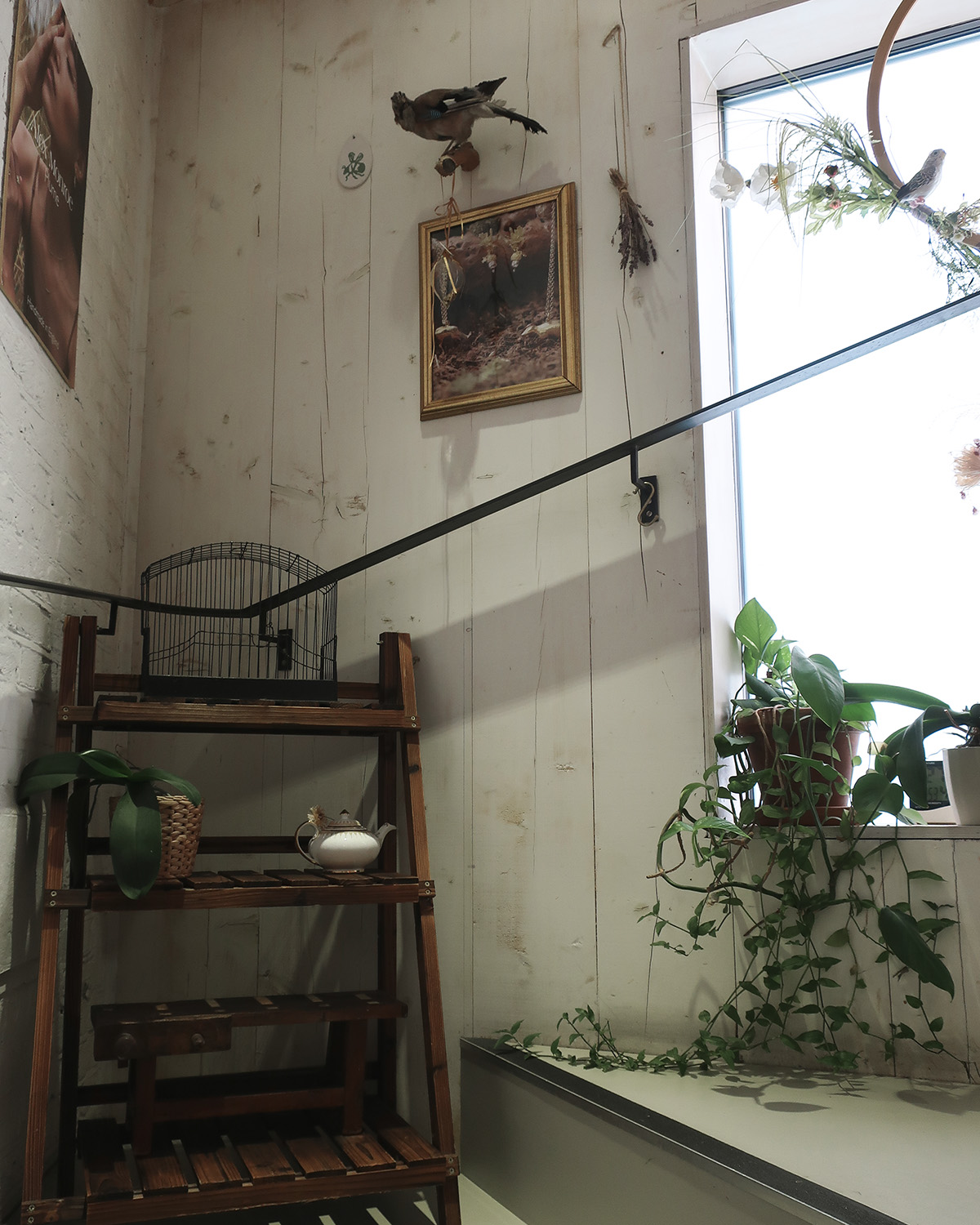 建物内の至る所に植物やオブジェがディスプレイされている。