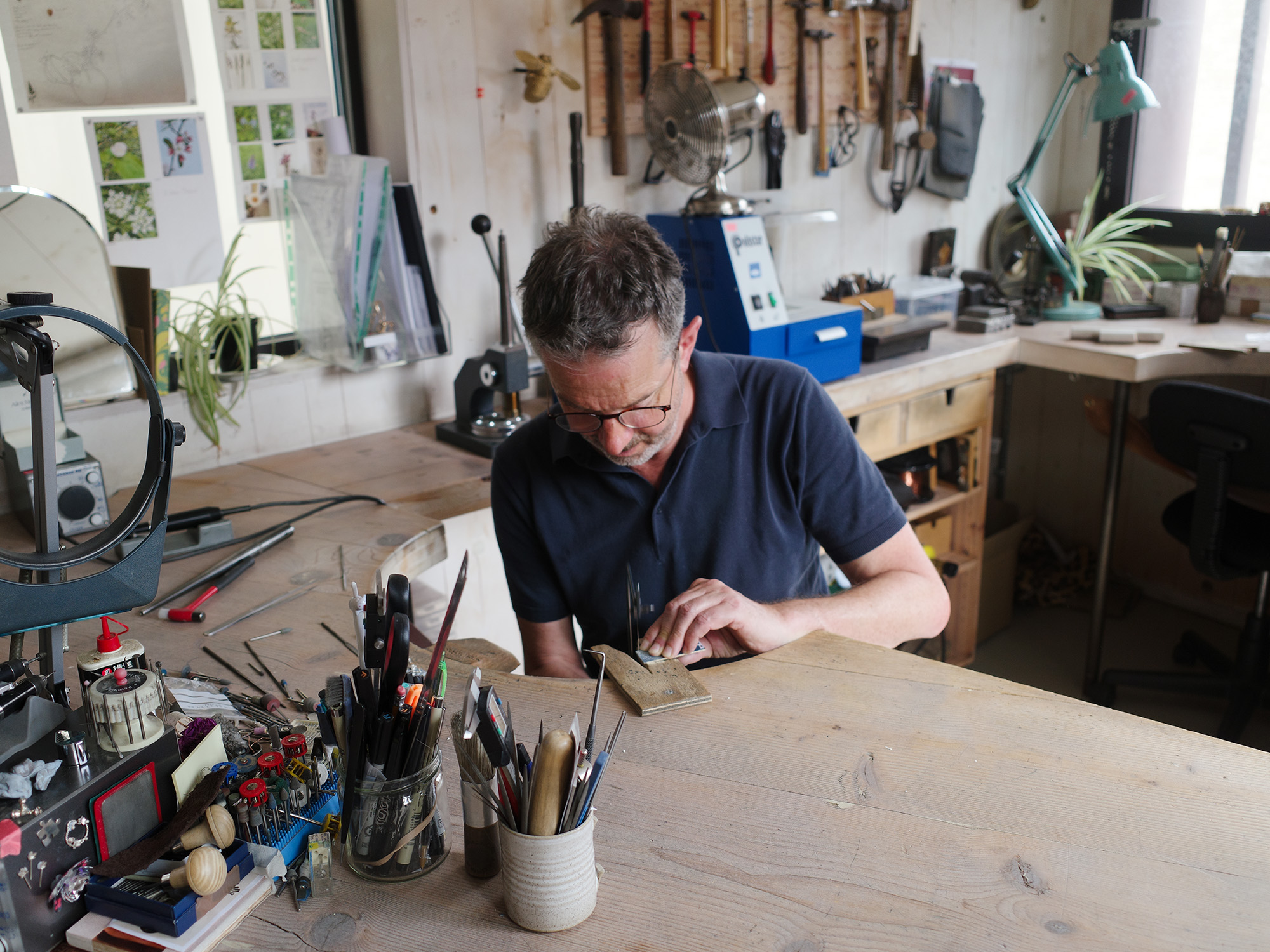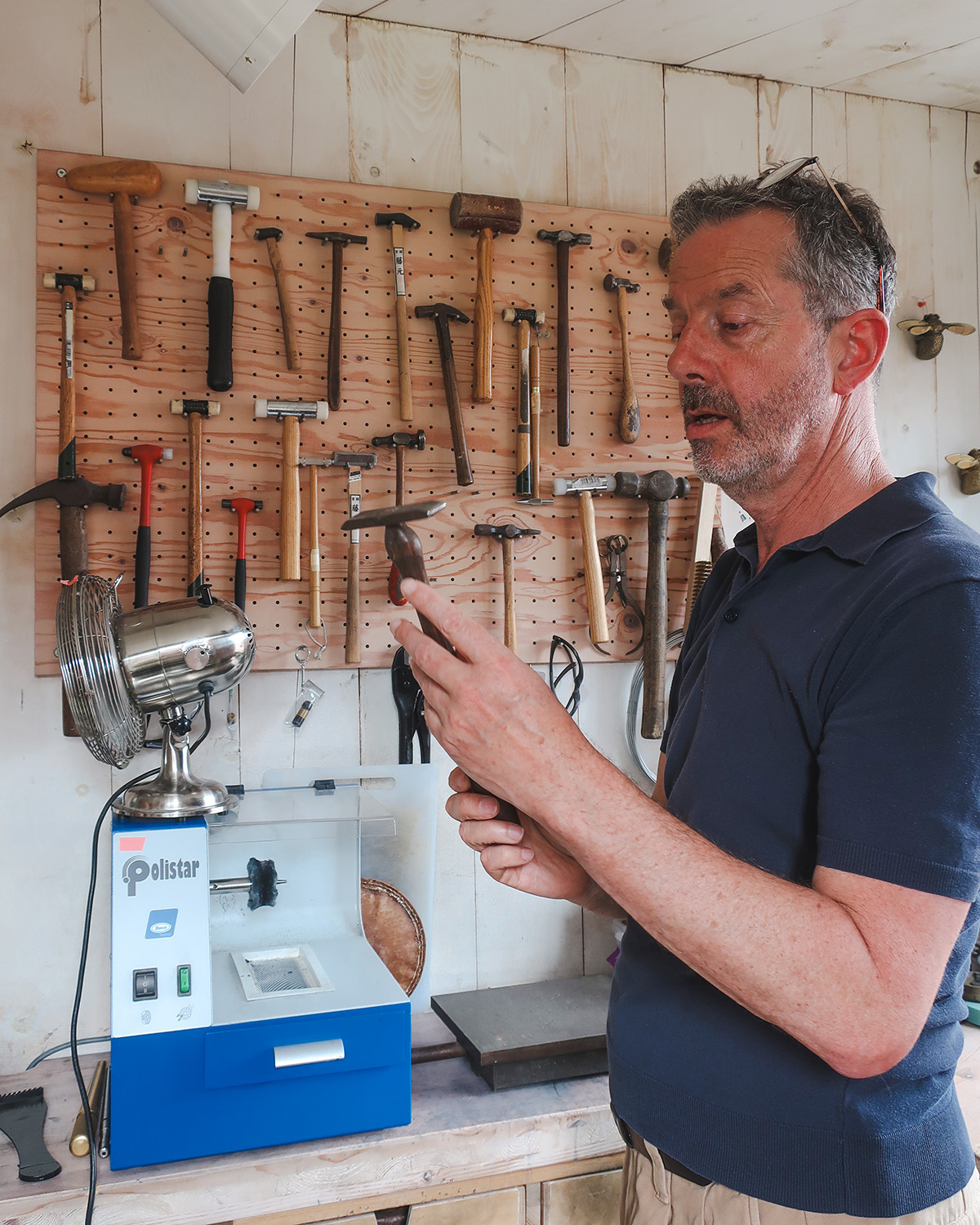 お気に入りの道具は日本製ハンマー。イメージ通りのテクスチャーをつけるため、自ら金属で工具を作ることもあるそう。